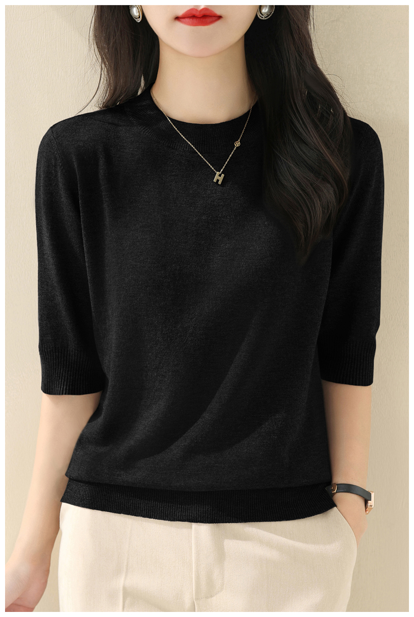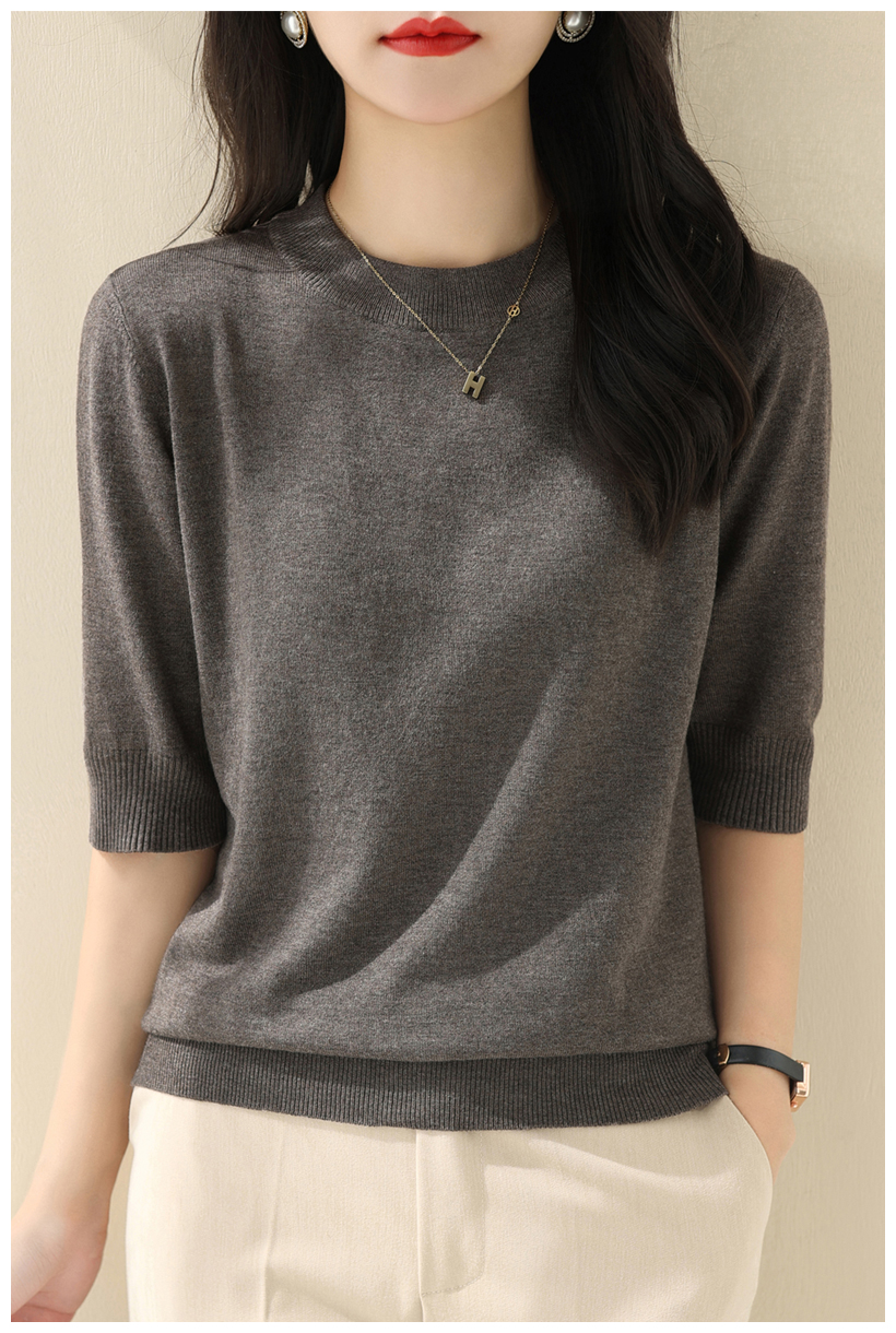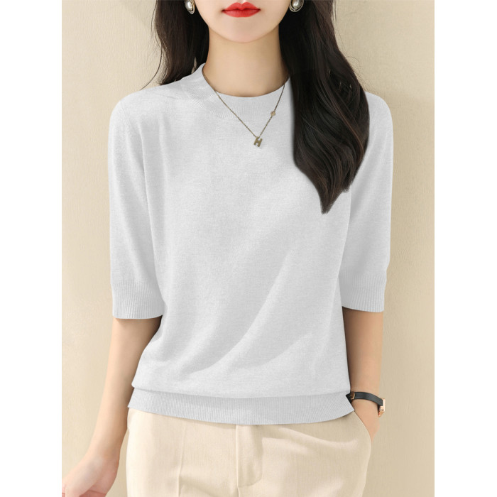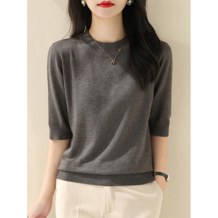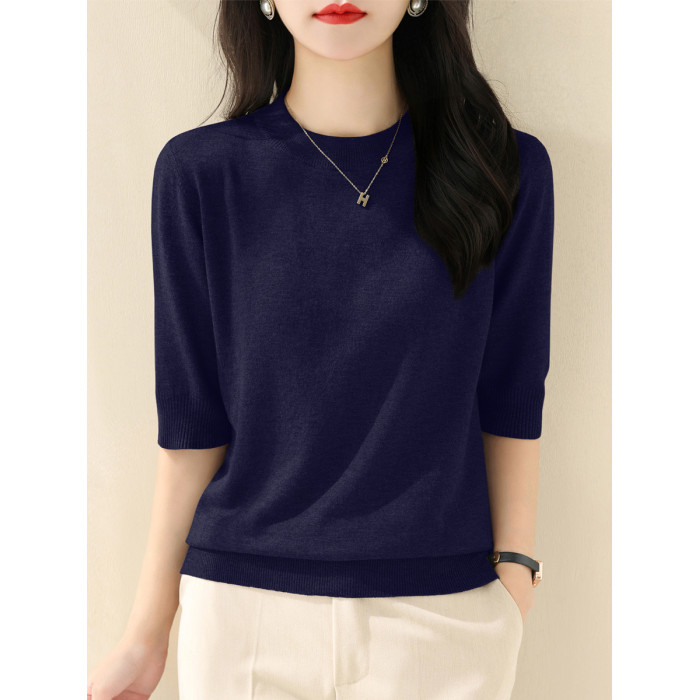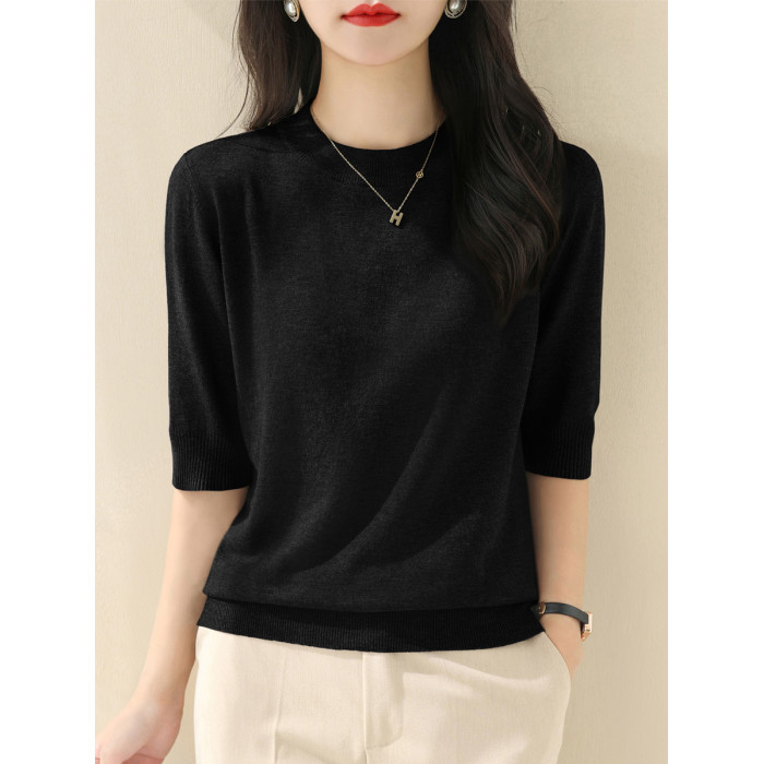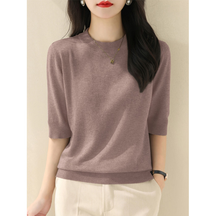 春季新款圓領五分袖針織衫女純色套頭寬松顯瘦上衣韓版簡約打底衫