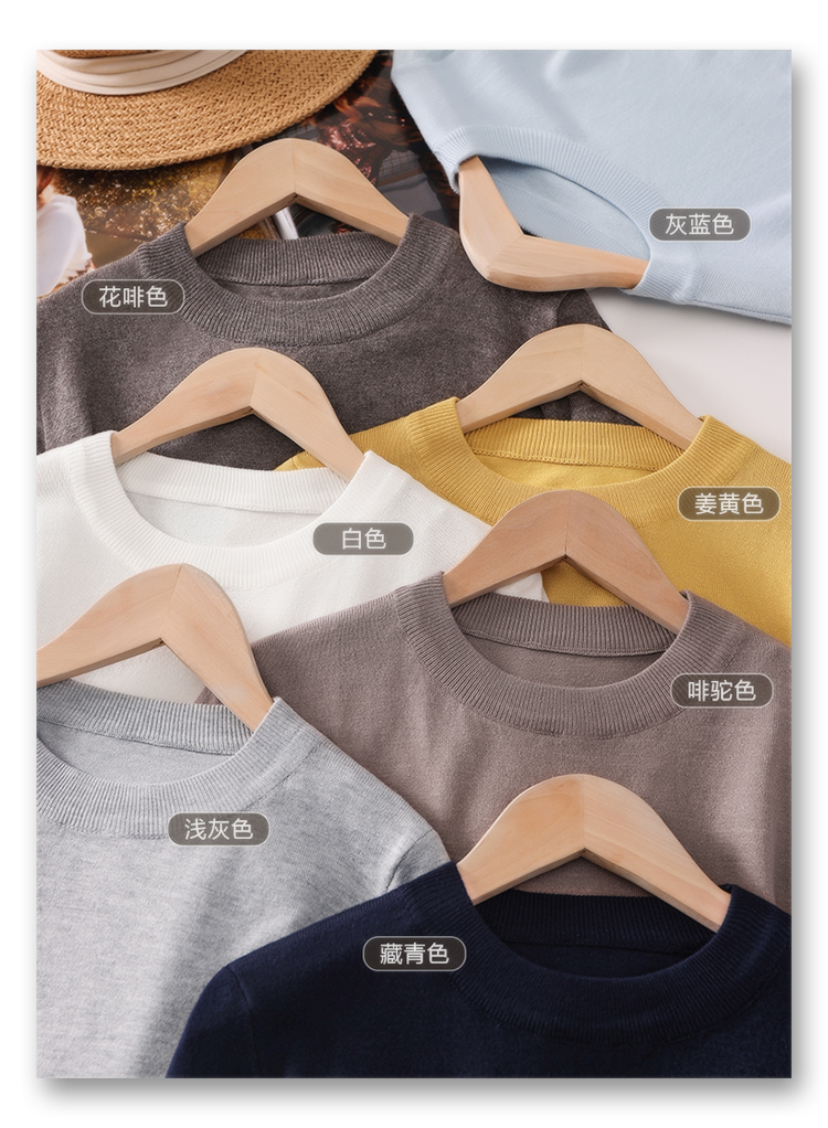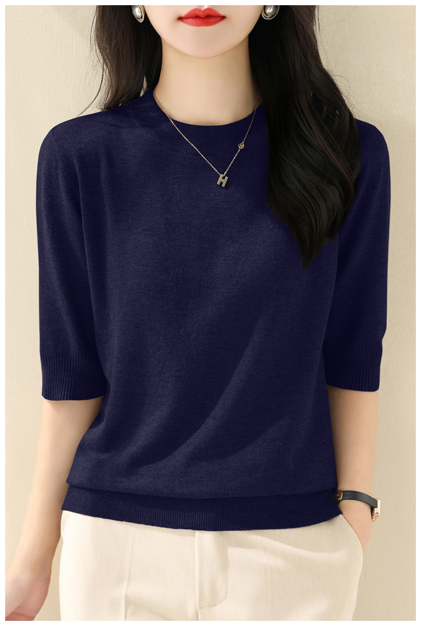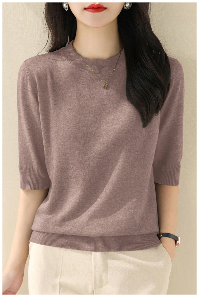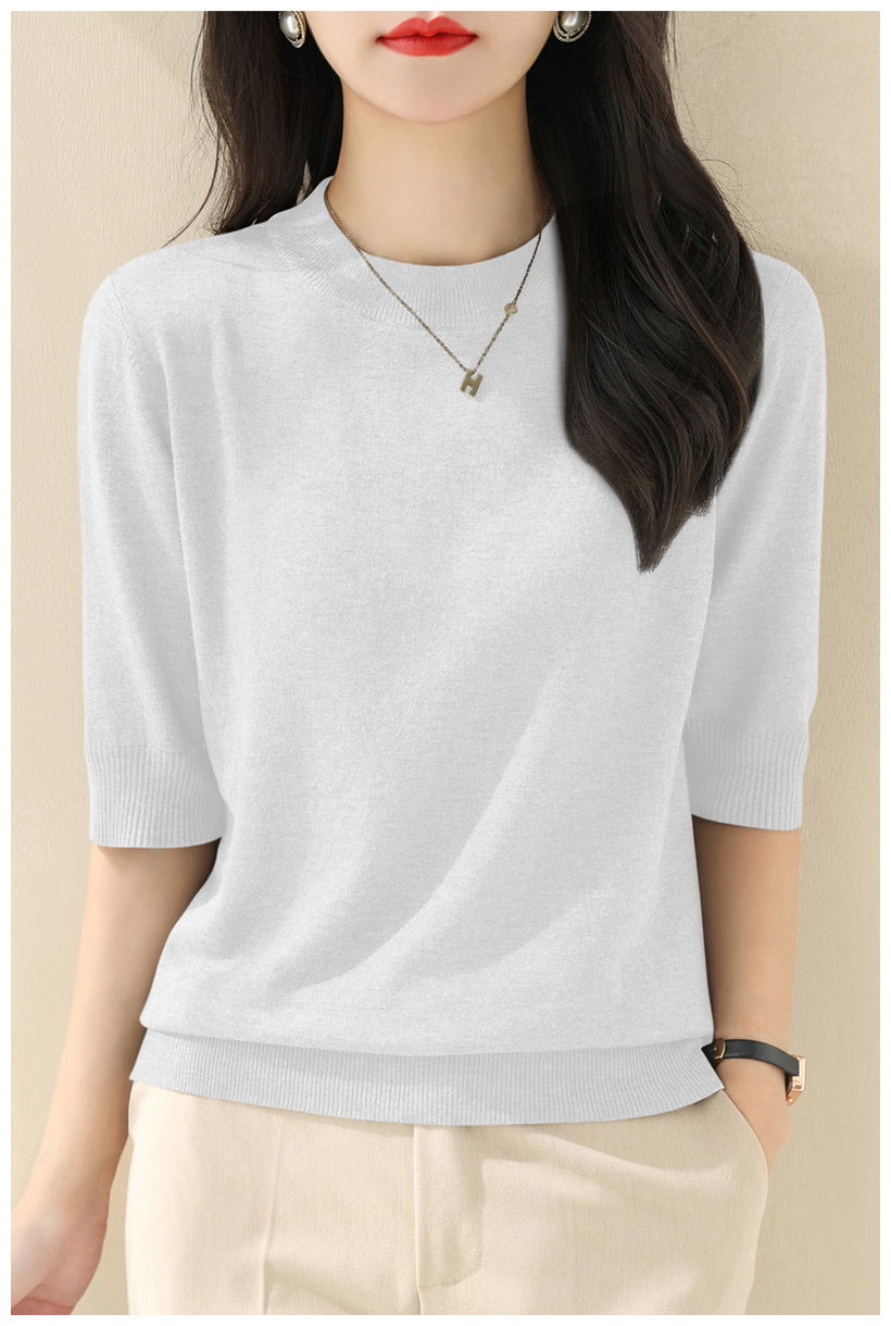 春季新款圓領五分袖針織衫女純色套頭寬松顯瘦上衣韓版簡約打底衫
