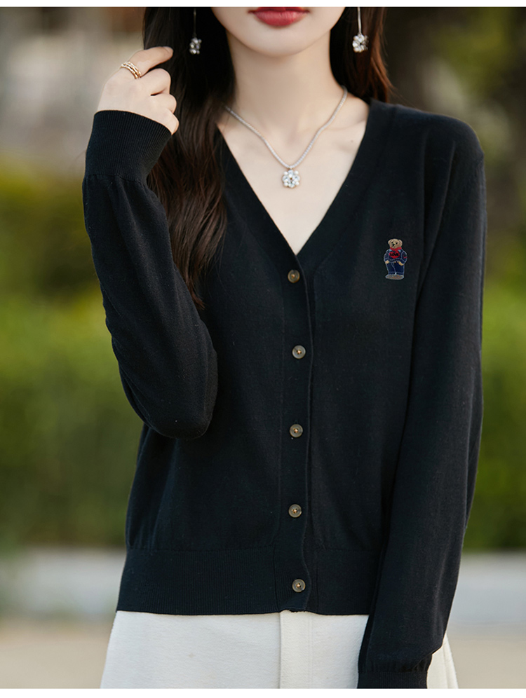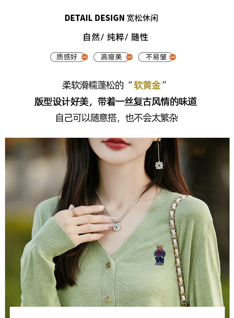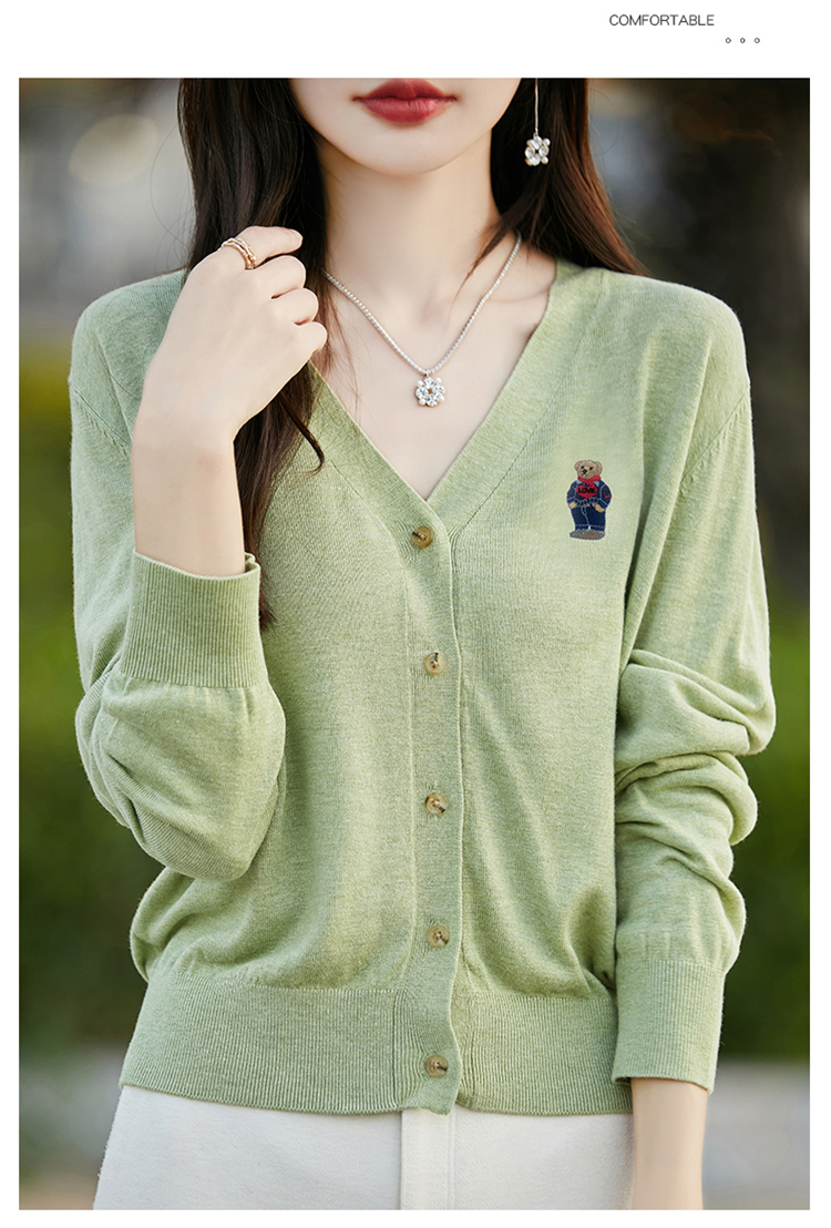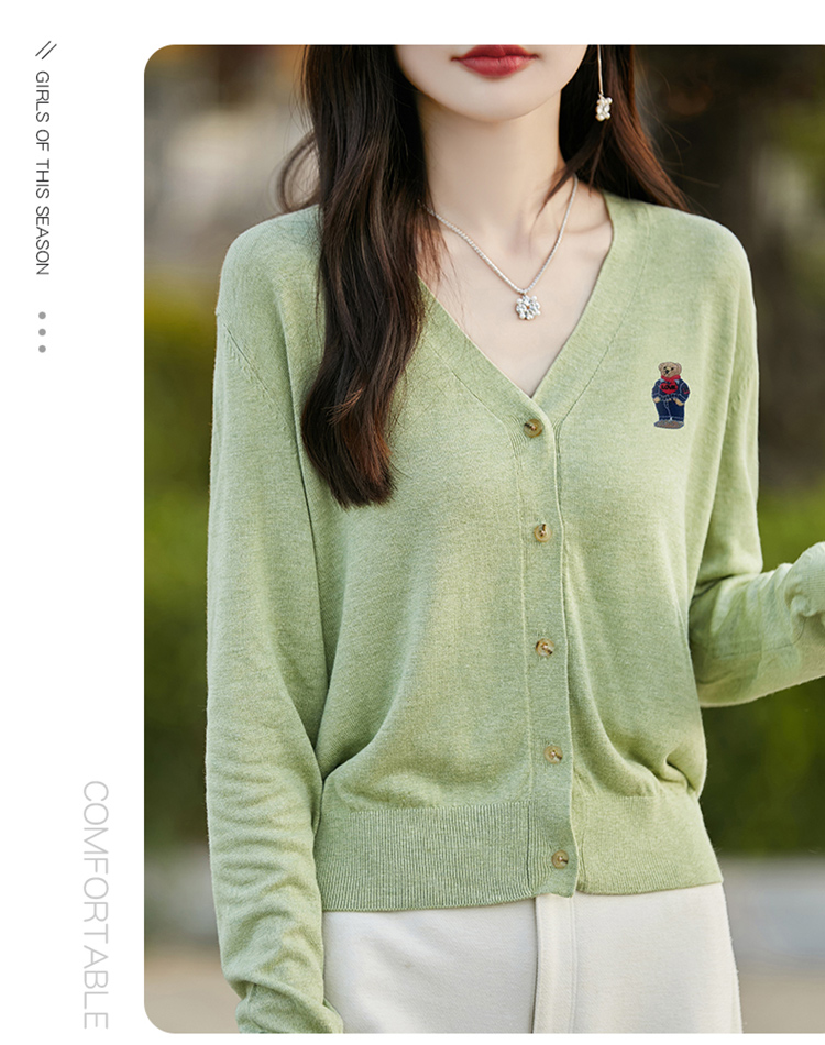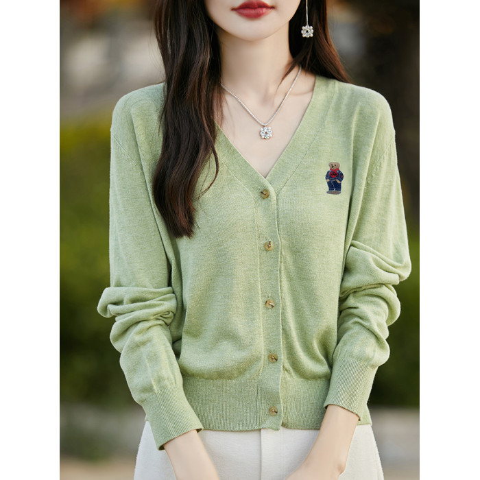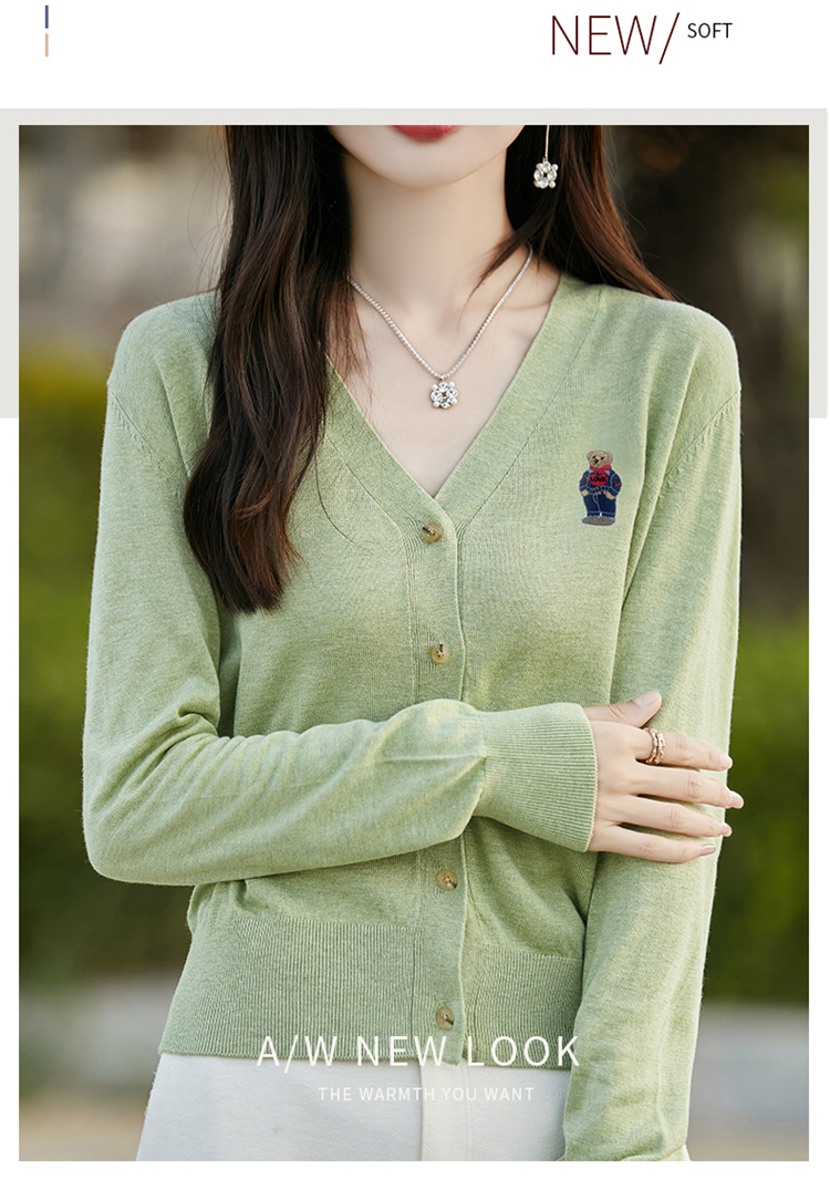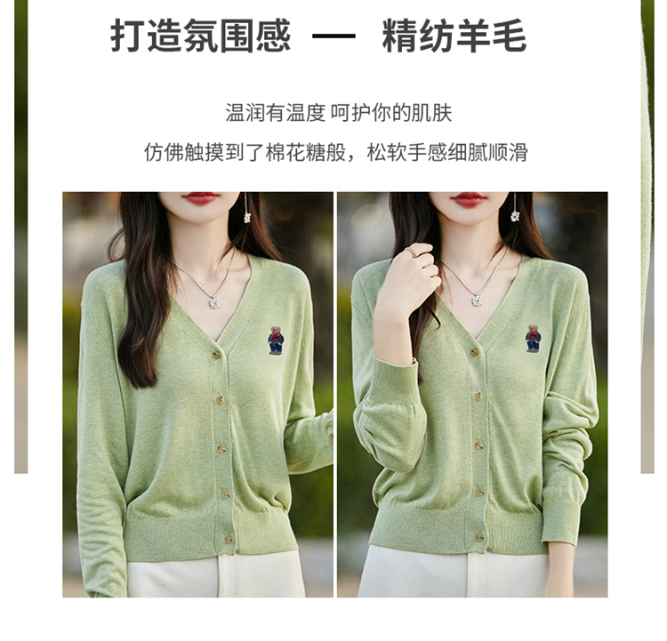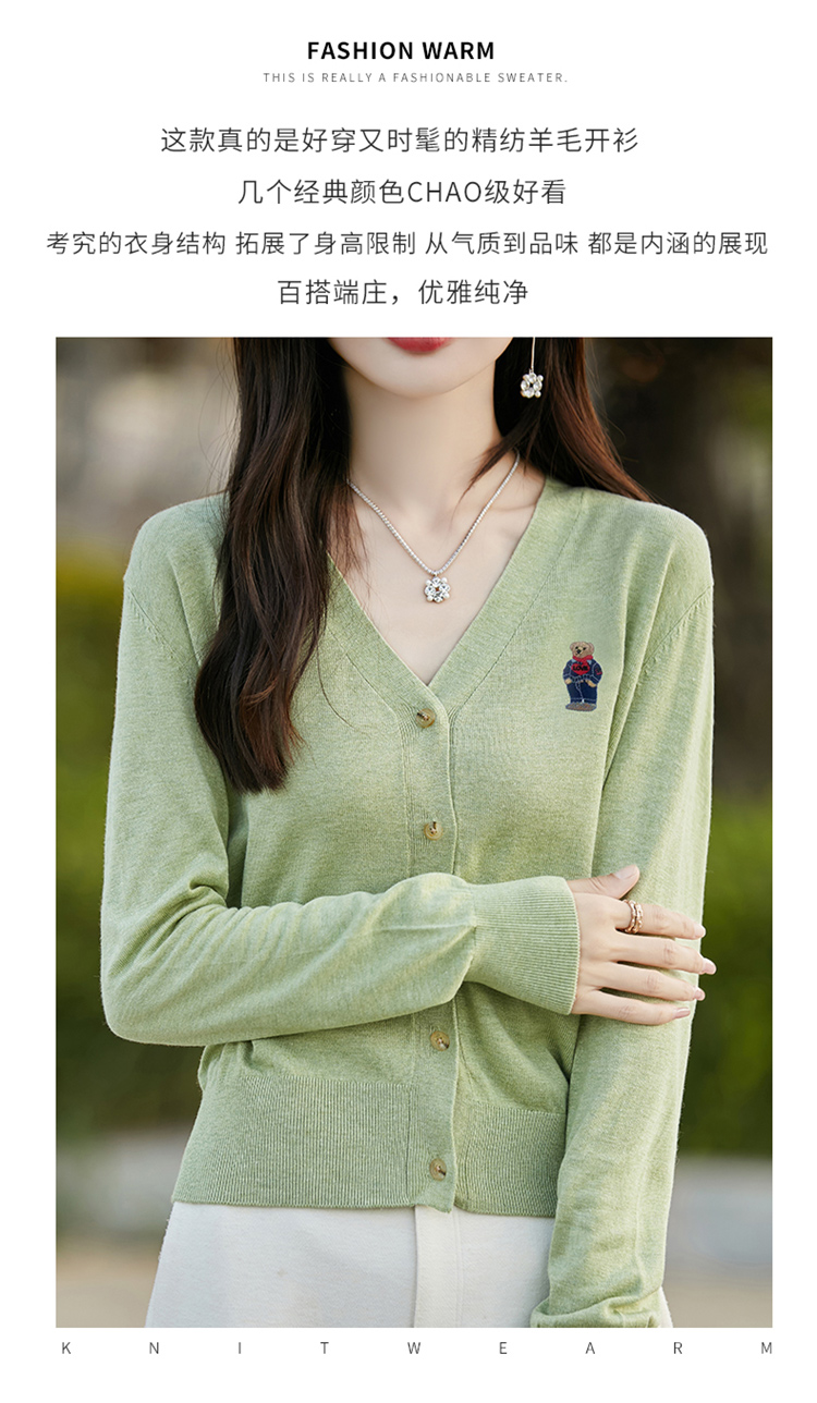 刺綉V領針織開衫女新款羊毛打底衫內搭薄款綠色毛衣外套短款上衣
