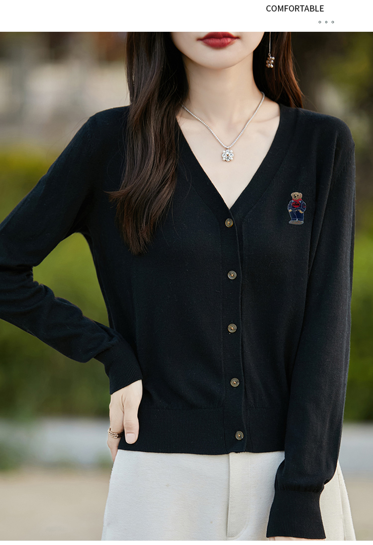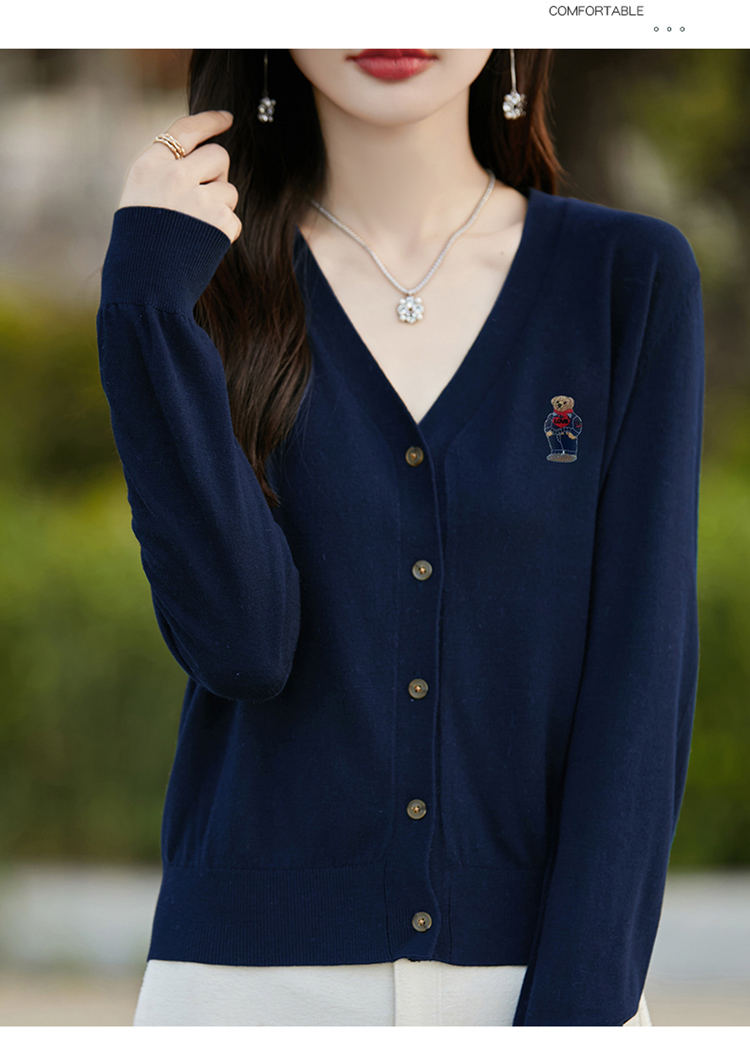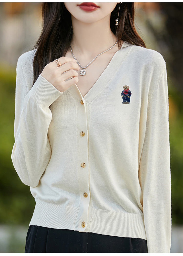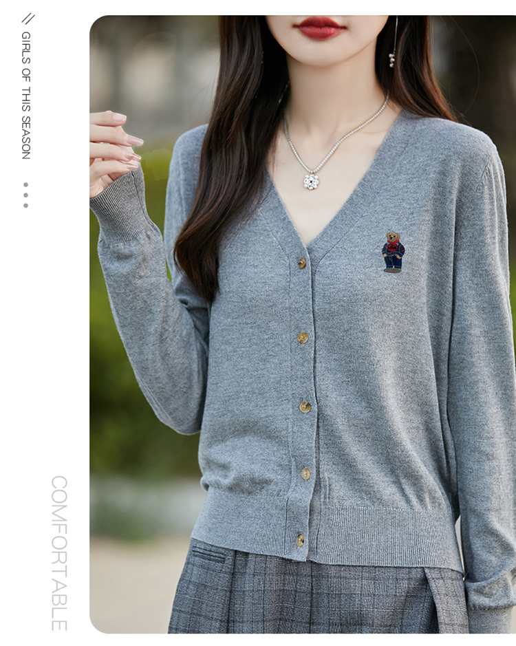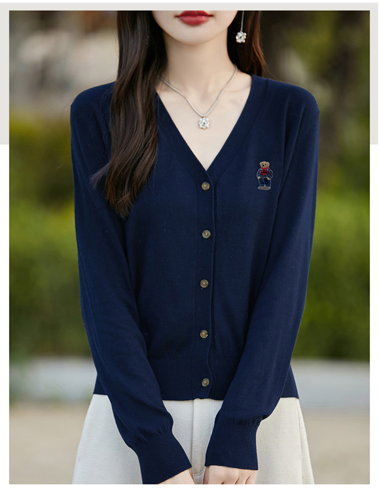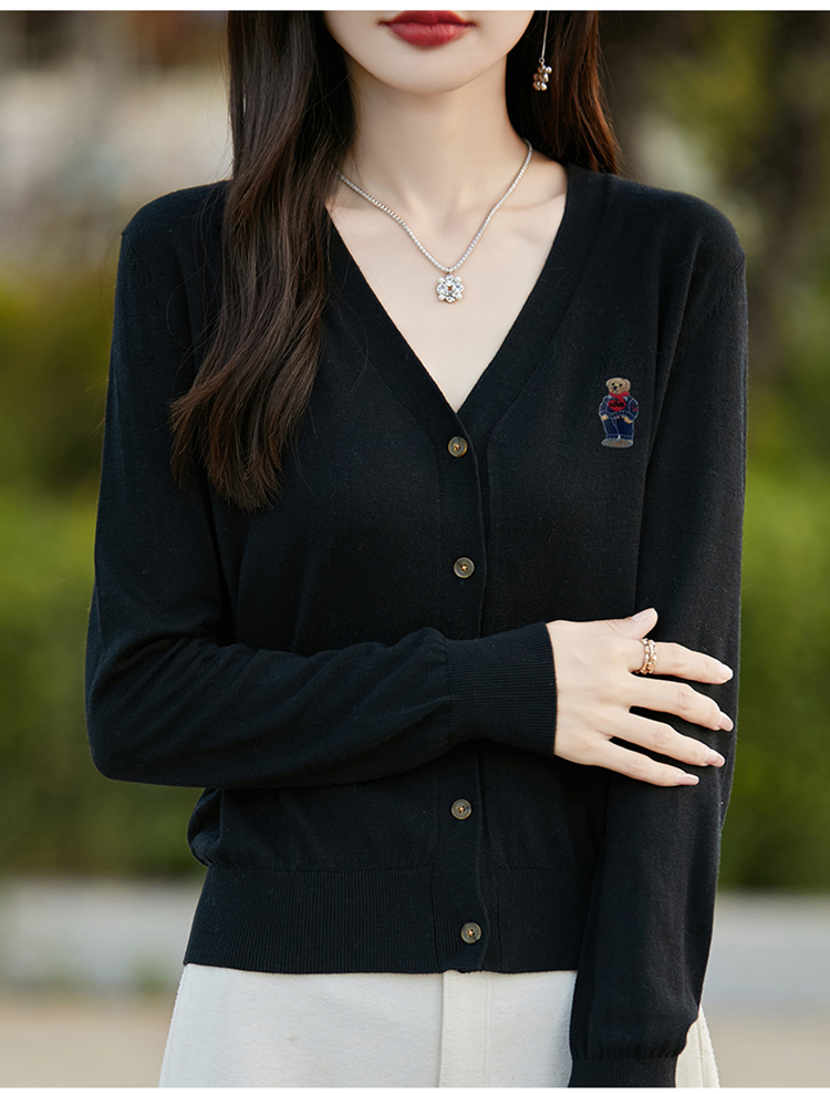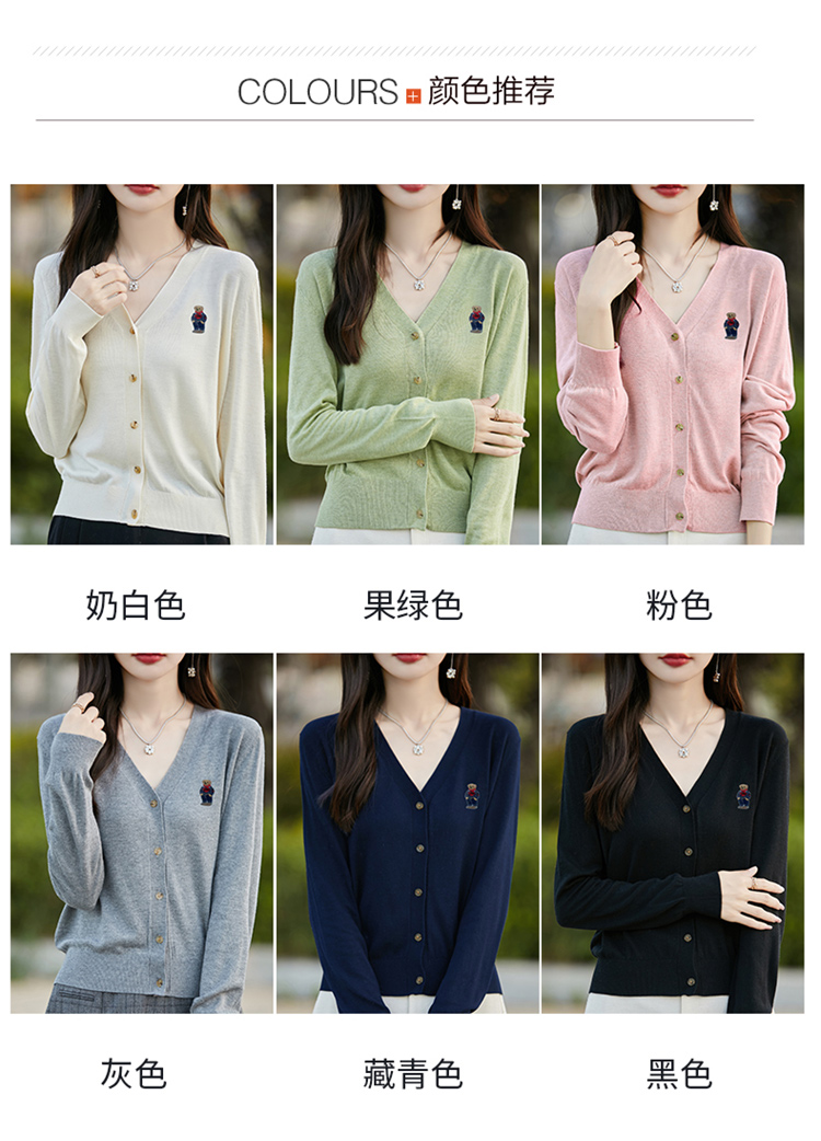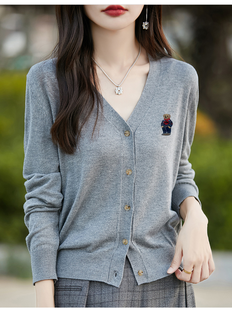 刺綉V領針織開衫女新款羊毛打底衫內搭薄款綠色毛衣外套短款上衣
