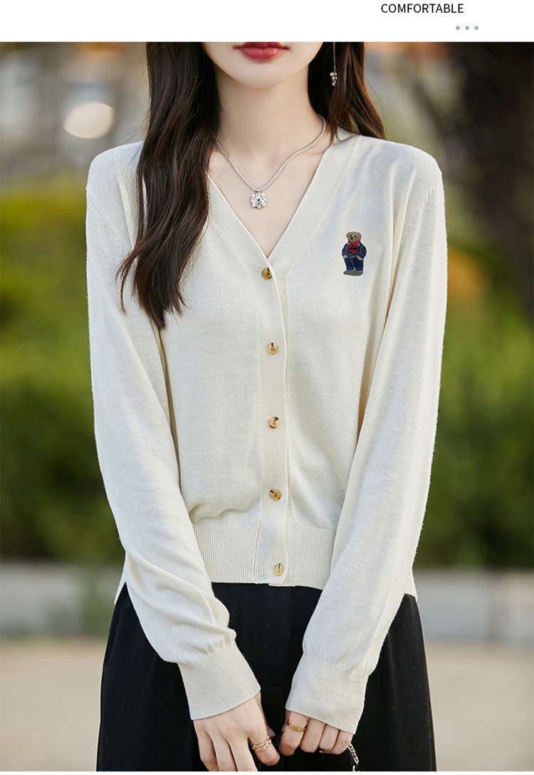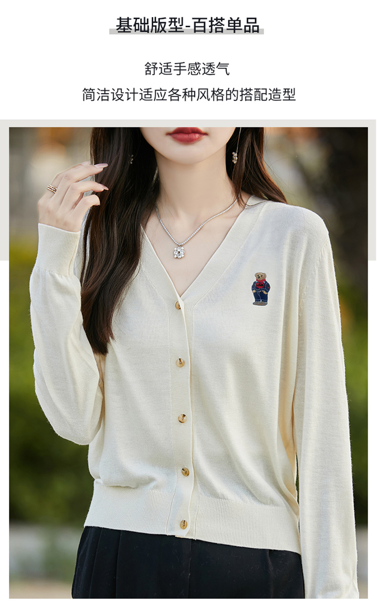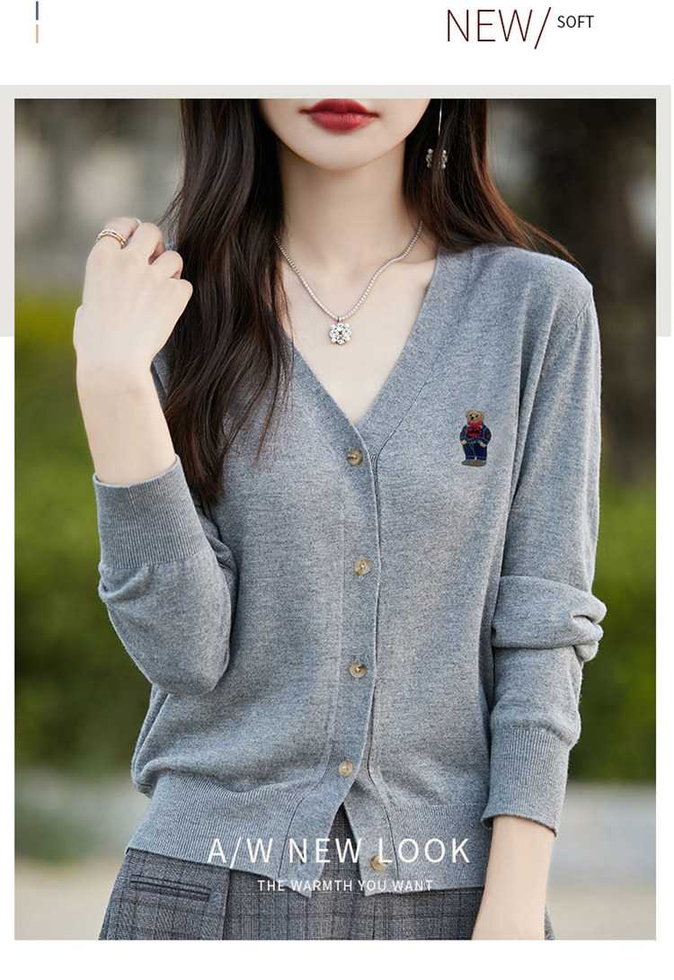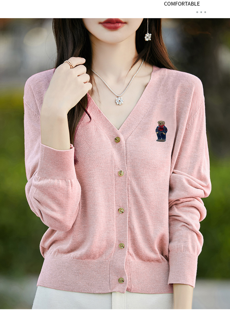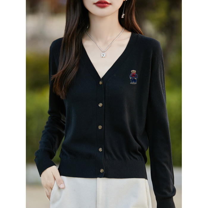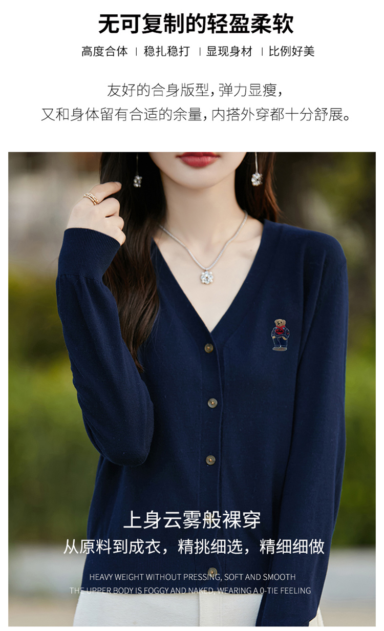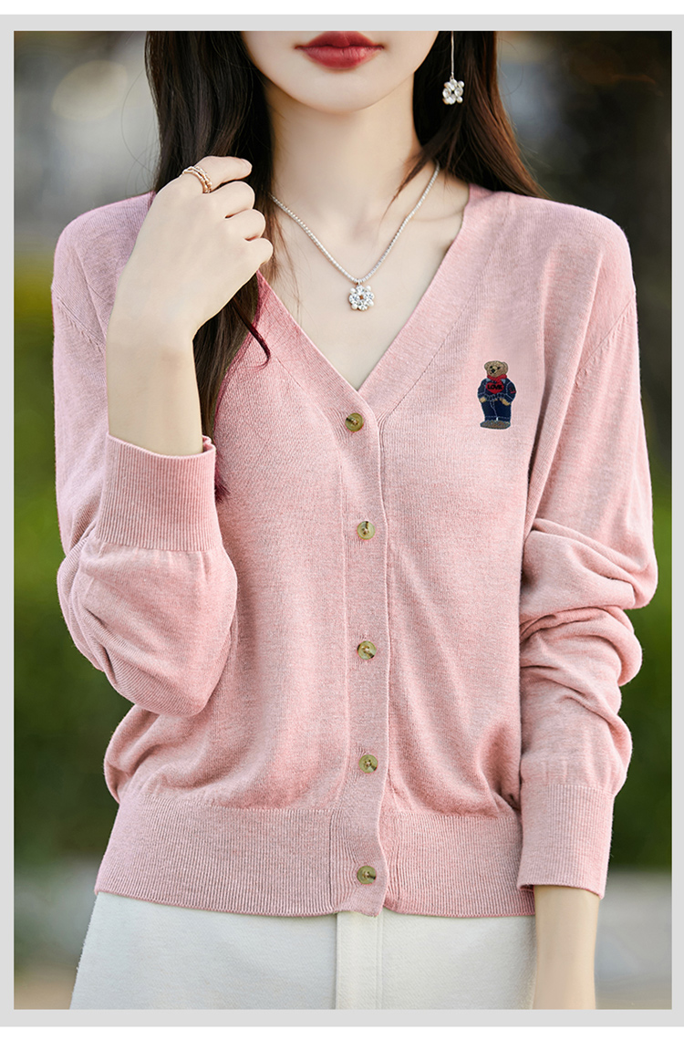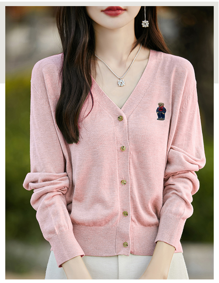 刺綉V領針織開衫女新款羊毛打底衫內搭薄款綠色毛衣外套短款上衣