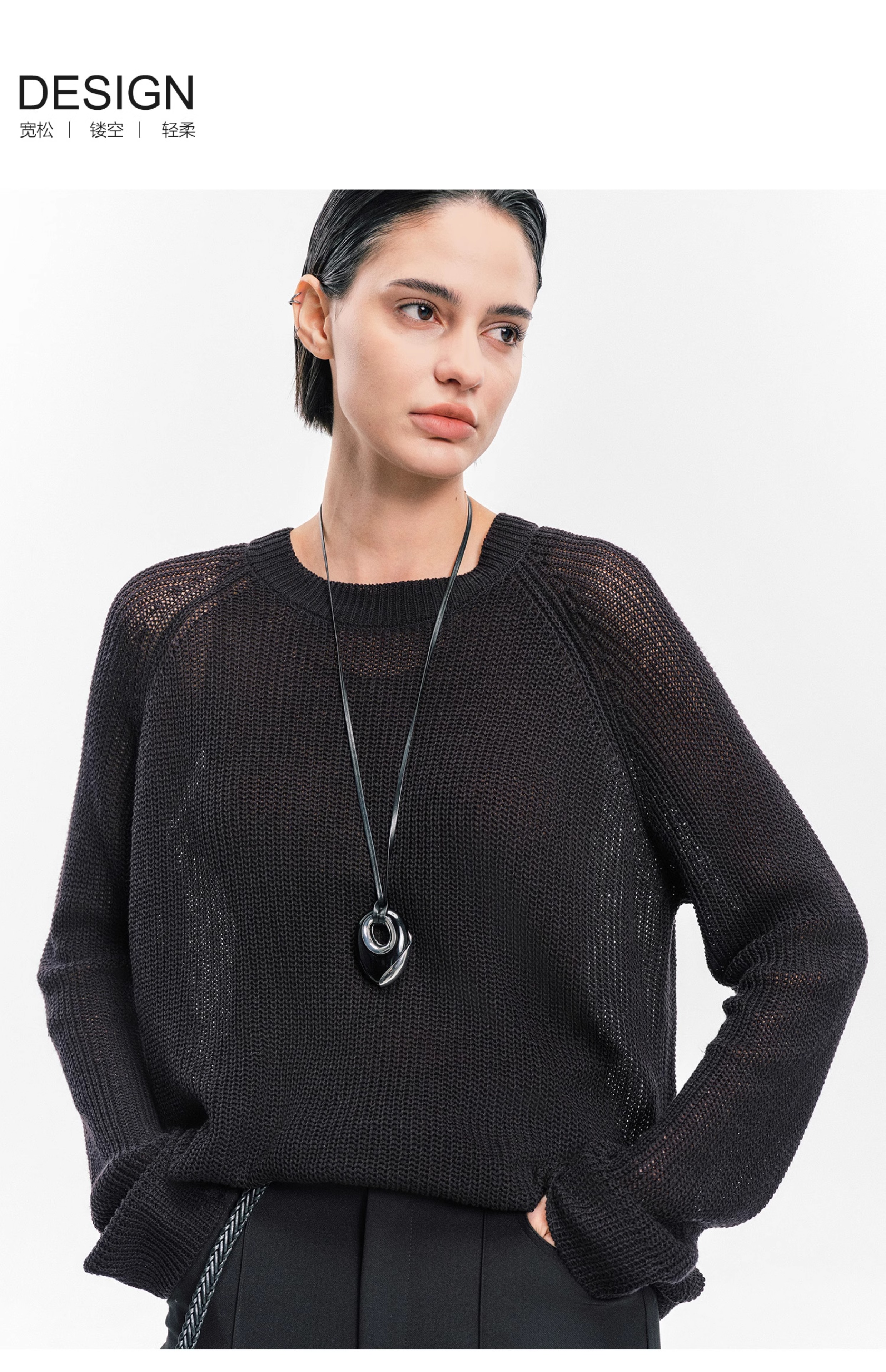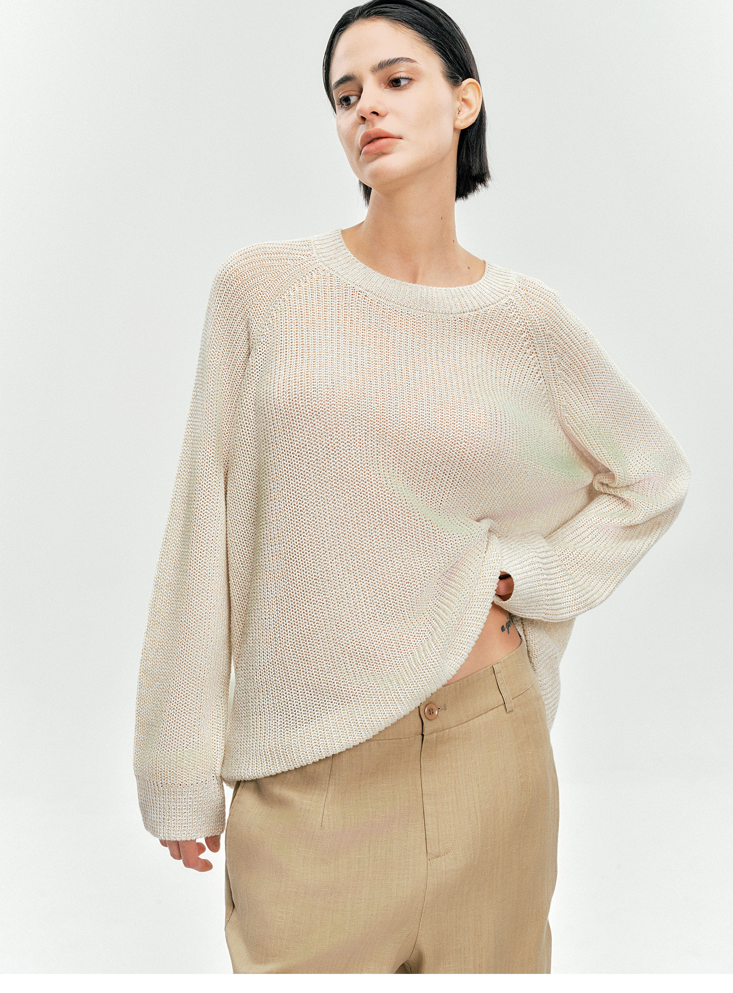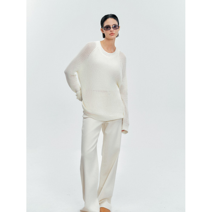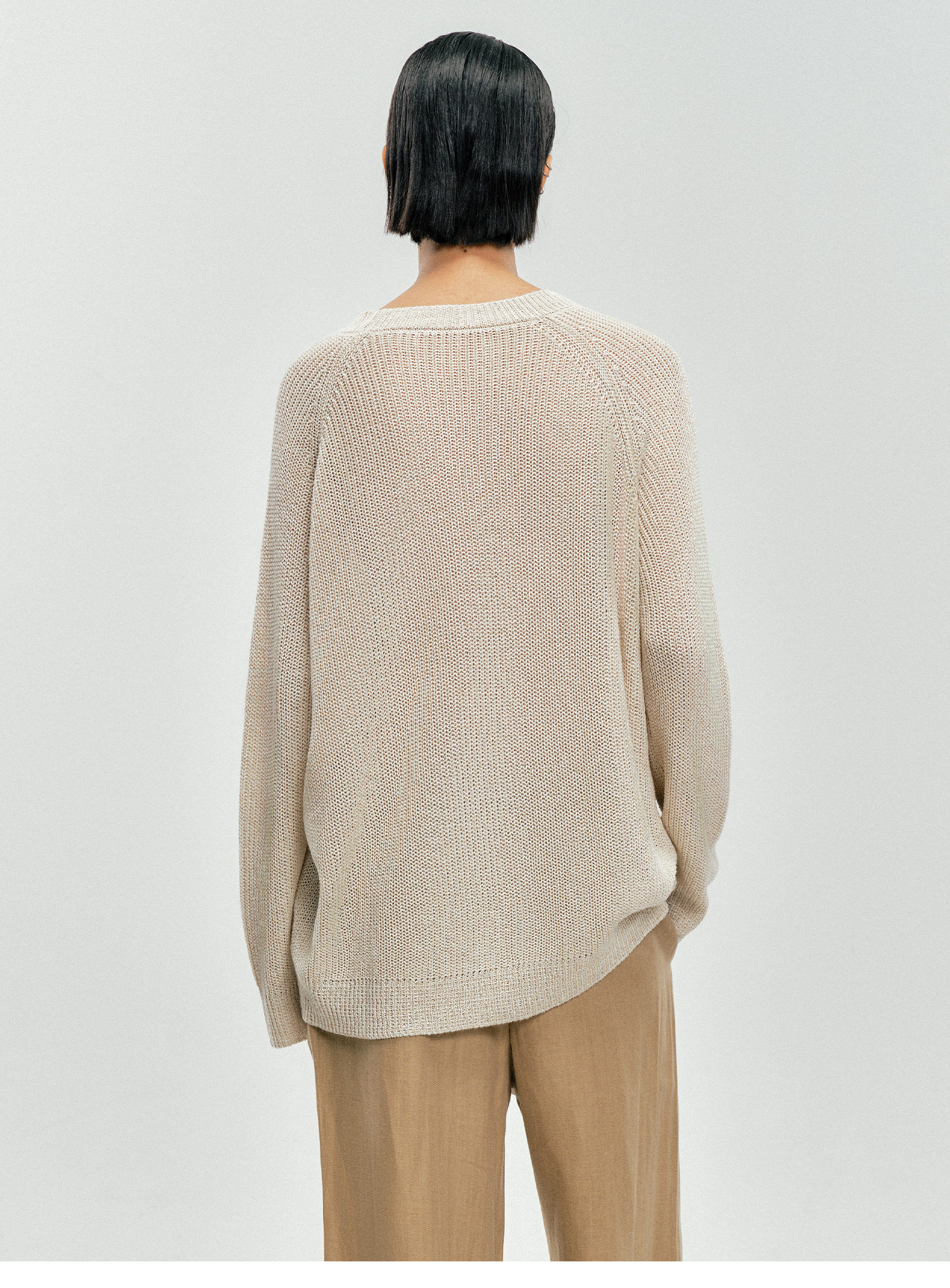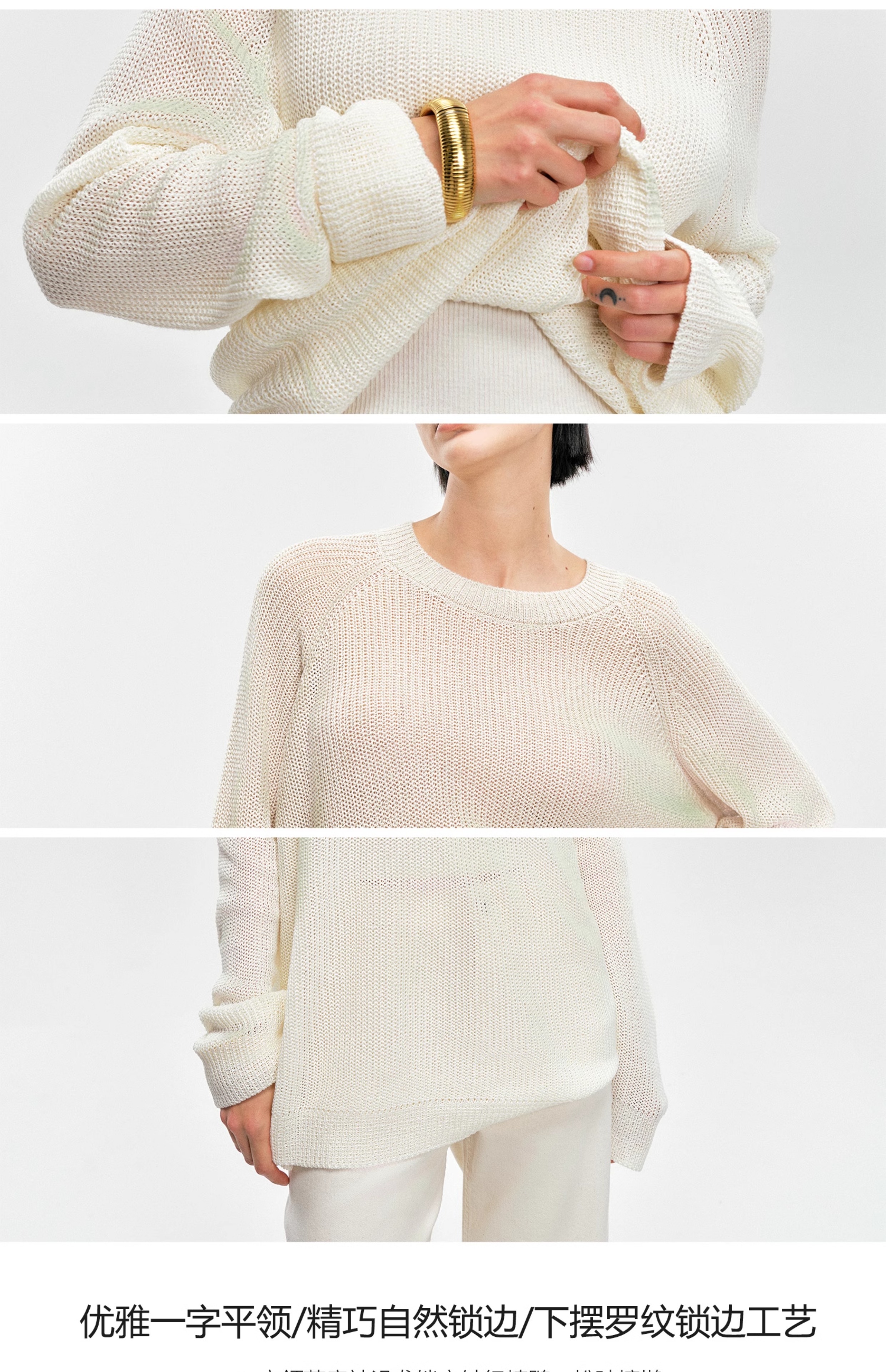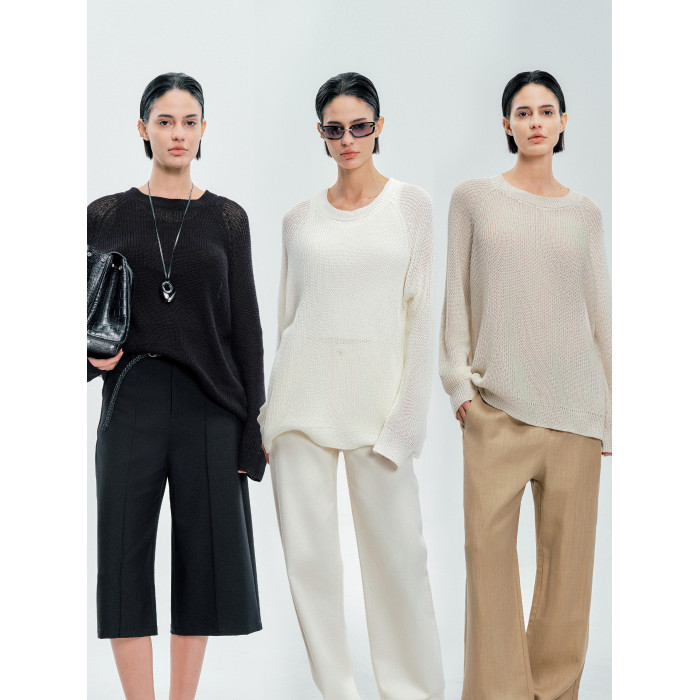 Moncekova2025春夏款亞麻混紡灰色鏤空針織衫女寬松圓領套頭罩衫