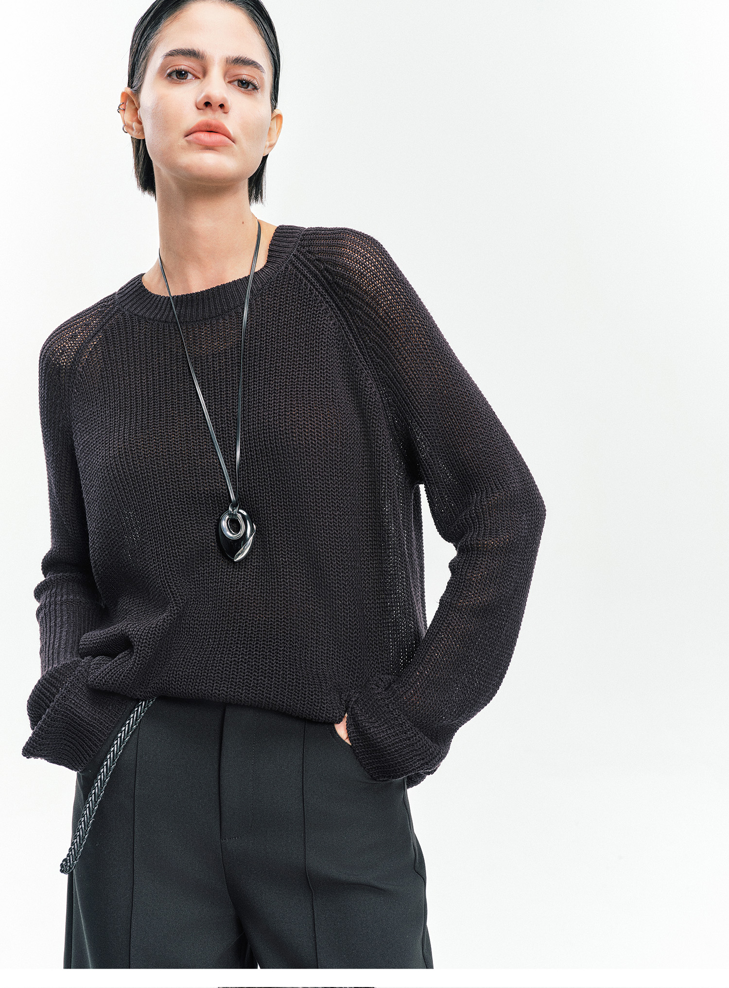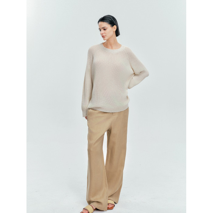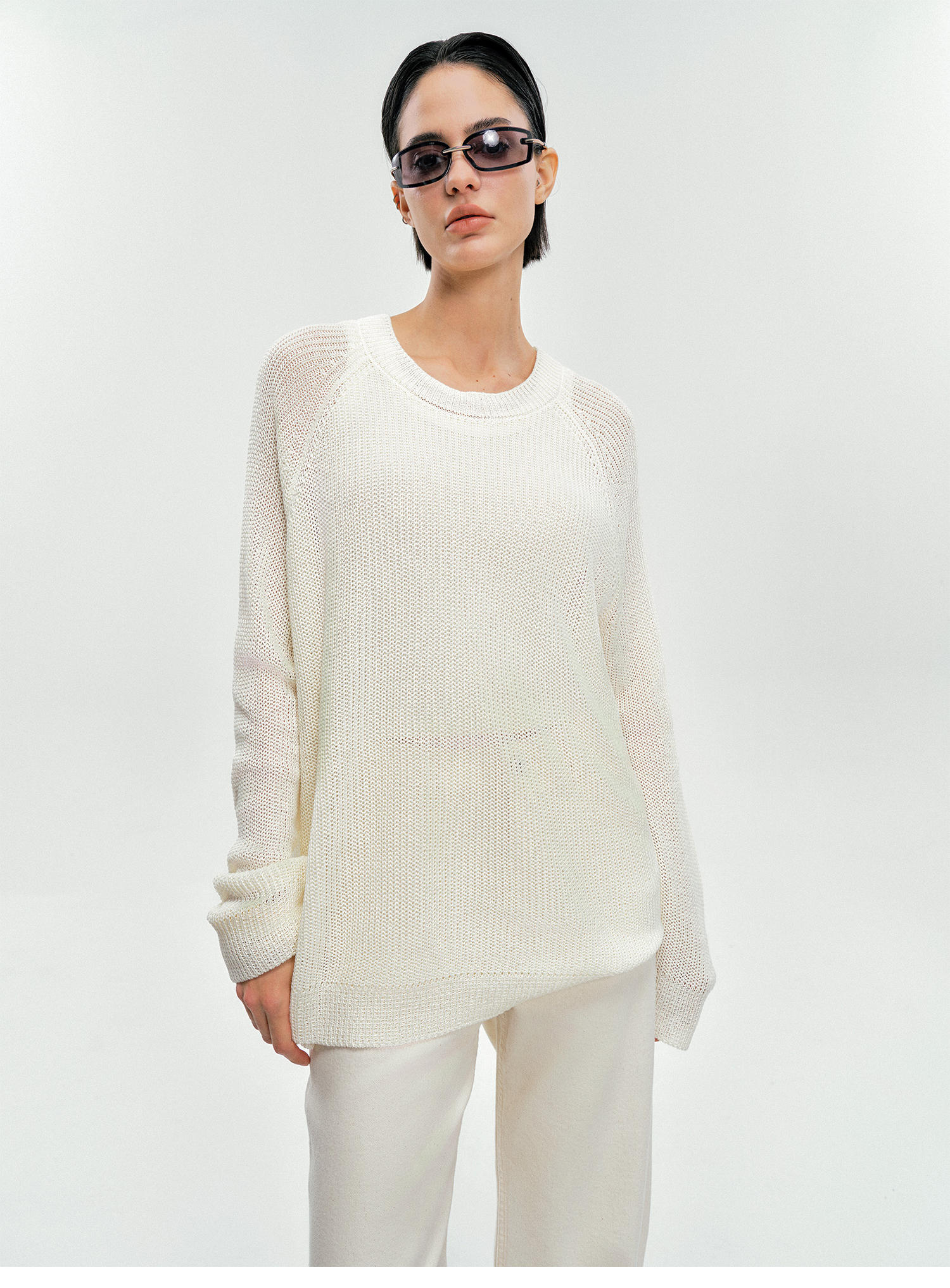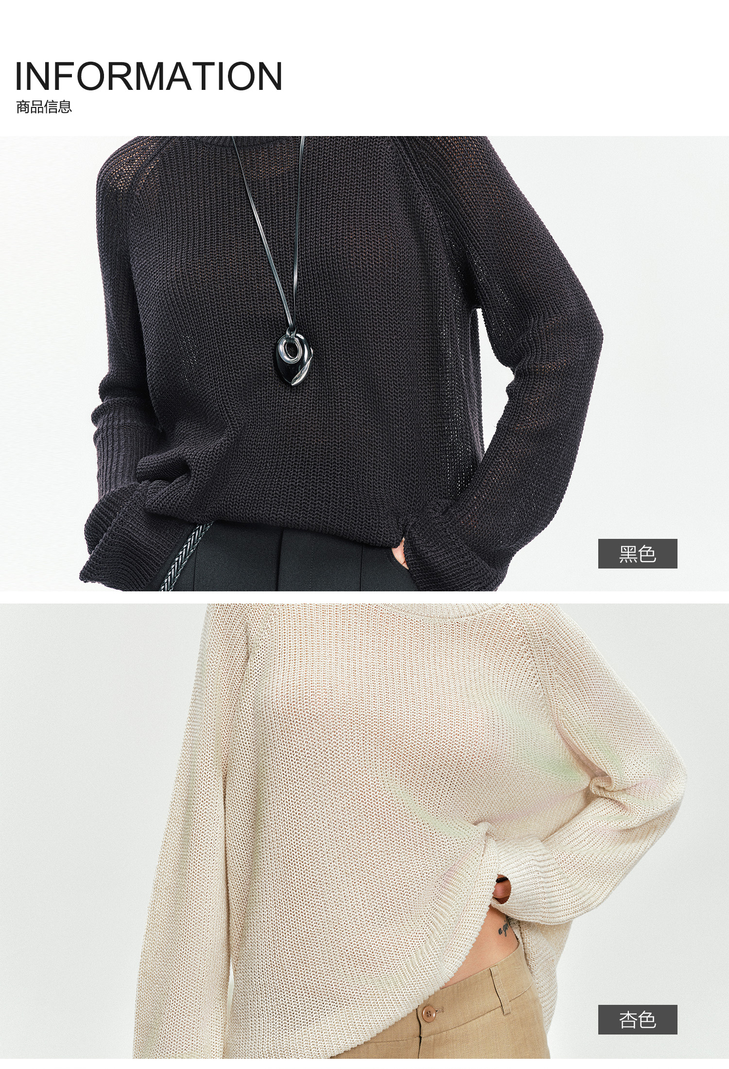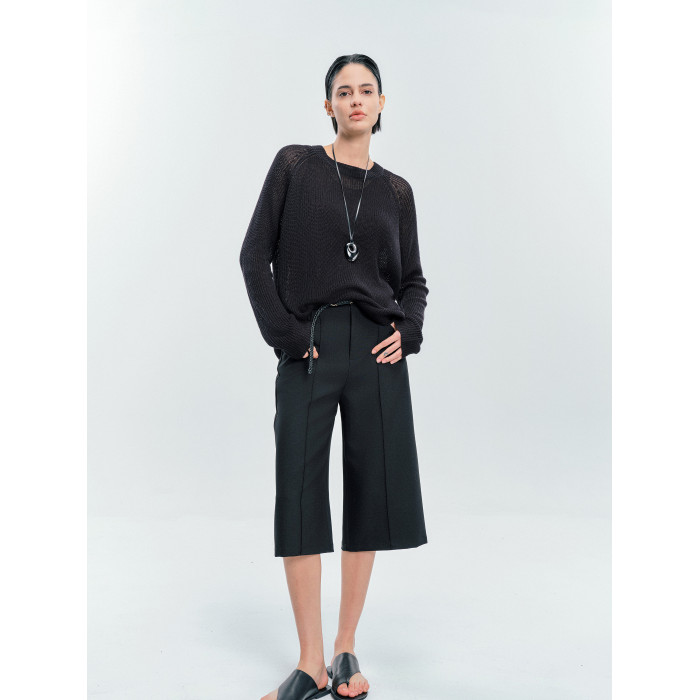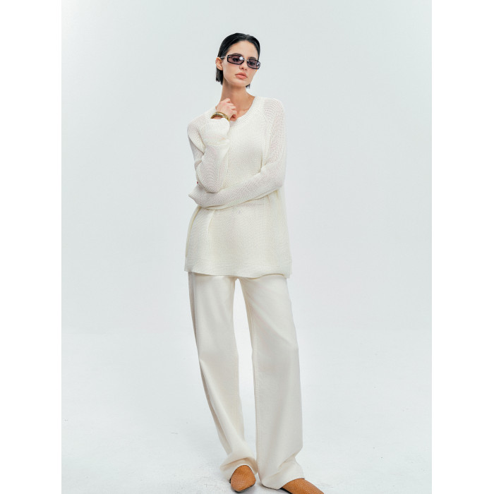 Moncekova2025春夏款亞麻混紡灰色鏤空針織衫女寬松圓領套頭罩衫