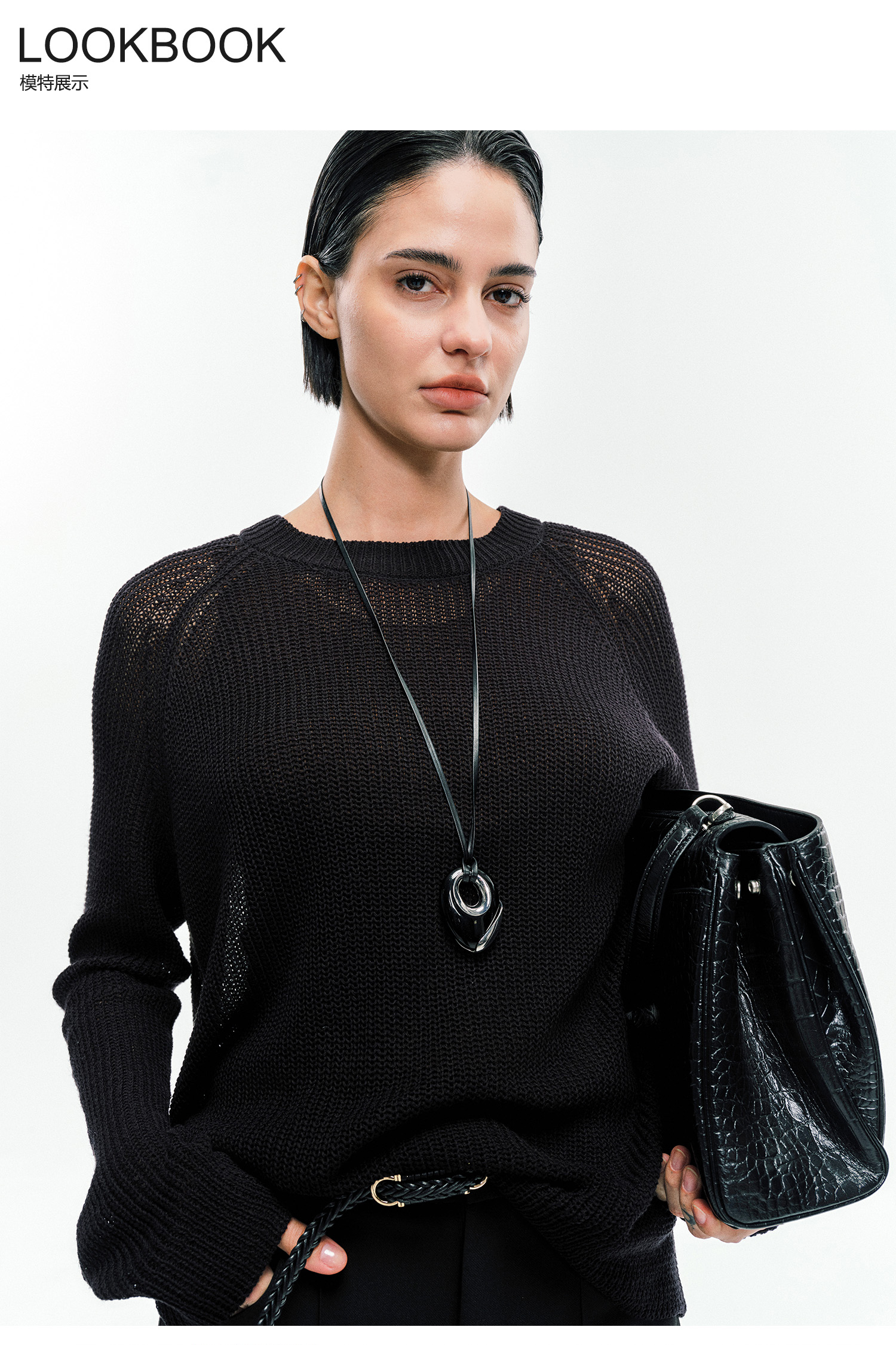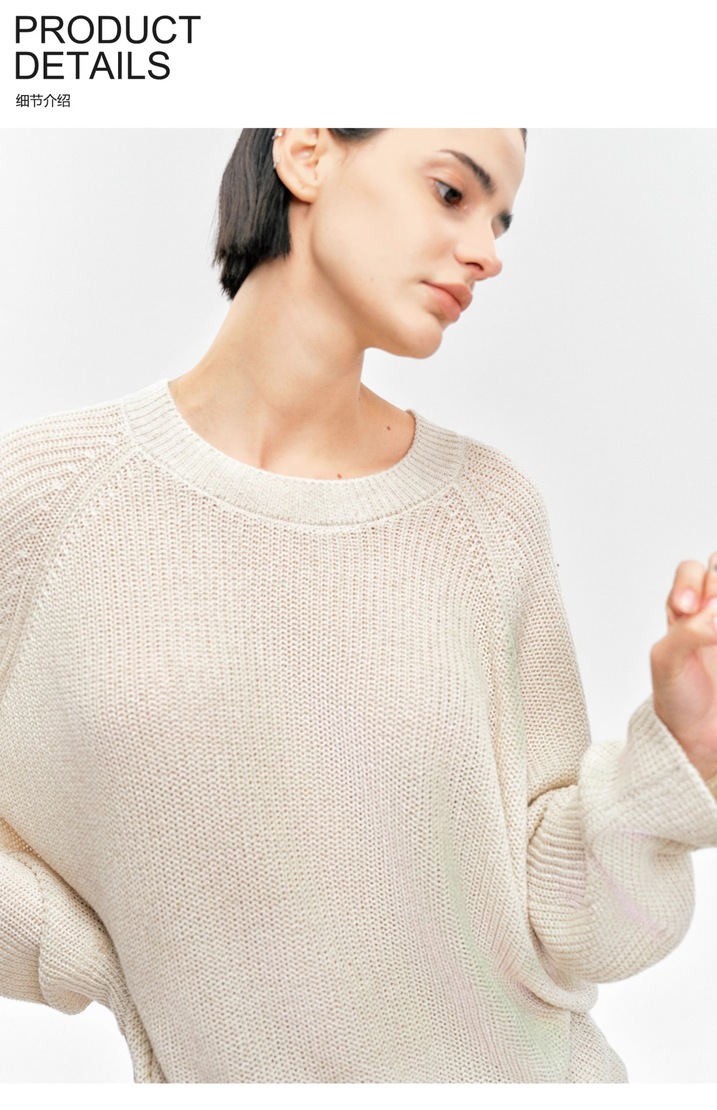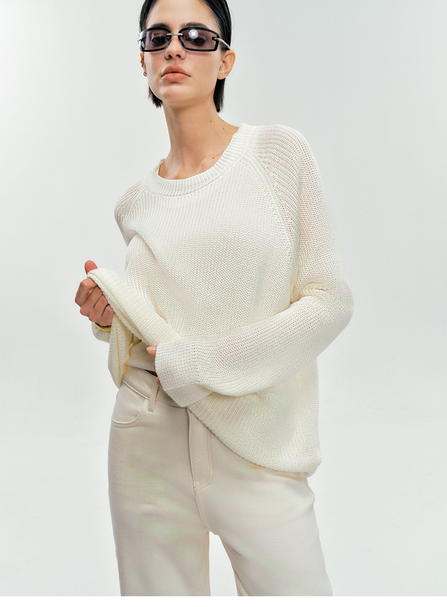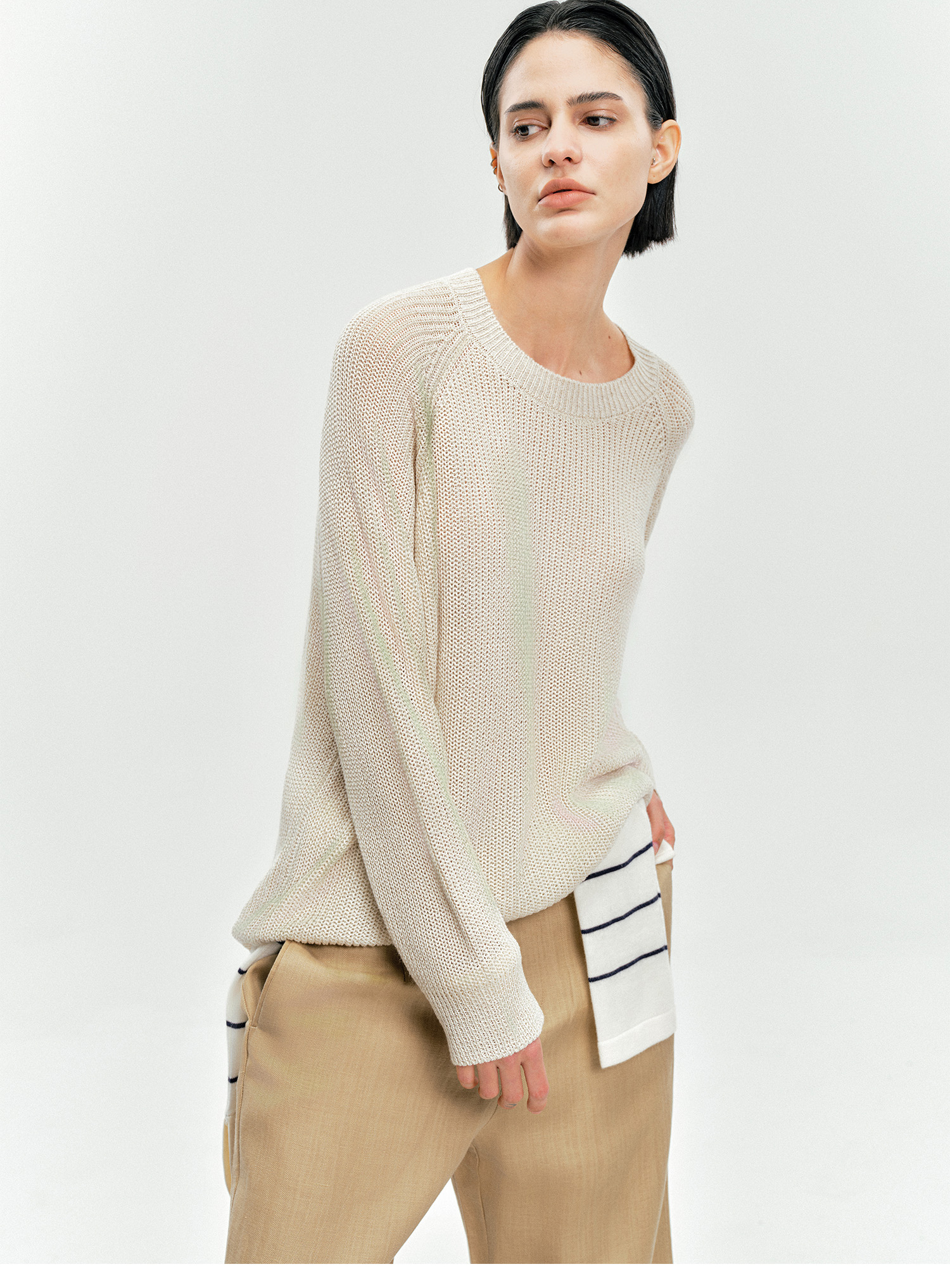 Moncekova2025春夏款亞麻混紡灰色鏤空針織衫女寬松圓領套頭罩衫