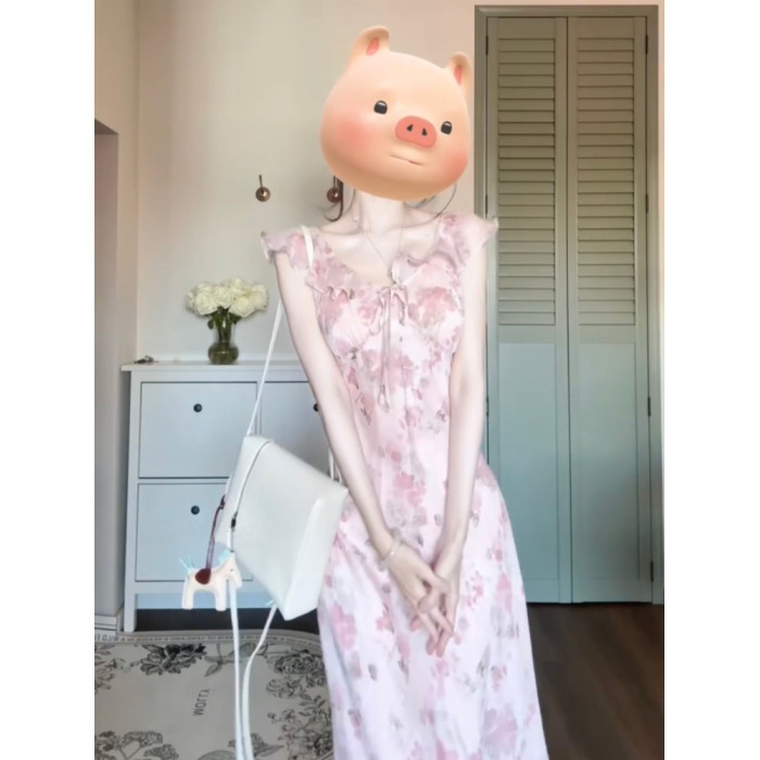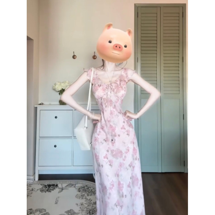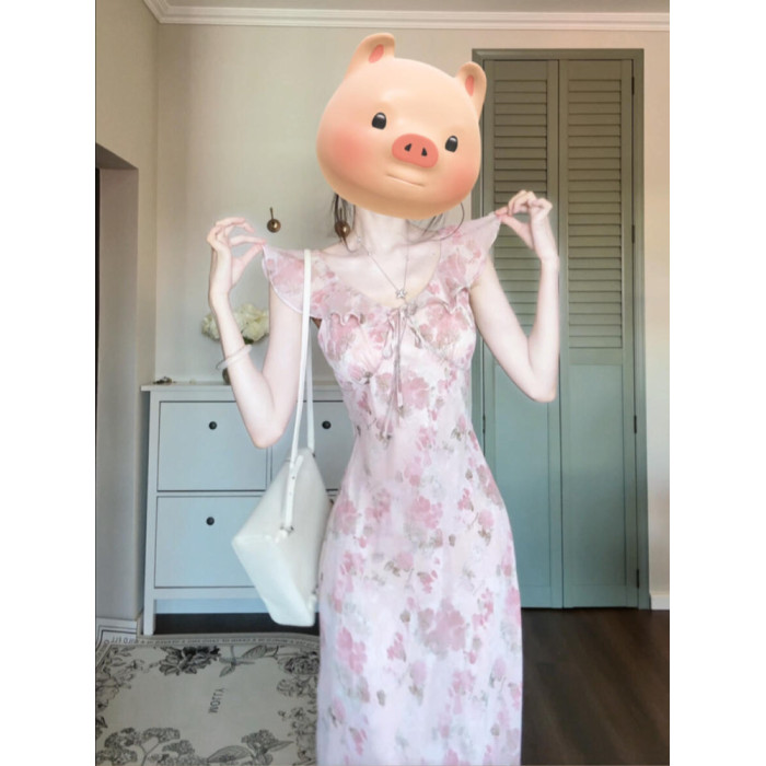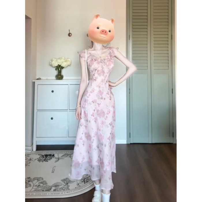 夏季新款法式小飛袖氣質感連衣裙女夏日穿搭雪紡碎花絕美長裙子