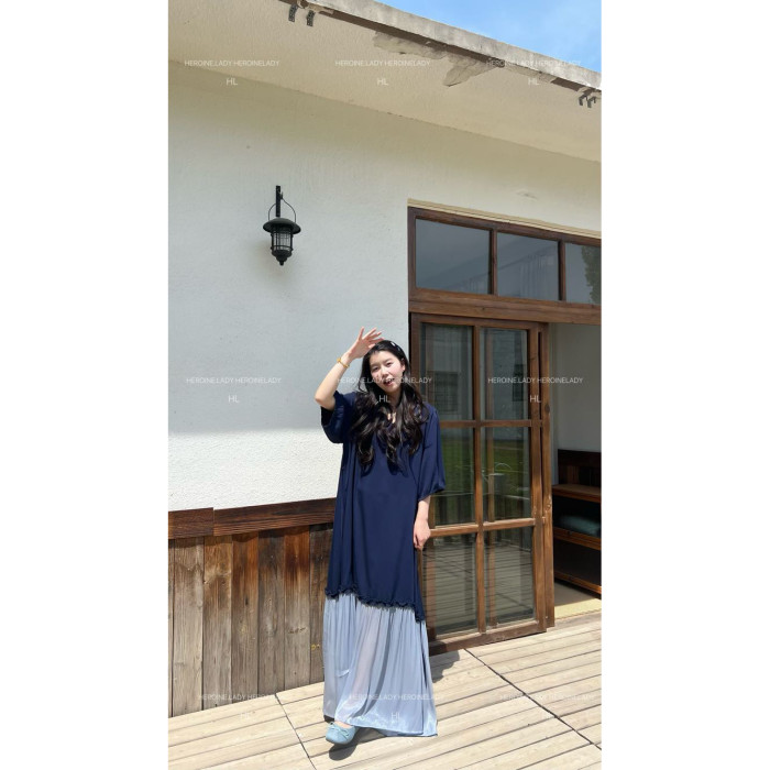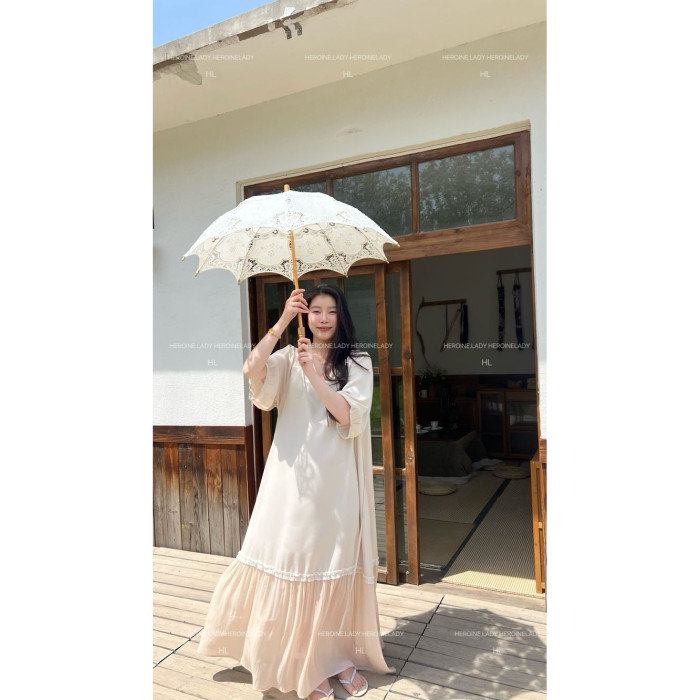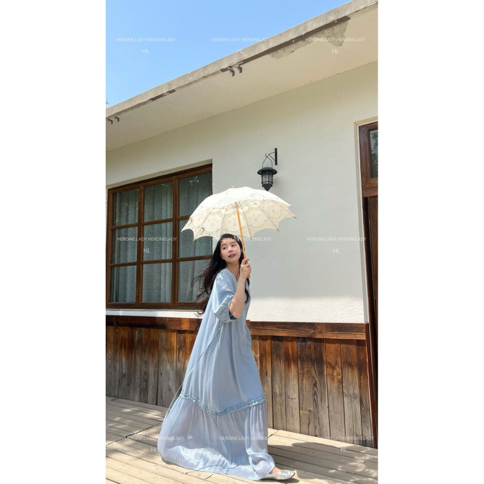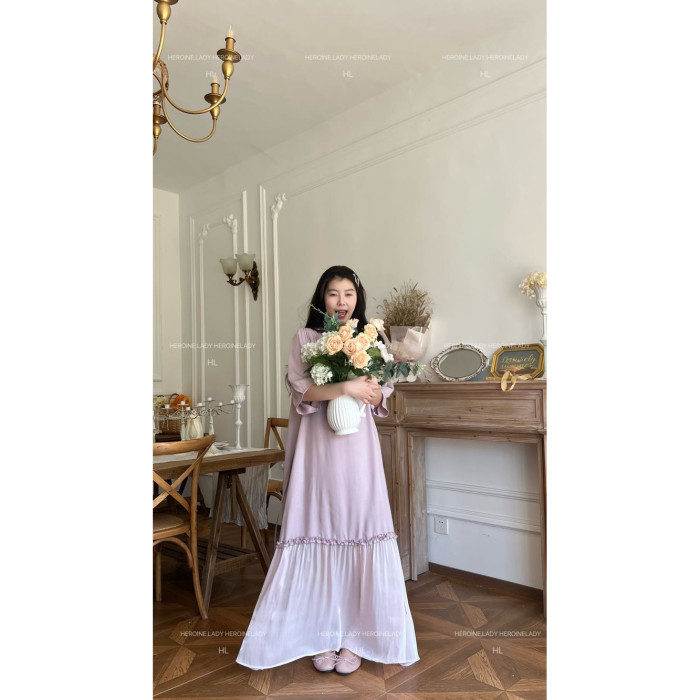 【愛是一道光】HL棉綢氣質法式V領優雅流光顯瘦長款短袖連衣裙