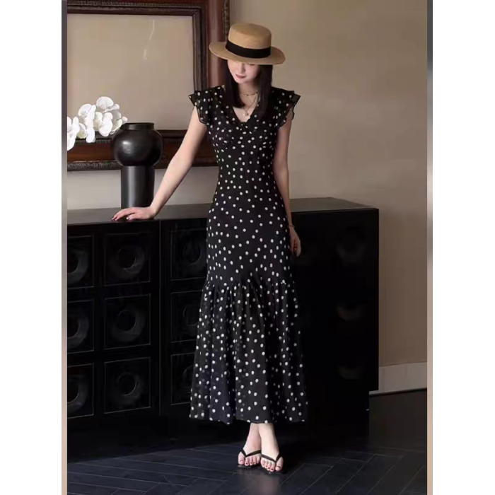黑色波點雪紡連衣裙子女夏季2025新款獨特漂亮氣質高級感收腰長裙