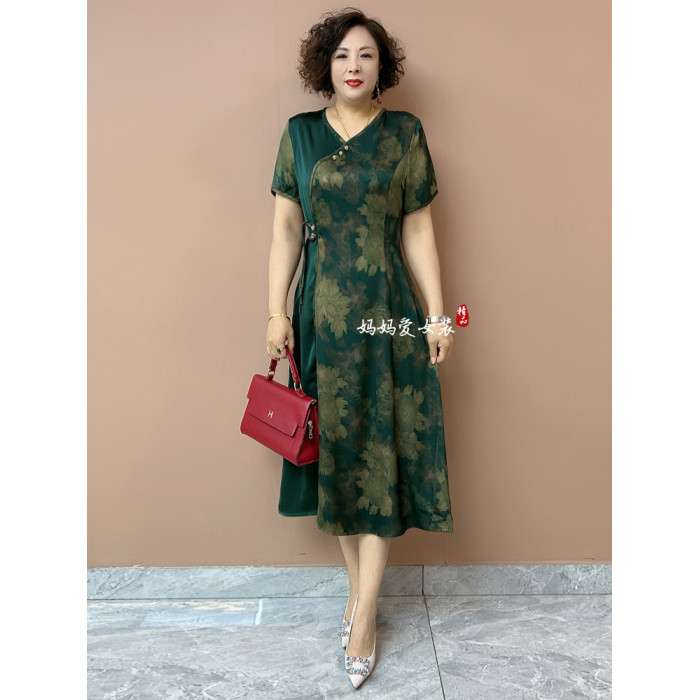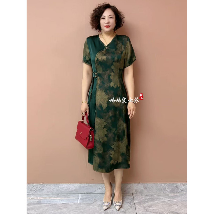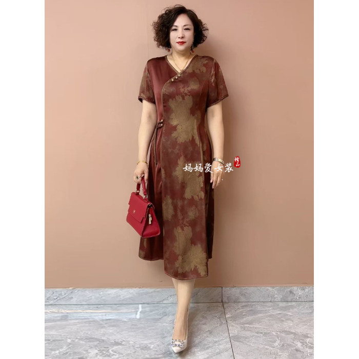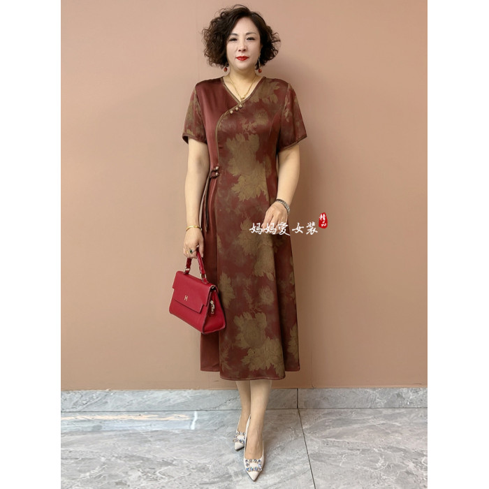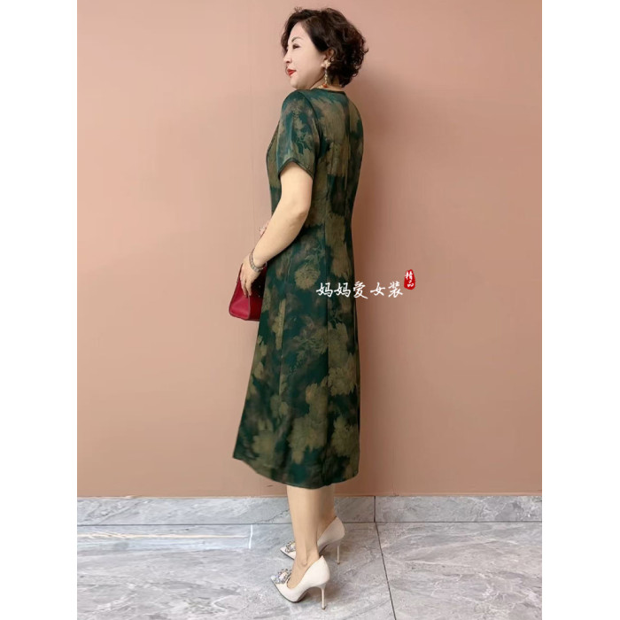 高檔氣質媽媽香雲紗連衣裙2025夏季新款洋氣媽媽真絲大碼短袖裙子
