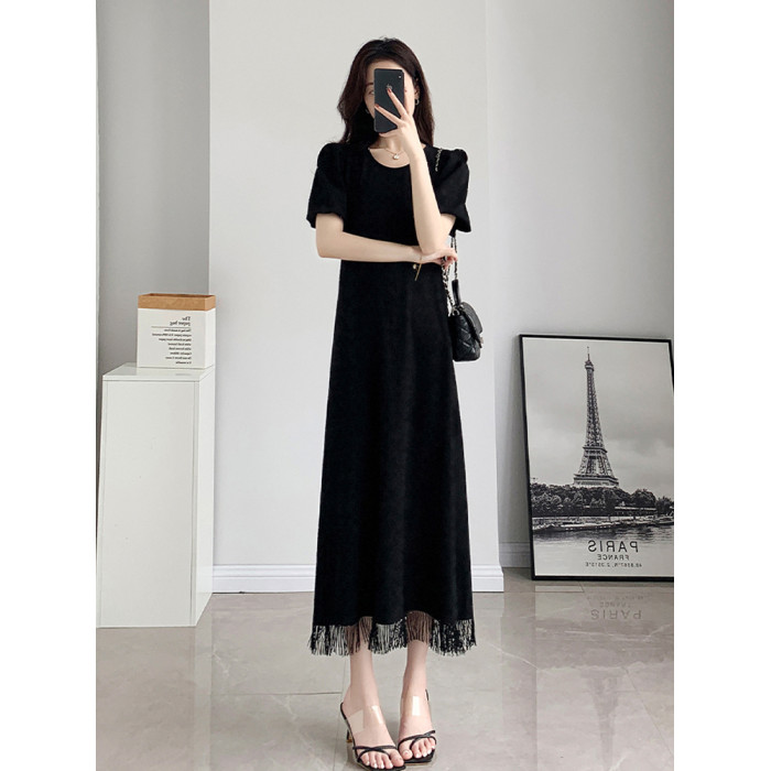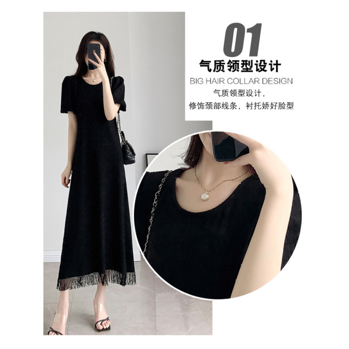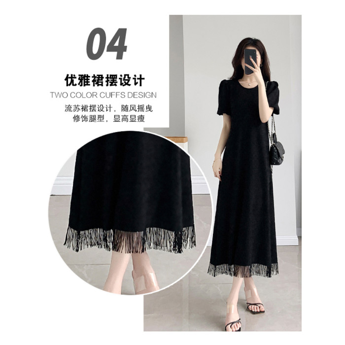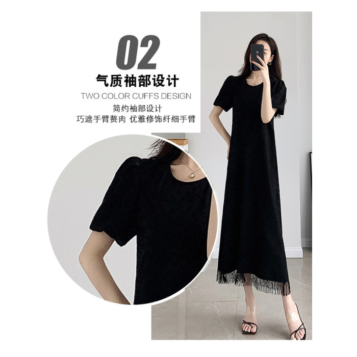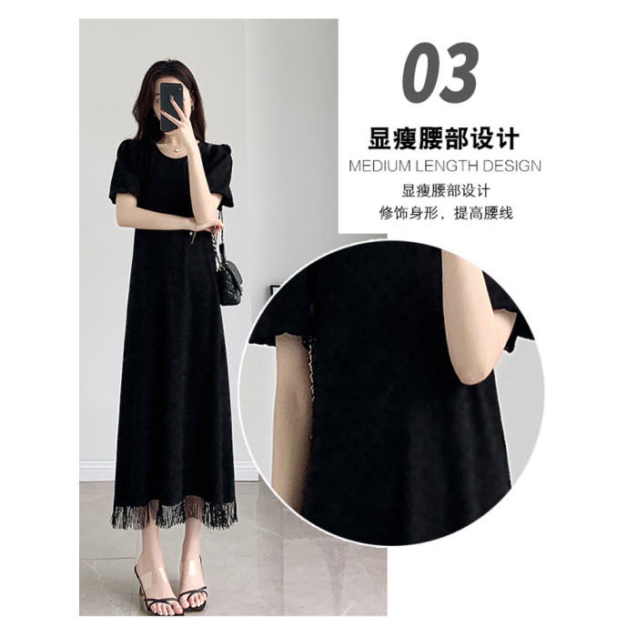 2025夏季新款流蘇下擺短袖裙子高個子加長款遮肚子修身連衣裙半袖