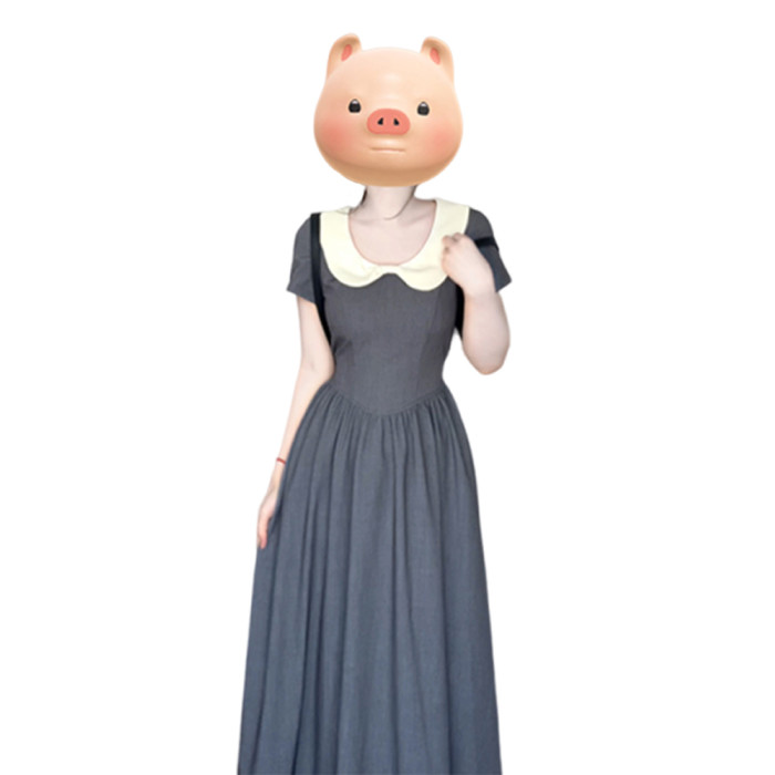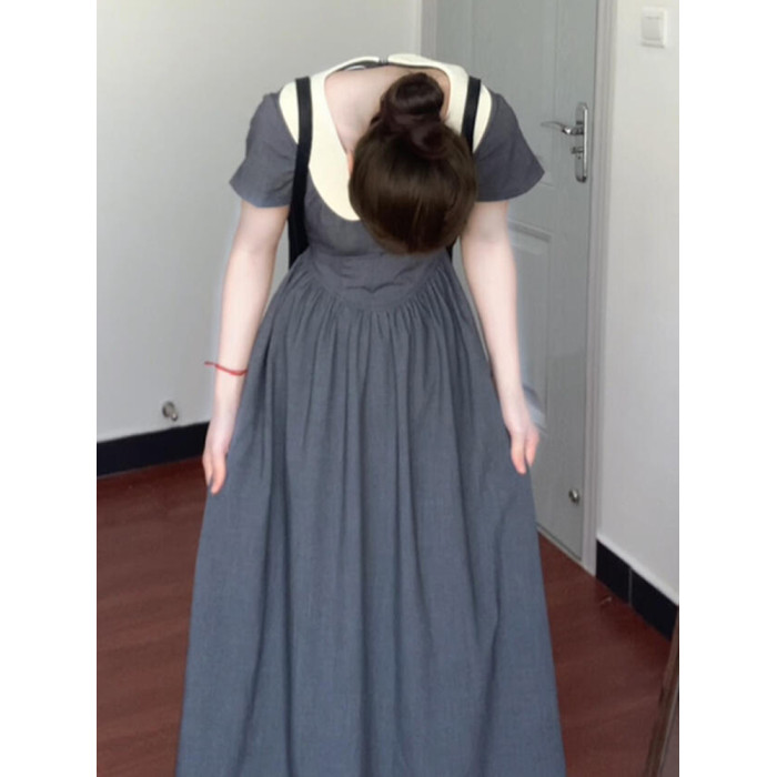 法式娃娃領灰色收腰連衣裙子女裝夏季2025新款小個子夏日絕美長裙