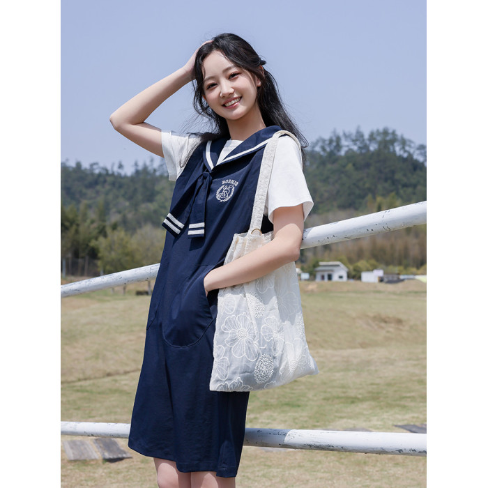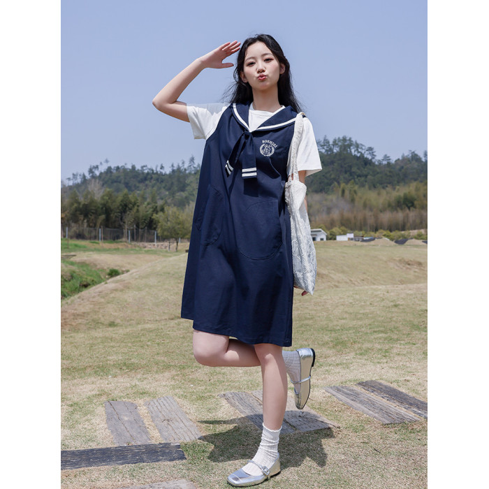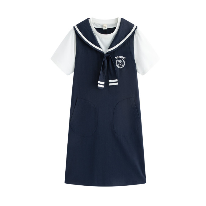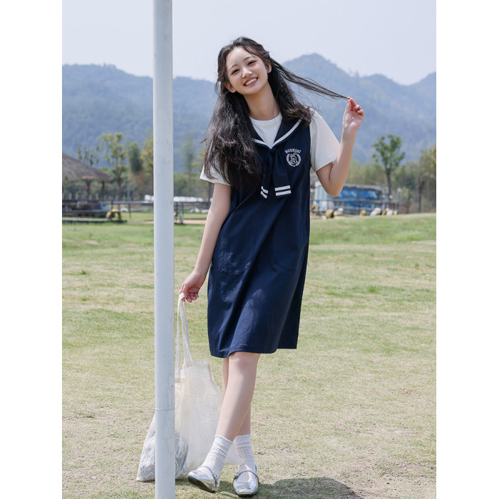初中學生連衣裙夏裝2025新款少女海軍領學院風假兩件高中女生裙子