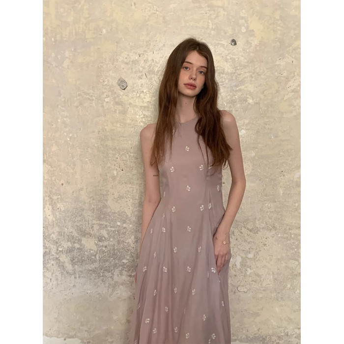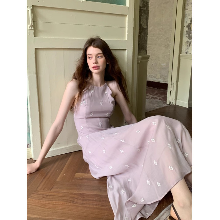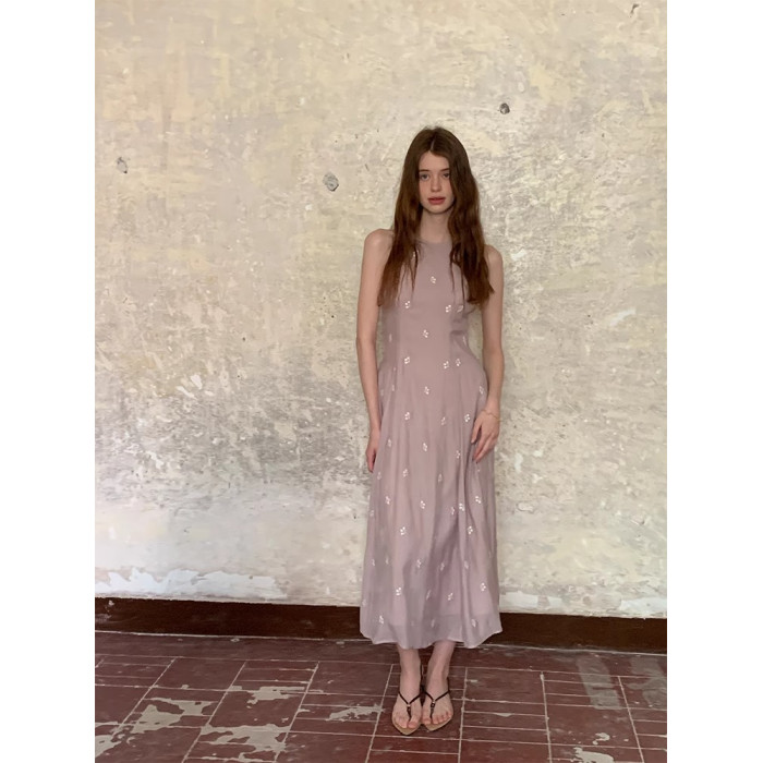 【ZHUY】綉花無袖薄紗連衣裙女夏長裙收腰顯瘦圓領新款原創設計