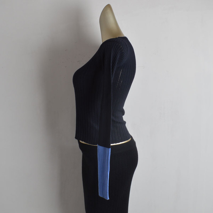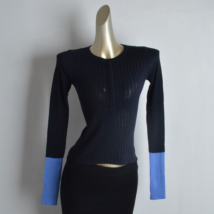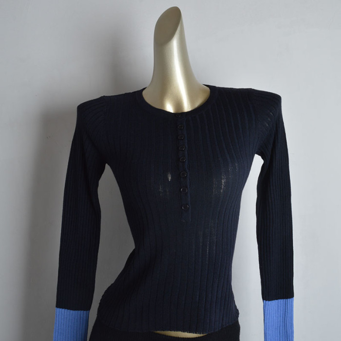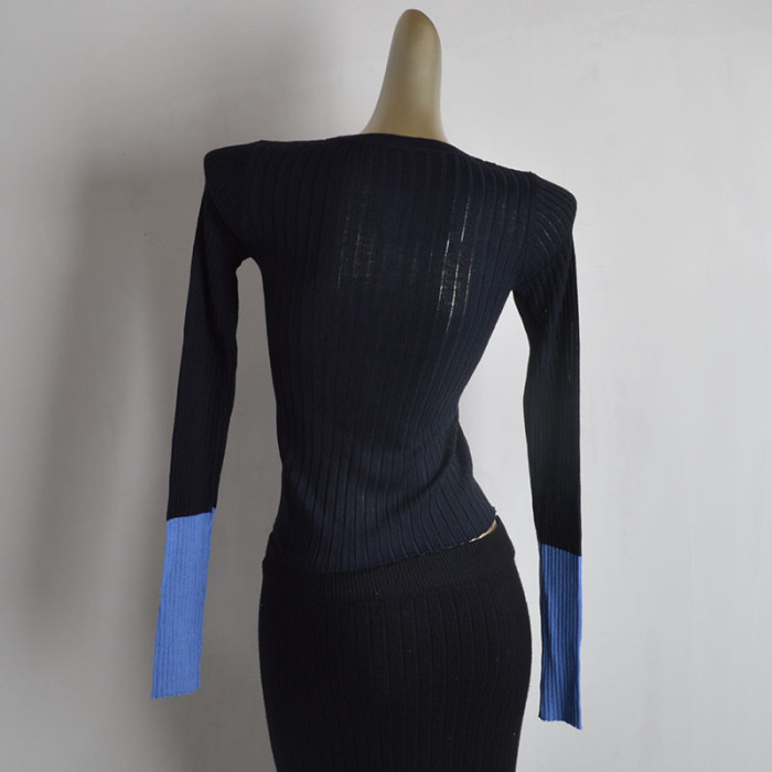時尚設計感修身顯瘦圓領針織羊毛衫女春季新款撞色長袖薄款打底衫