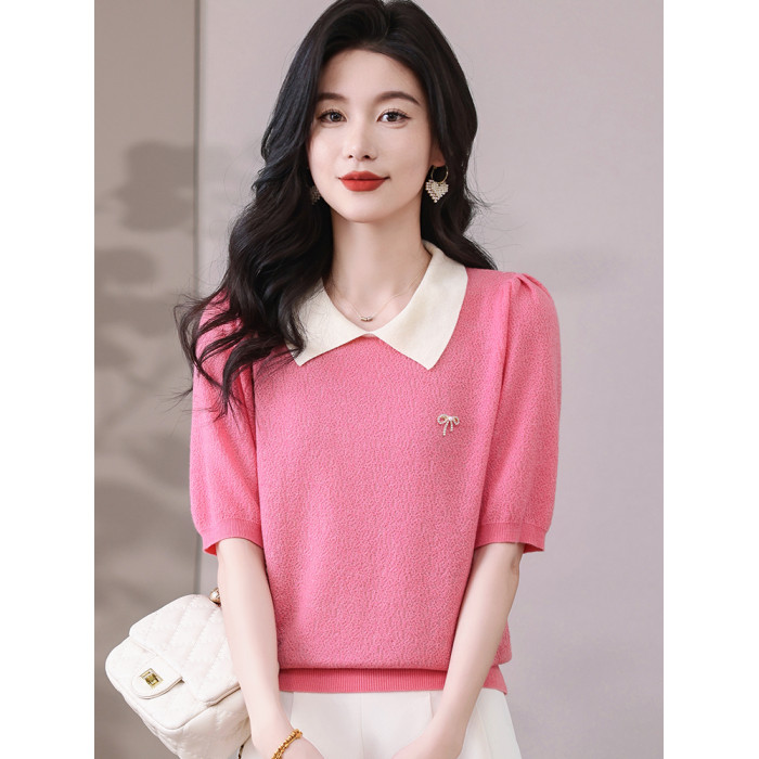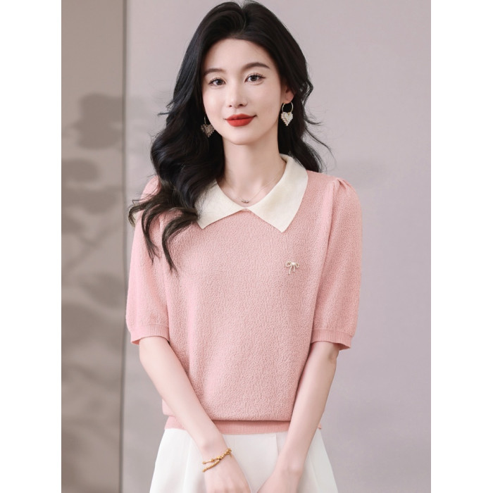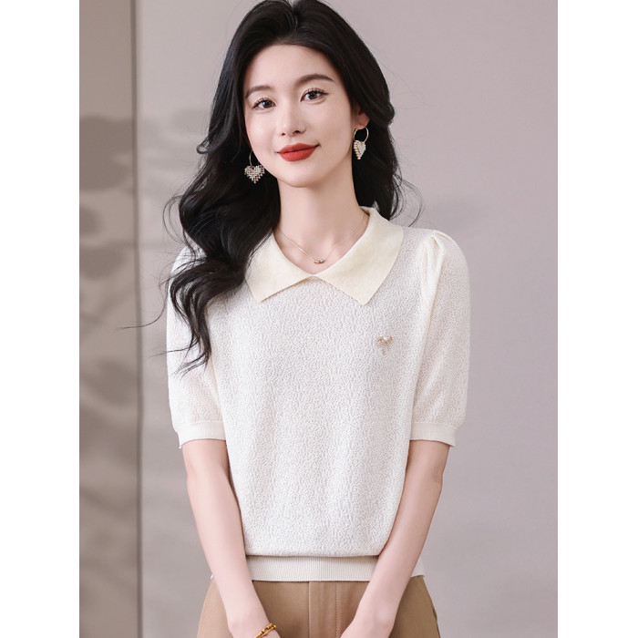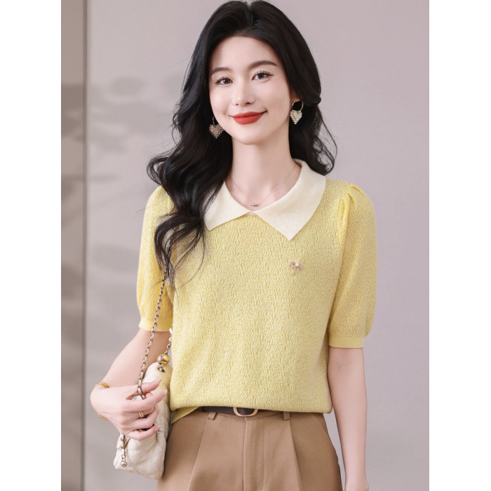 冰絲短袖針織衫女款2025新款娃娃領打底衫萊賽爾黃色天絲t恤上衣