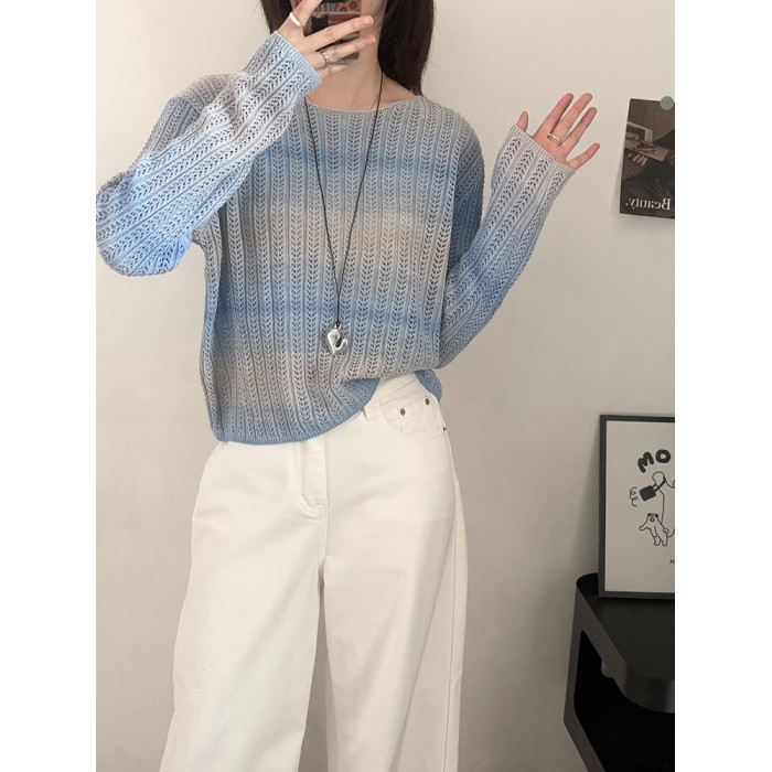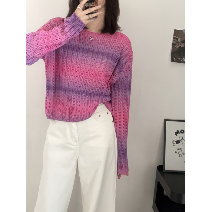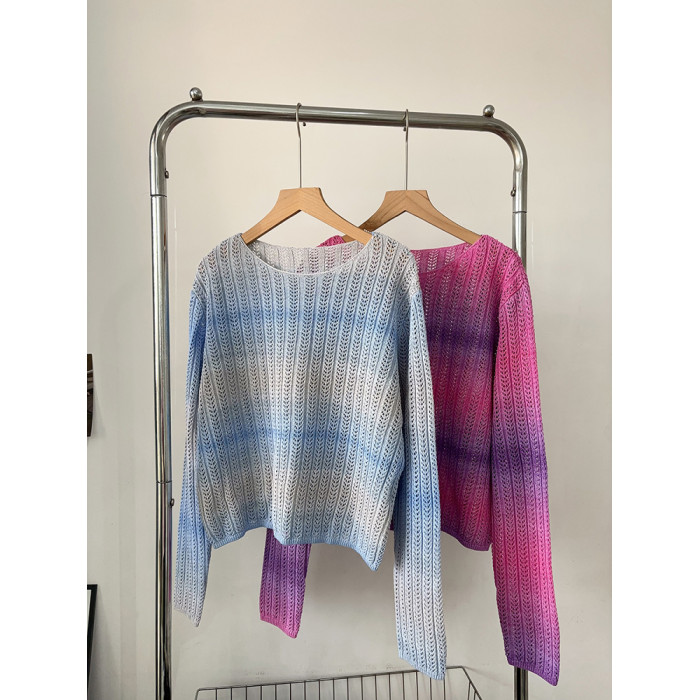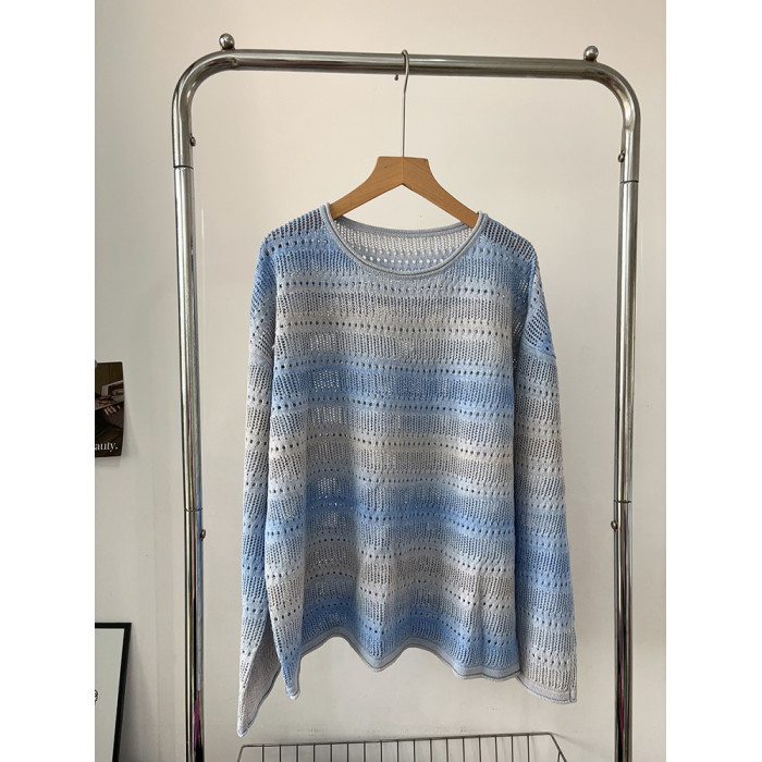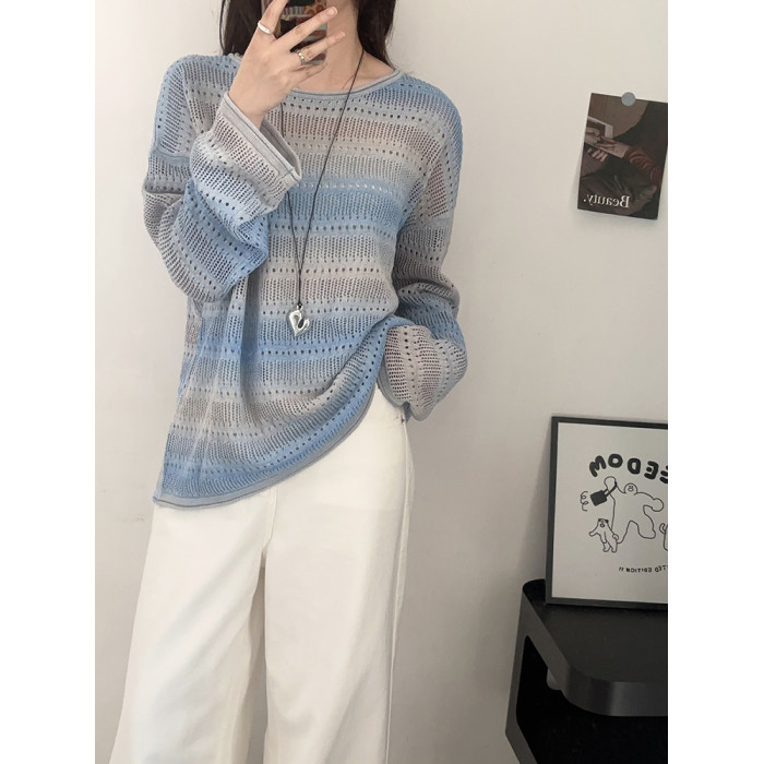 韓系漸變色條紋和紙紗針織打底衫女亞麻寬松鏤空上衣罩衫薄款歐貨