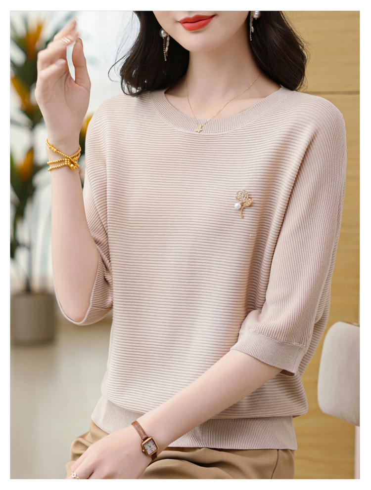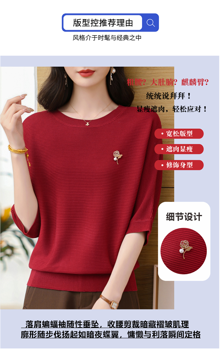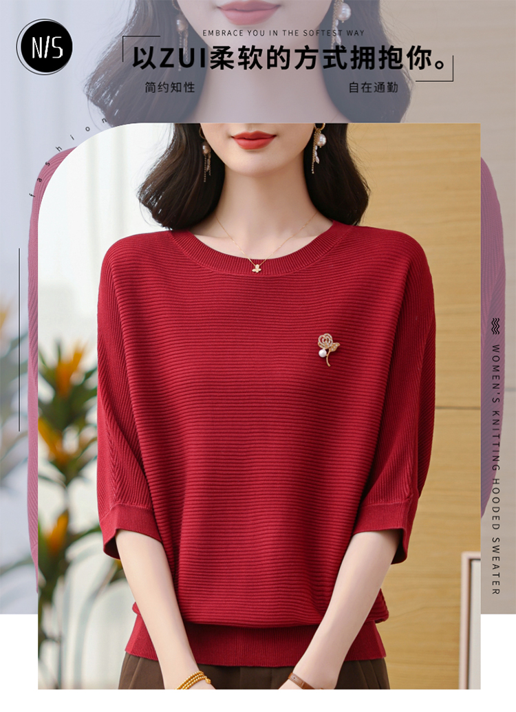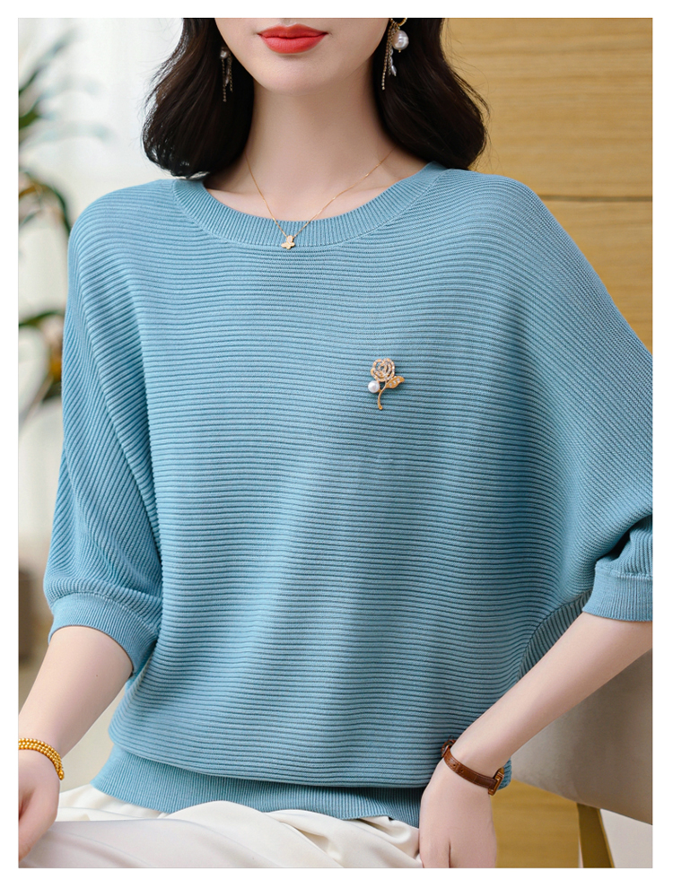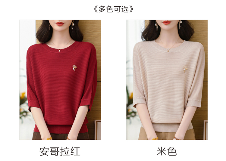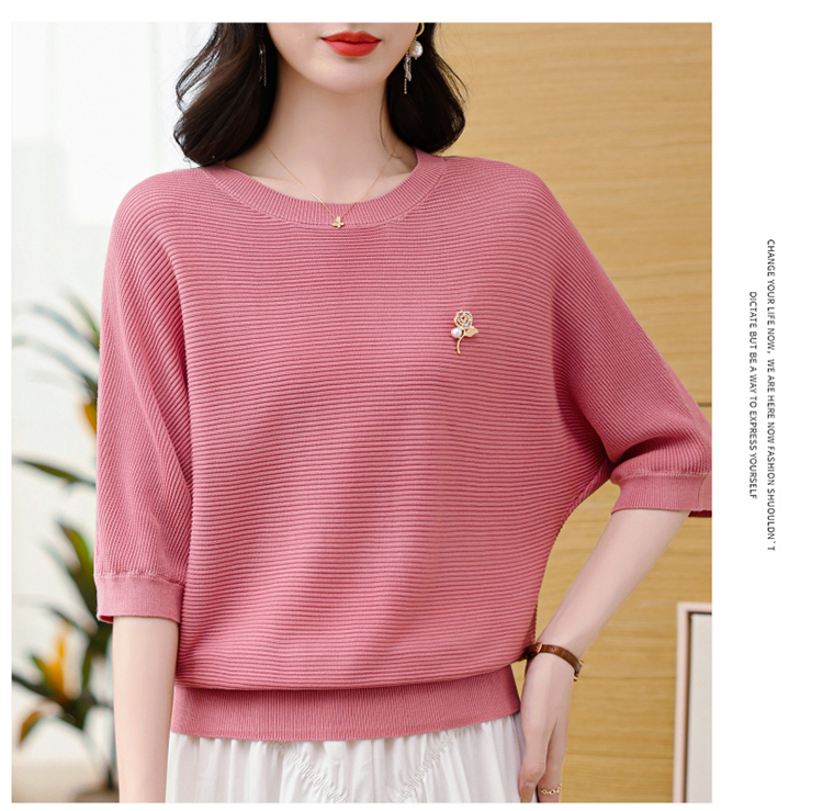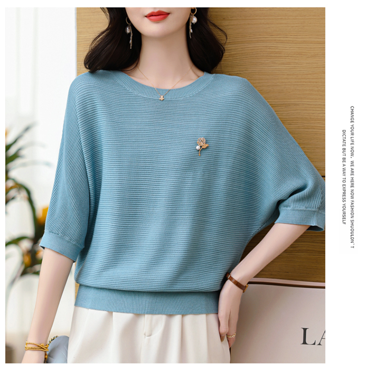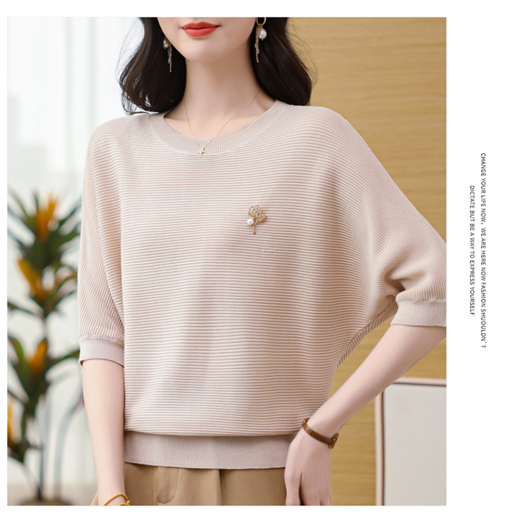 桑蠶絲蝙蝠袖針織衫女中袖上衣春夏媽媽裝洋氣小衫寬松大碼打底衫