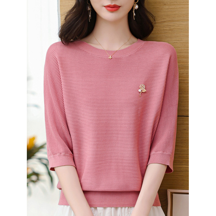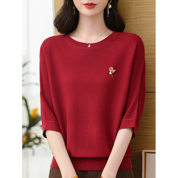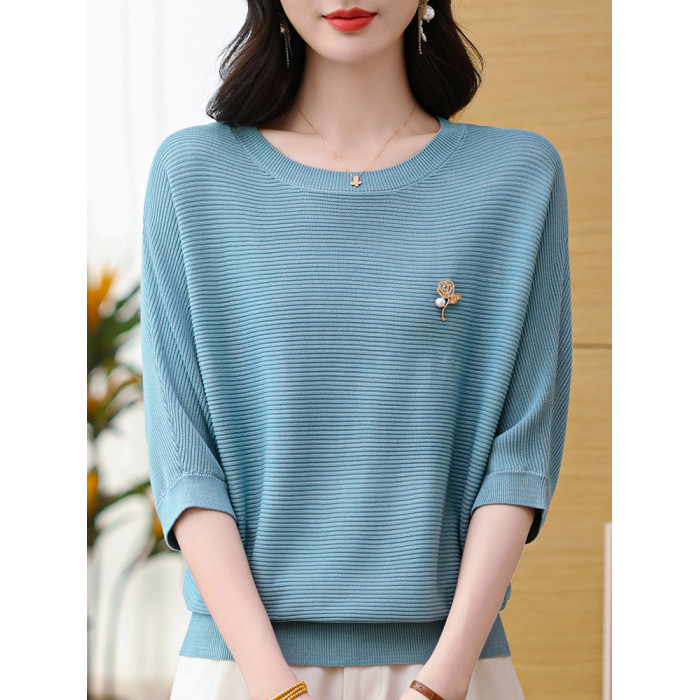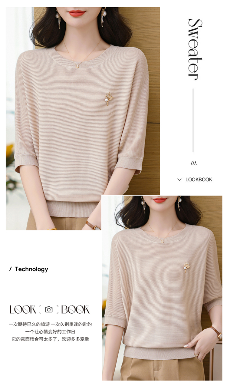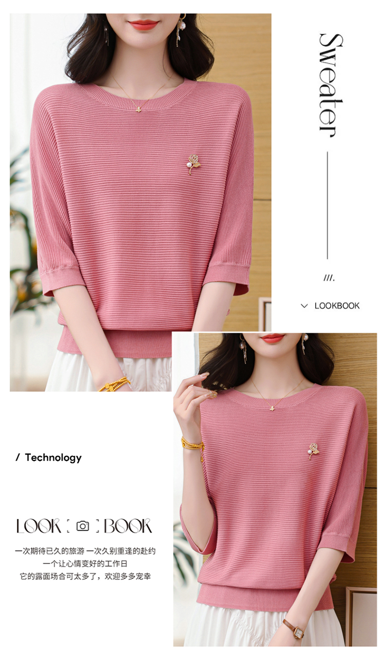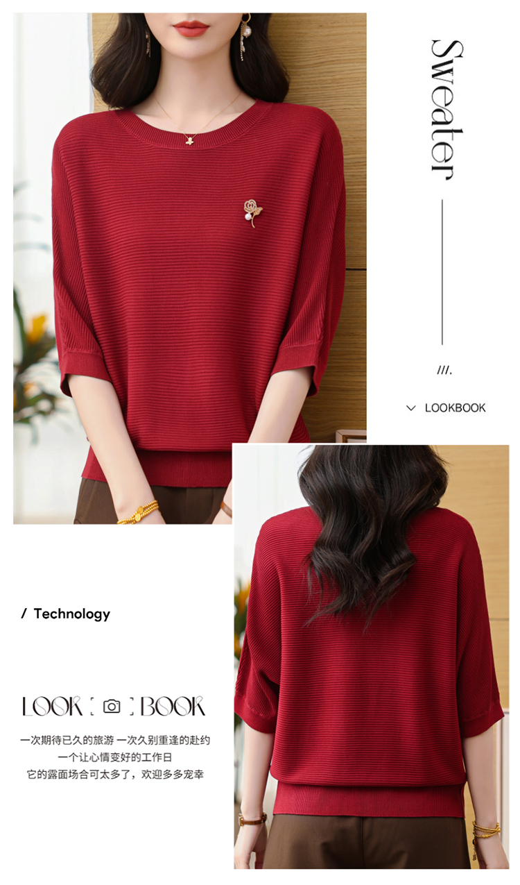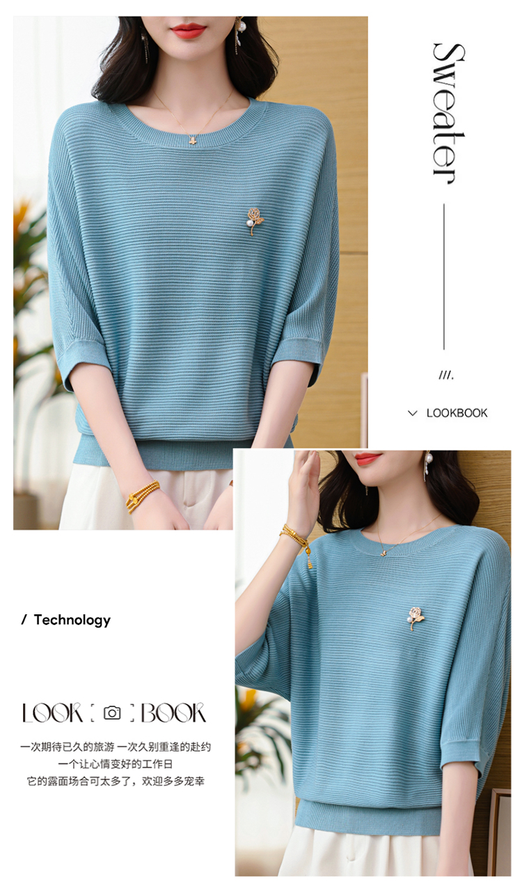 桑蠶絲蝙蝠袖針織衫女中袖上衣春夏媽媽裝洋氣小衫寬松大碼打底衫