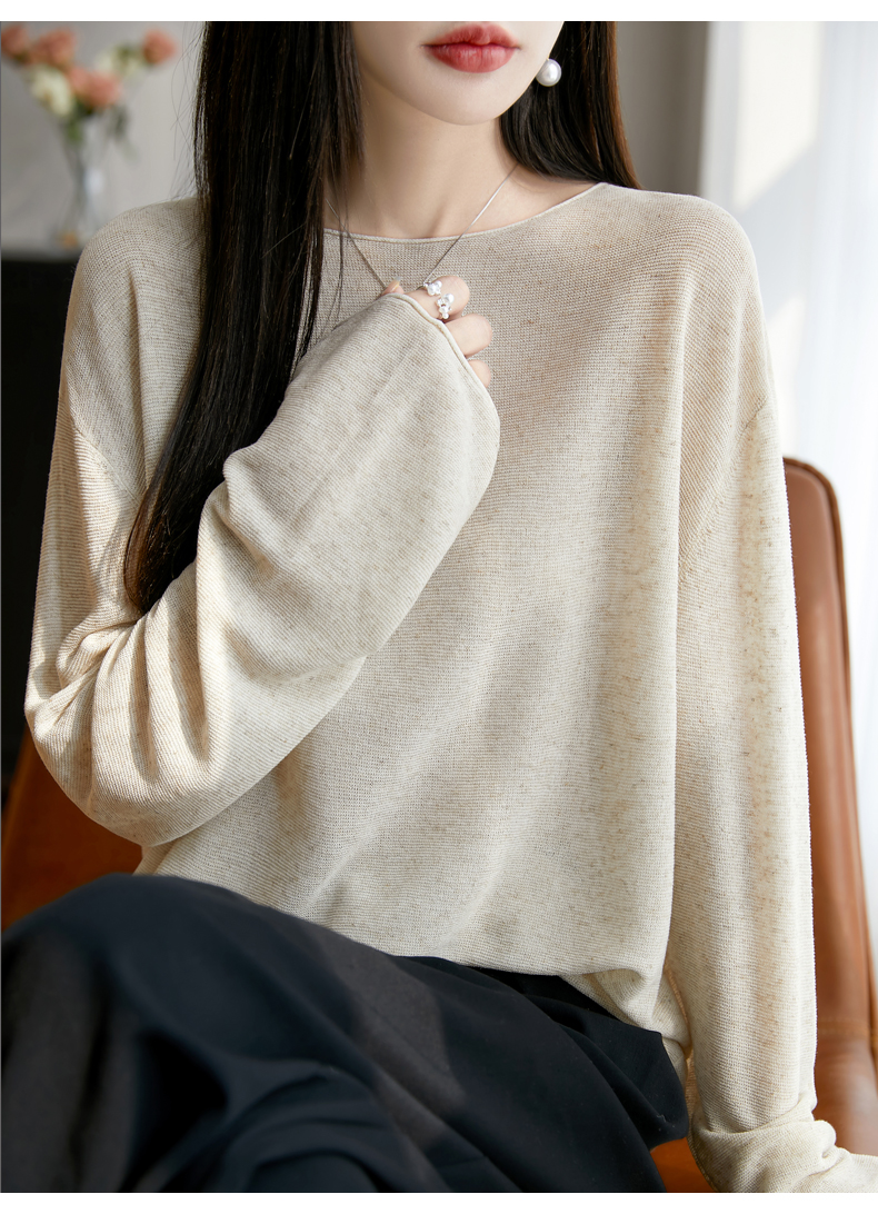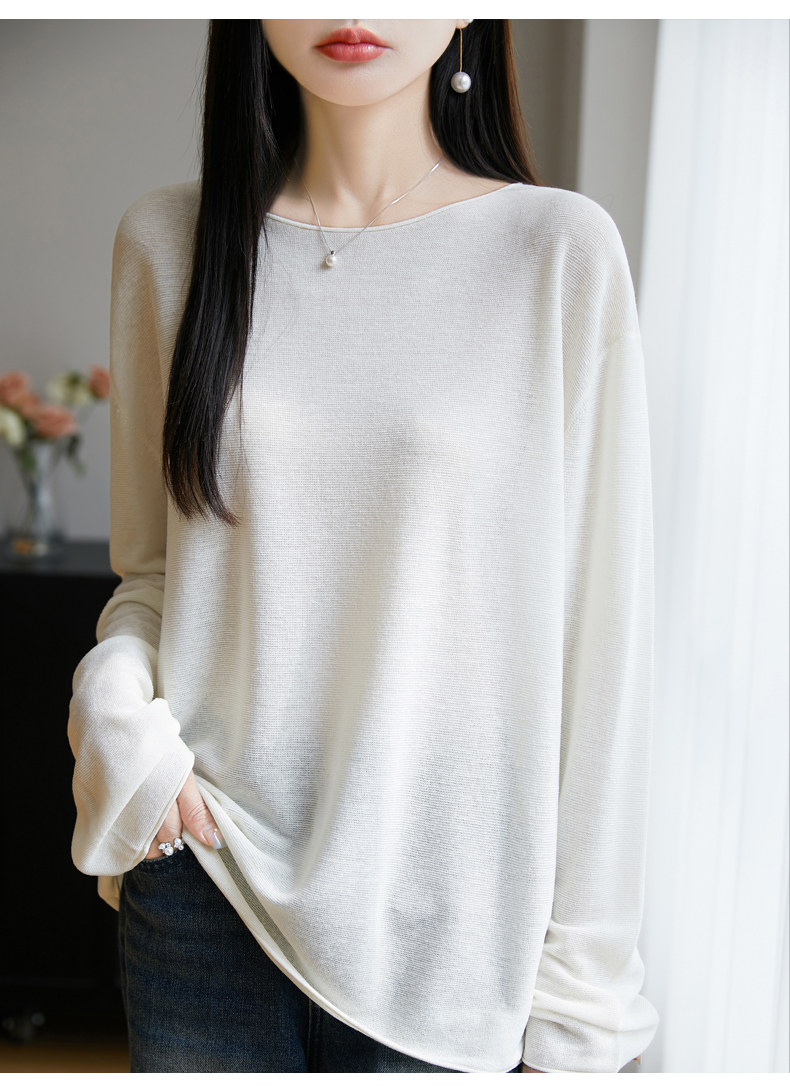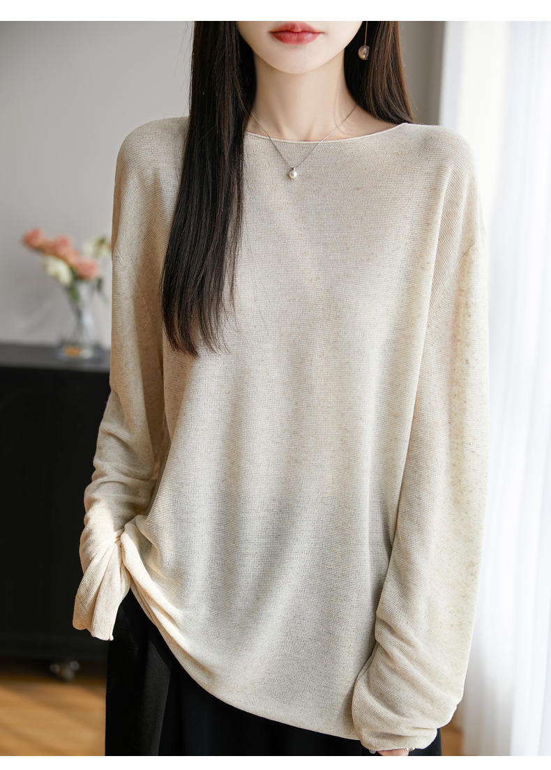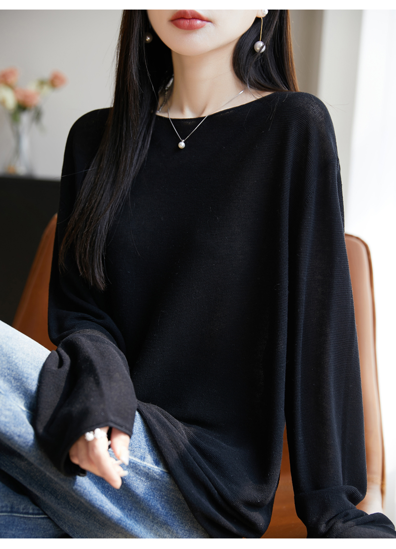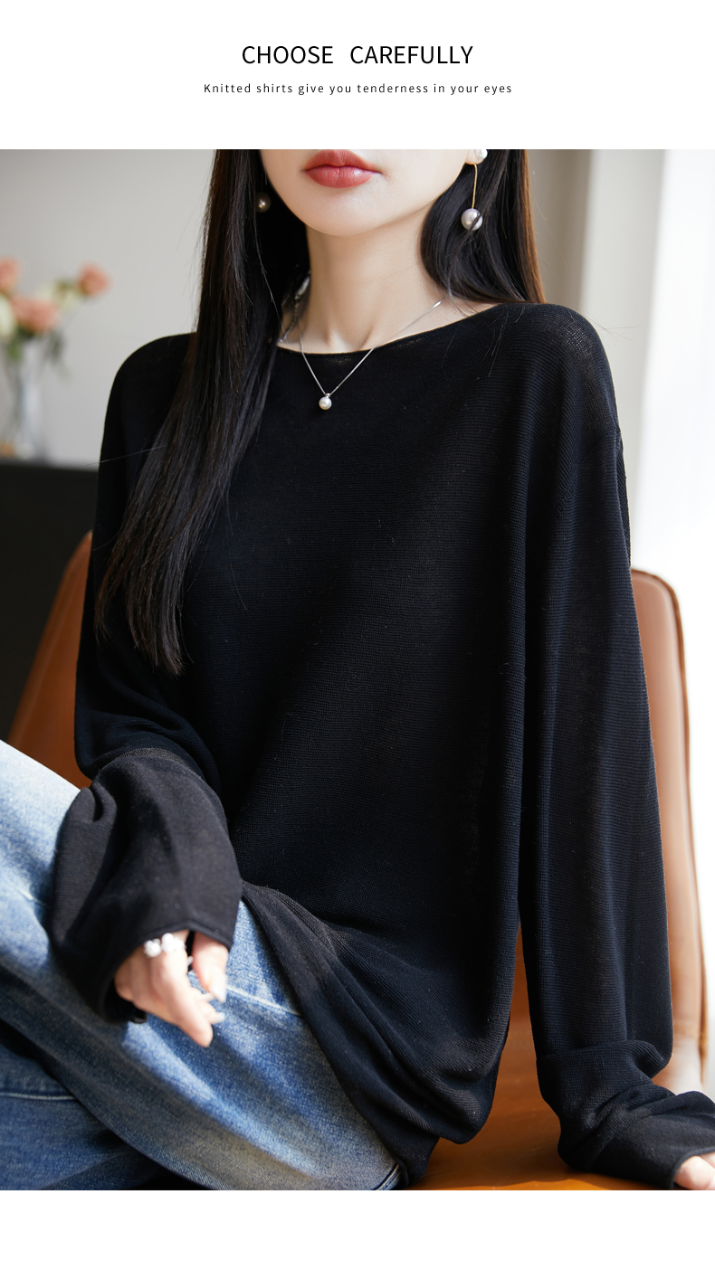 春夏一字領天絲針織打底衫女寬松外穿慵懶風長袖上衣亞麻防曬罩衫