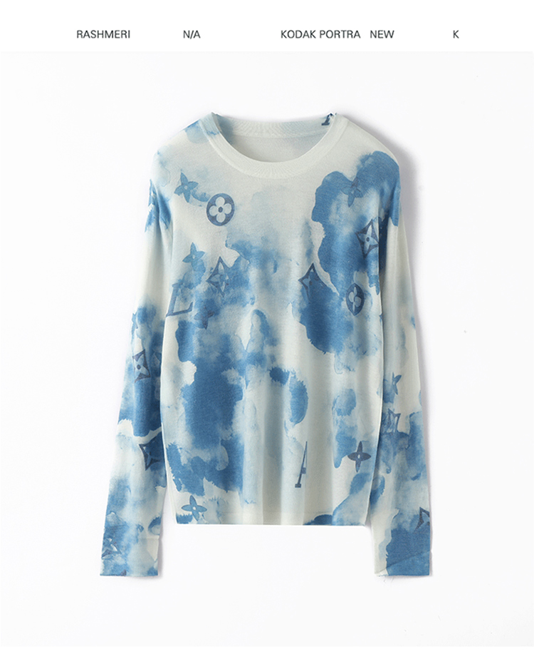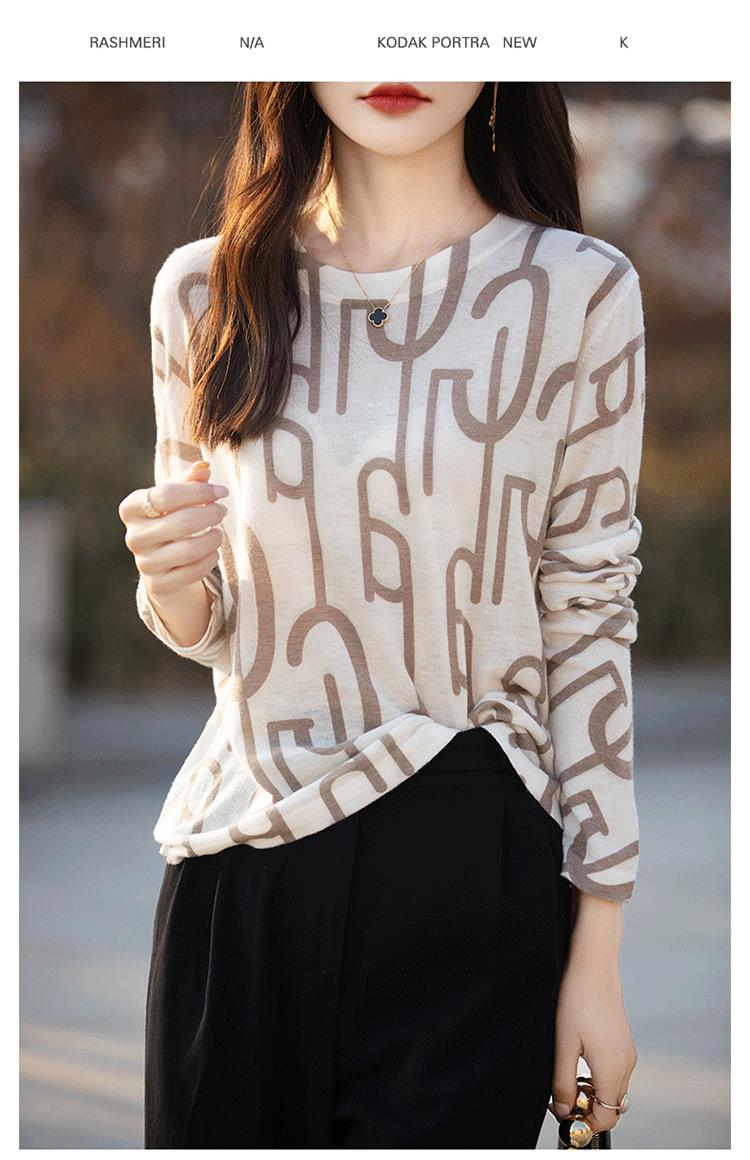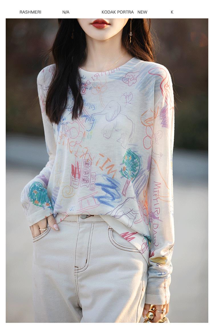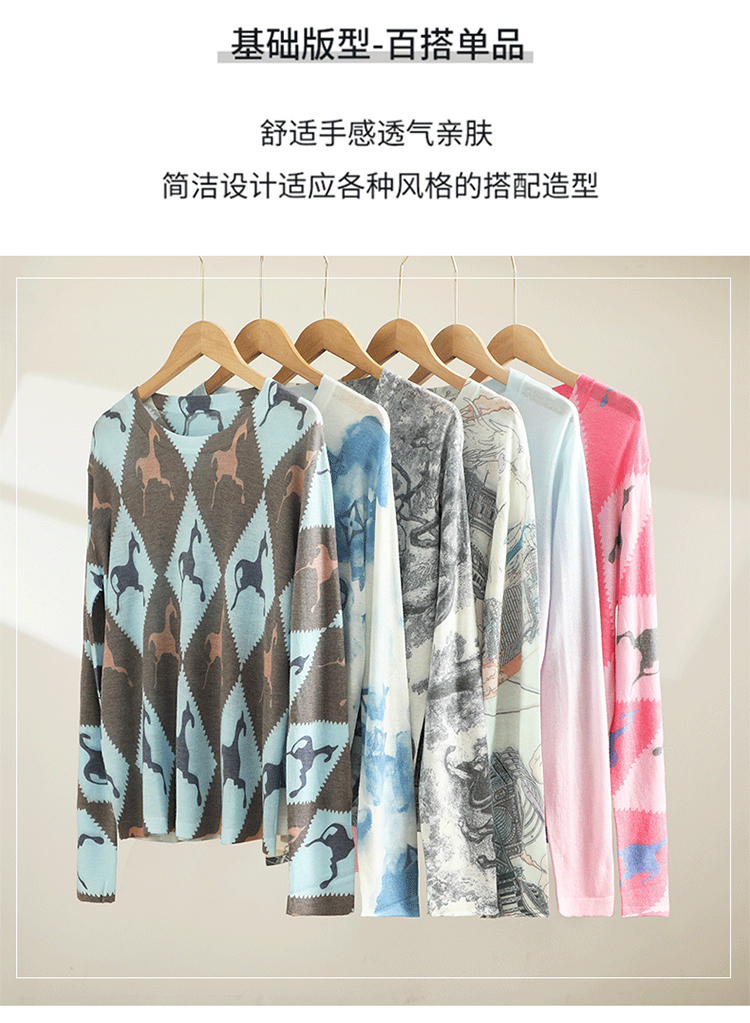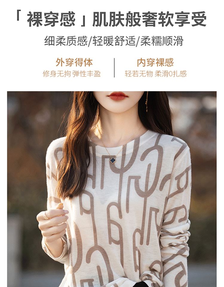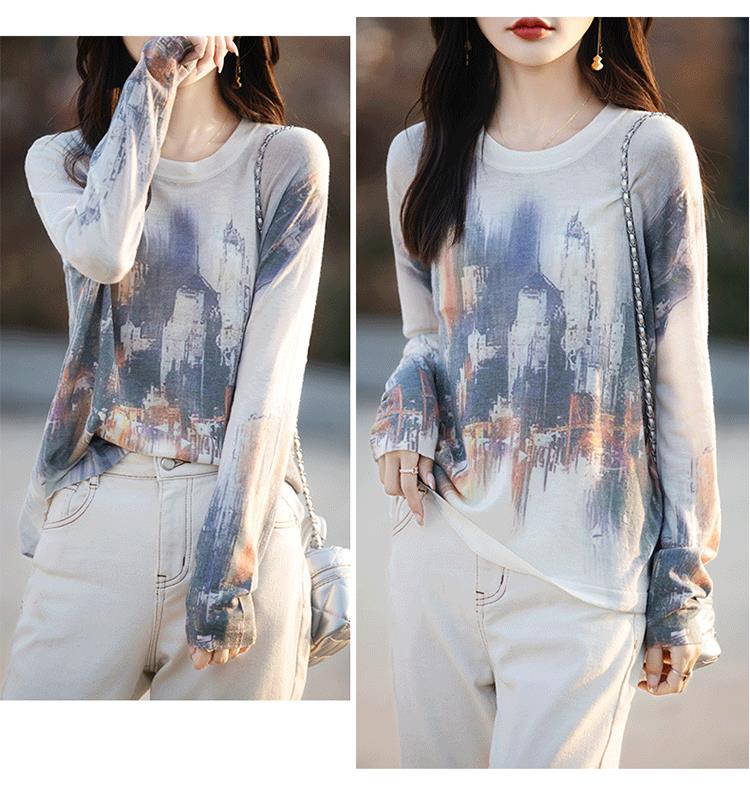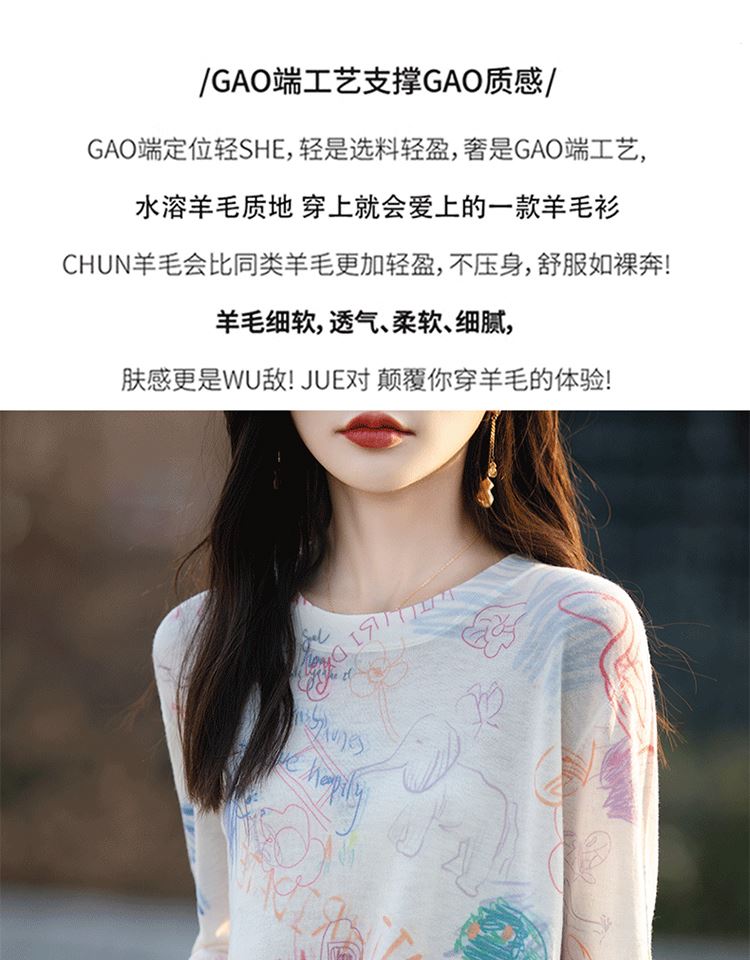 薄如蟬翼精紡超細水溶性羊毛水墨畫圓領寬松薄款打底衫