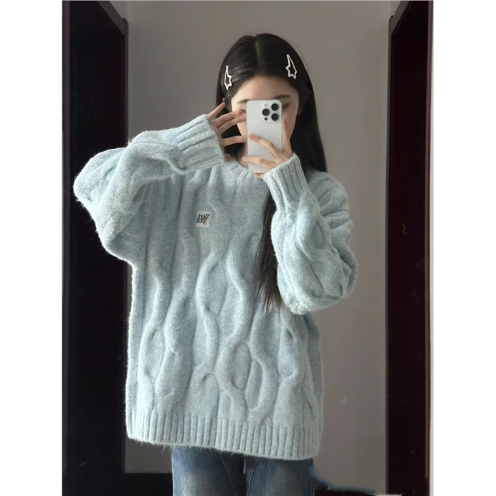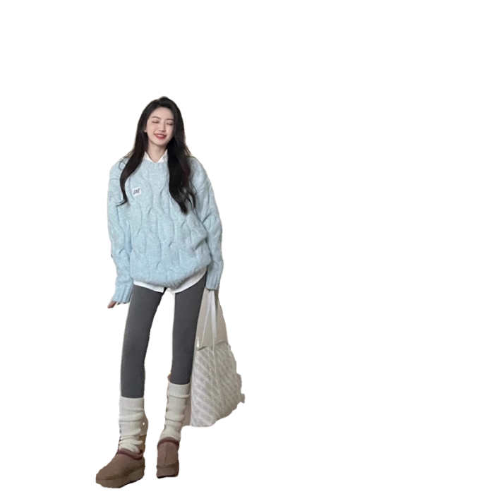 奶藍色麻花毛衣女秋冬針織衫高中初中學生大童女孩加絨加厚打底衫
