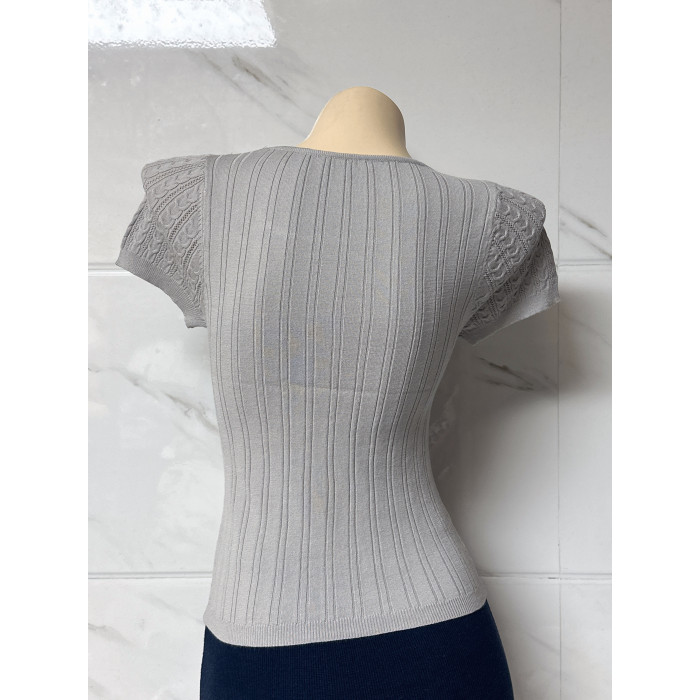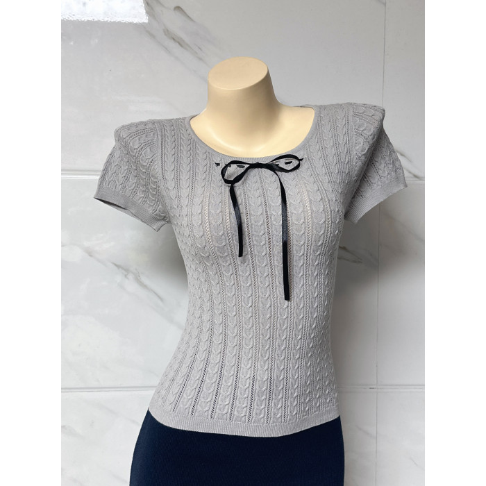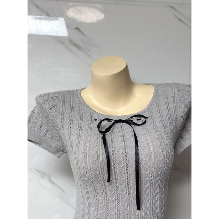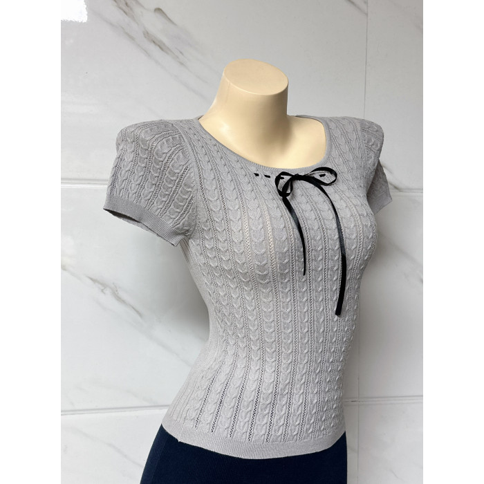 朵朵良品 自製甜美蝴蝶結系帶修身顯瘦絞花短袖針織衫 打底衫