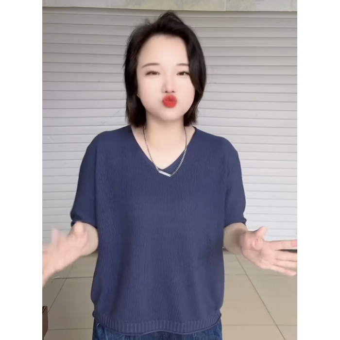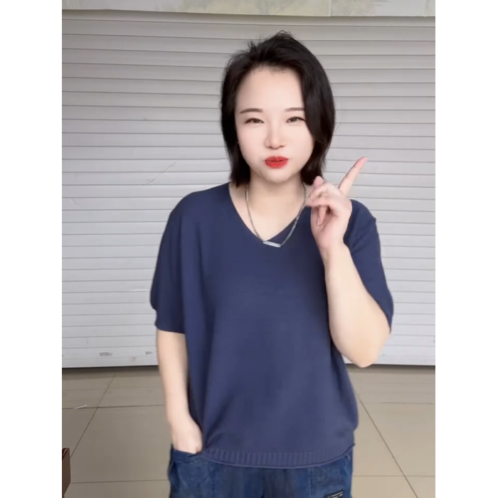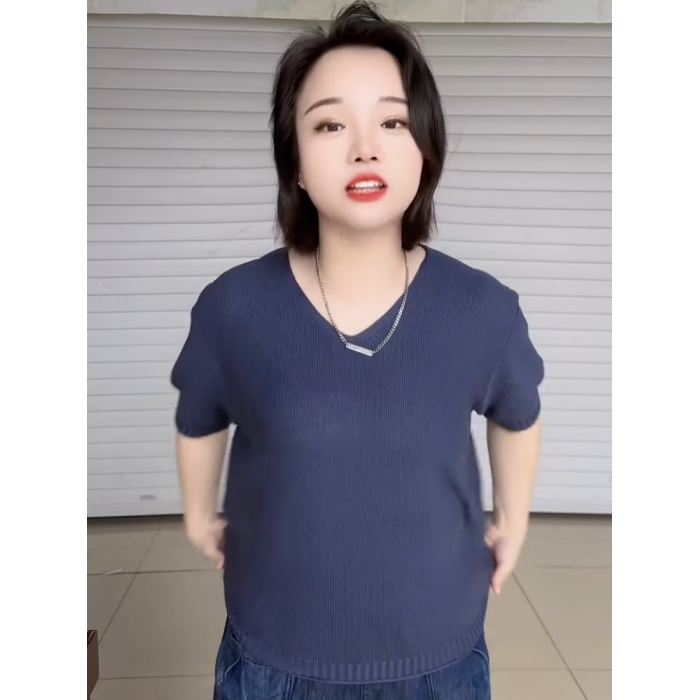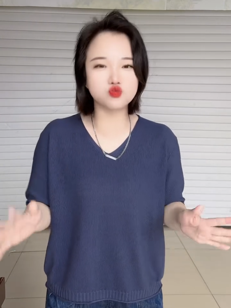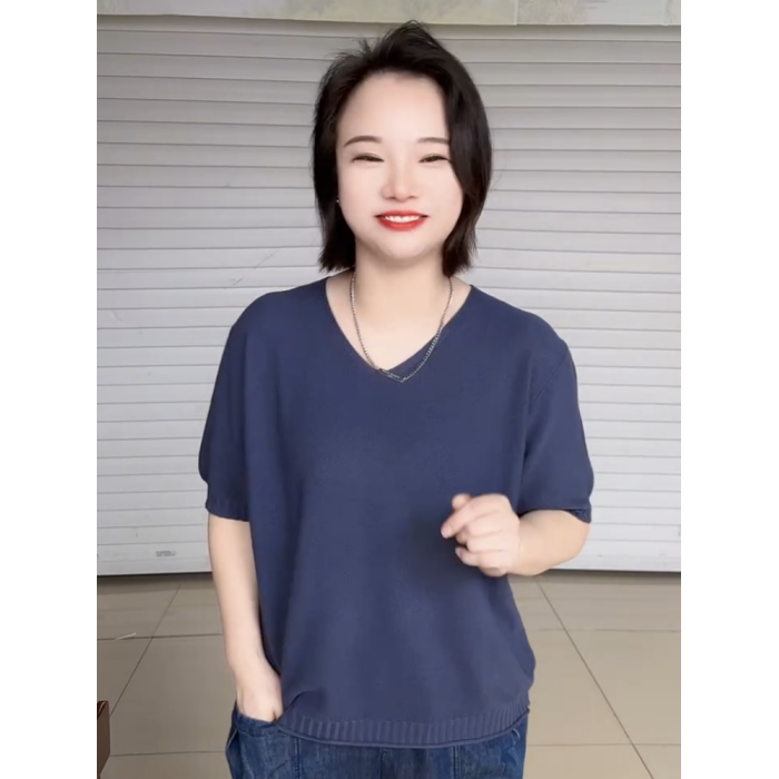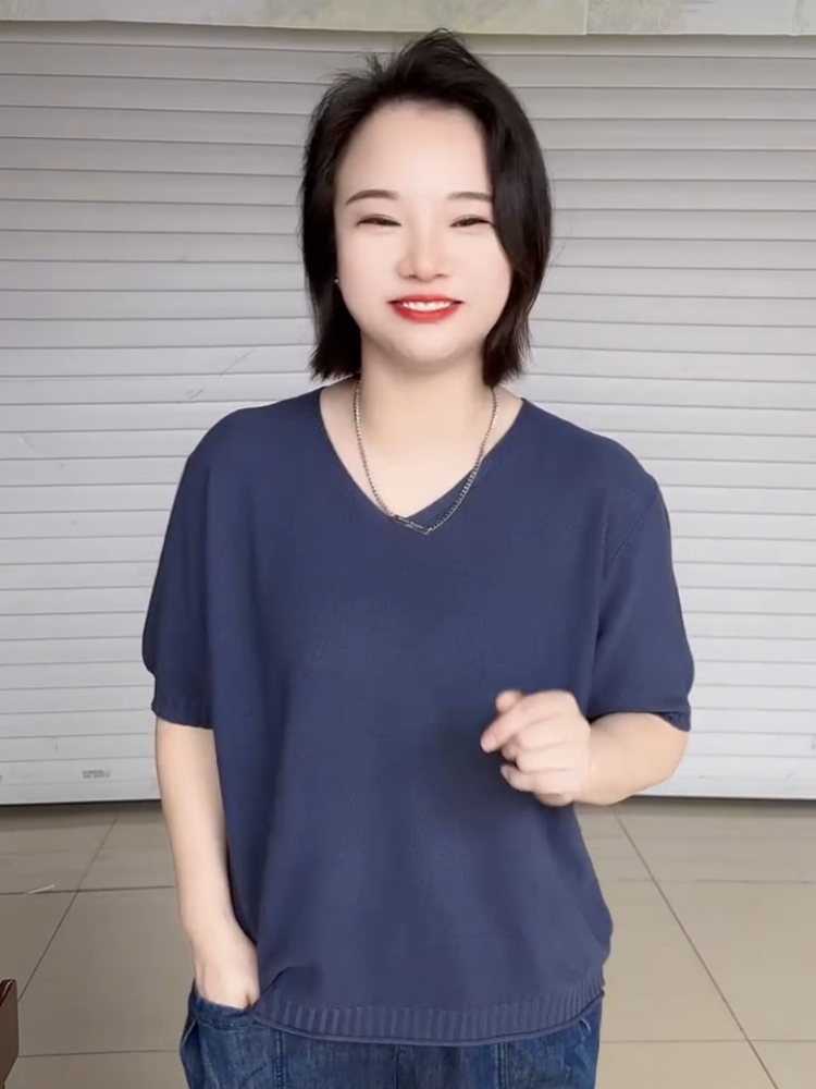 2025年夏季V領短袖針織衫女韓版大碼寬松短袖打底衫純色套頭上衣
