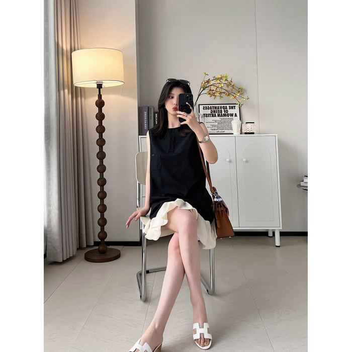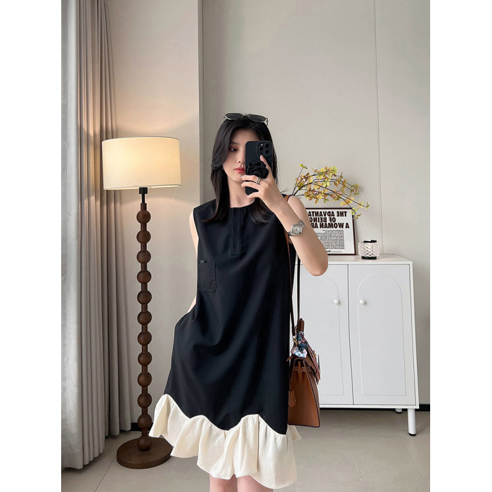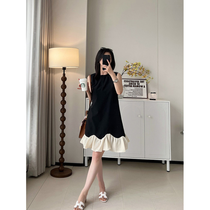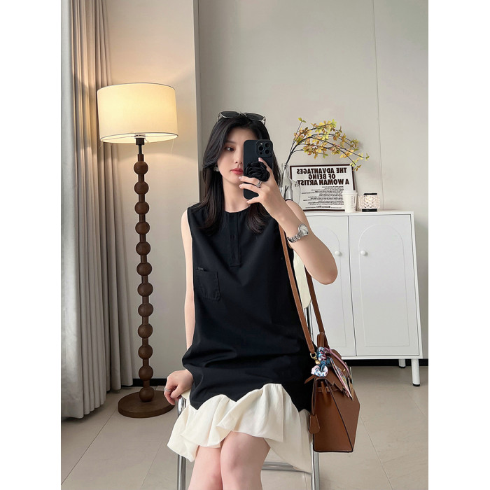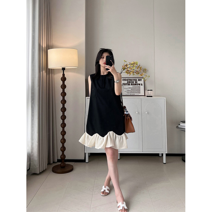 黑色赫本風拼接撞色設計師高級感無袖連衣裙2025夏遮肉顯瘦小黑裙