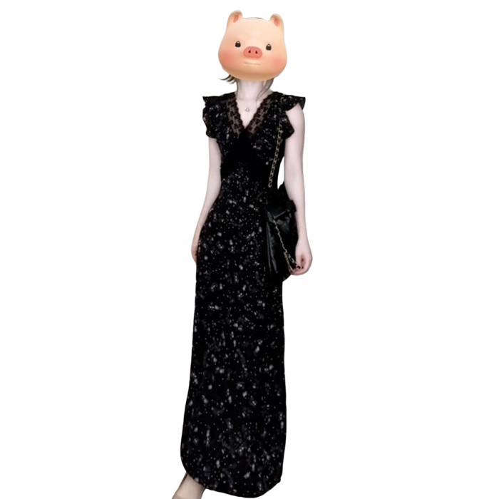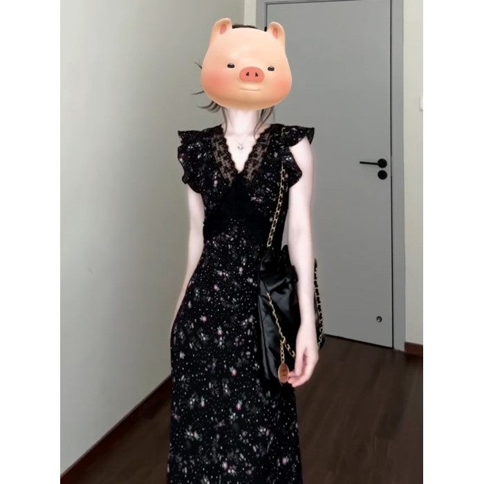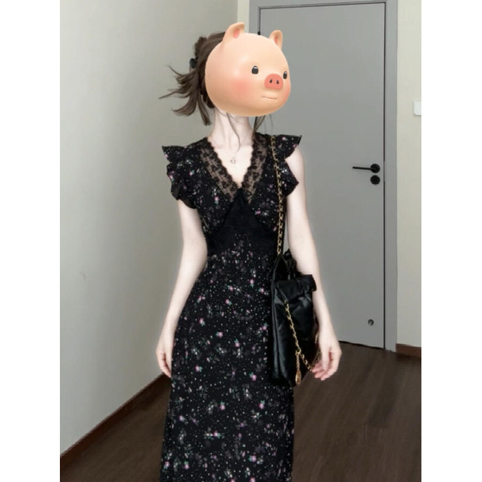 法式小飛袖黑色v領碎花連衣裙子女夏季2025新款夏日絕美蕾絲長裙