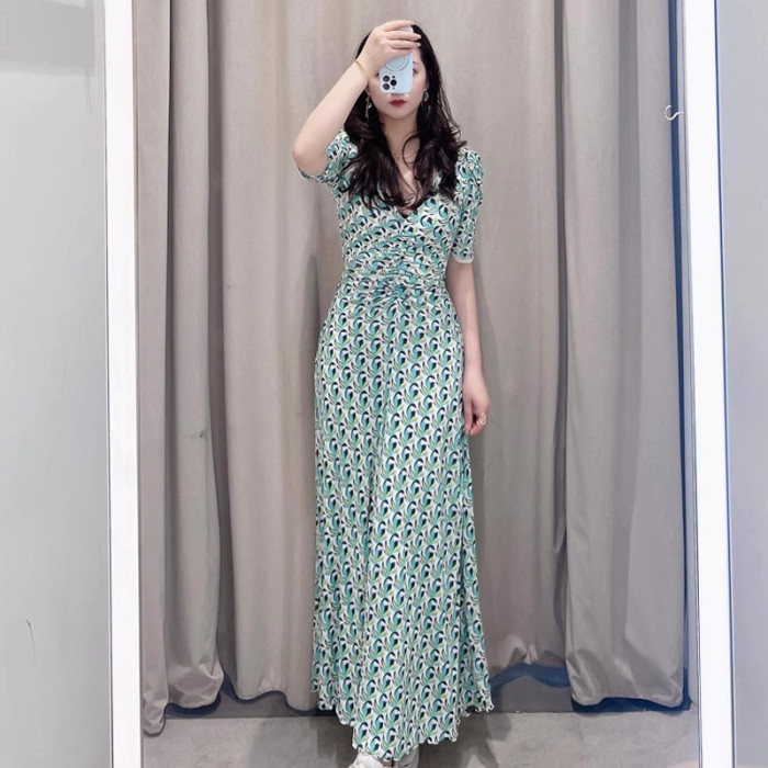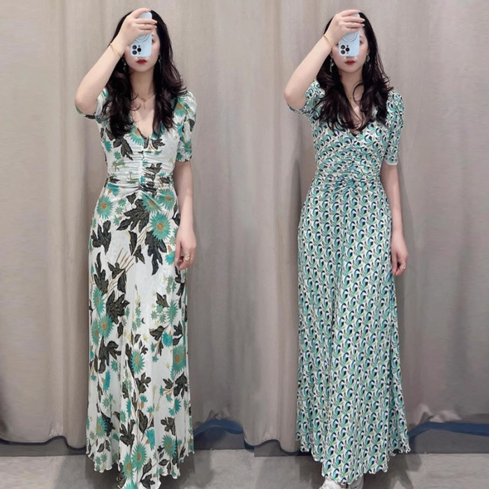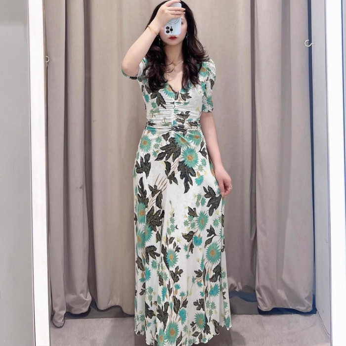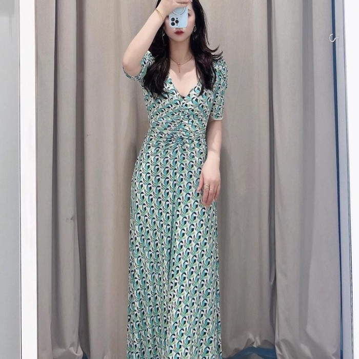PG DVF雙面兩穿網紗領連衣裙清新淡雅綠色花卉修身顯身材長款字大