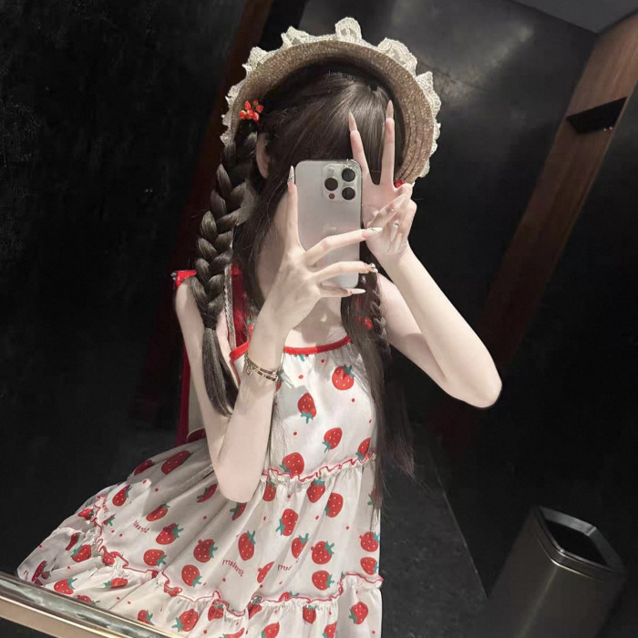 少女甜妹穿搭吊帶小裙子女兒服夏季草莓蛋糕海邊度假連衣裙小個子