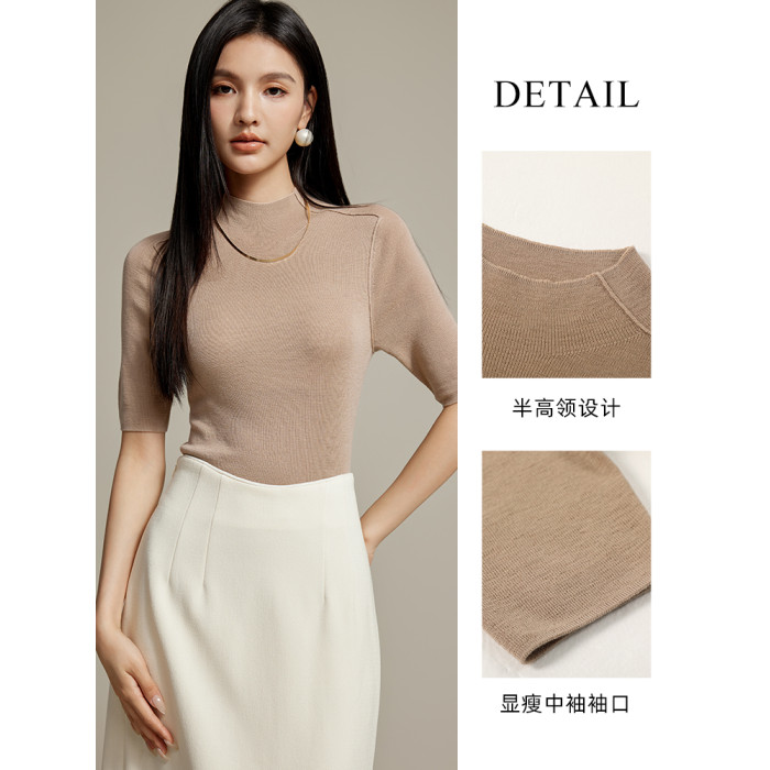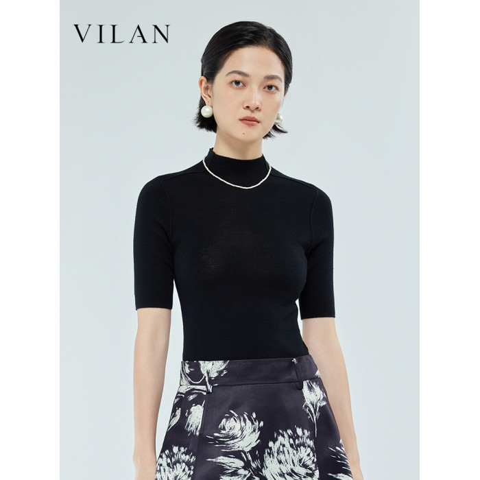 vilan/慧蘭100%綿羊毛短袖針織衫女薄款純色簡約套頭半高領打底衫