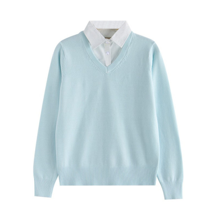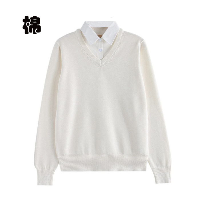純棉假兩件套打底衫襯衫領針織毛衣秋冬V領長袖薄款全棉男工作服