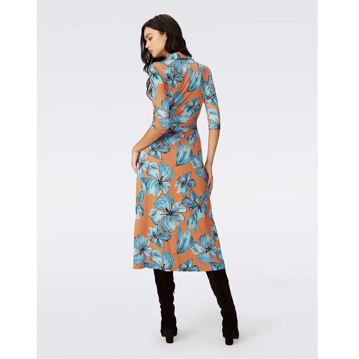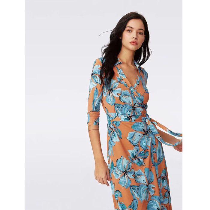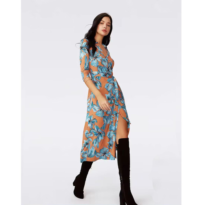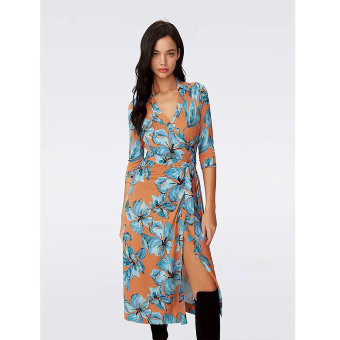 春季新款女裝裹身裙2025翻領橘色夢舞花系帶開叉裙優雅長款連衣裙