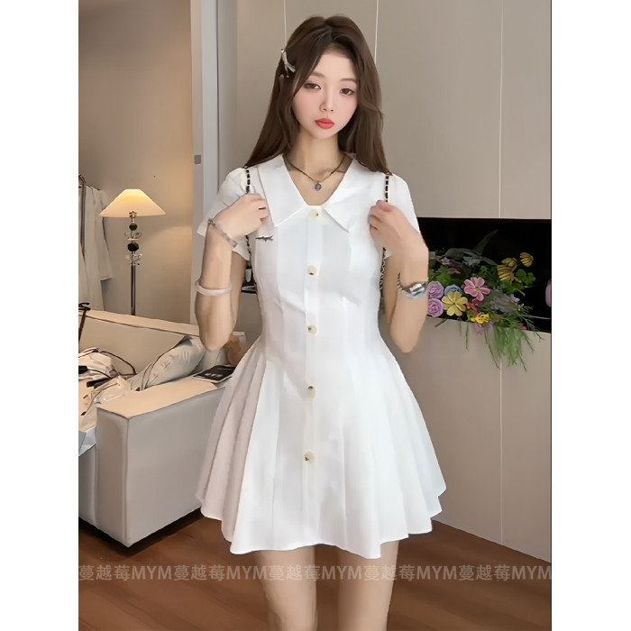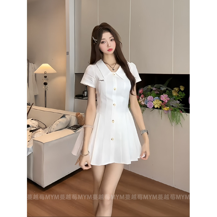韓系學院風polo領白色連衣裙女夏季少女感襯衫裙小衆收腰百褶裙子