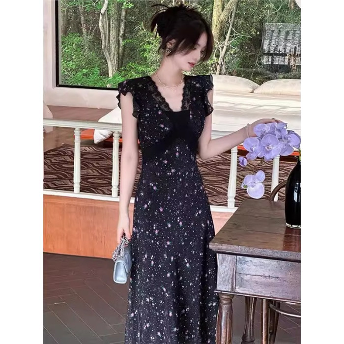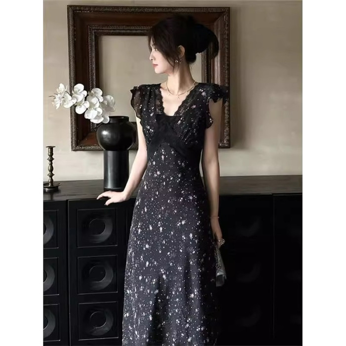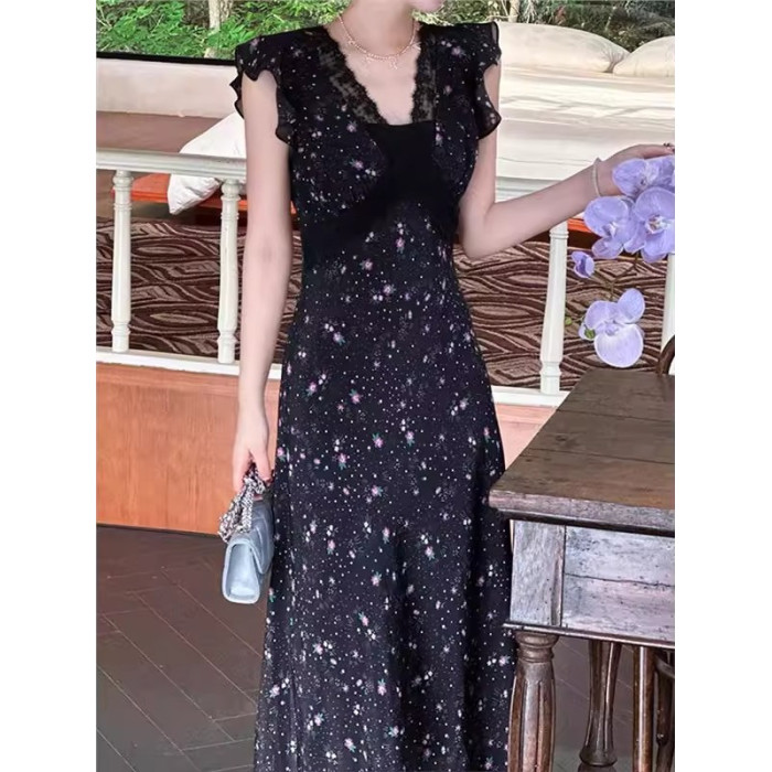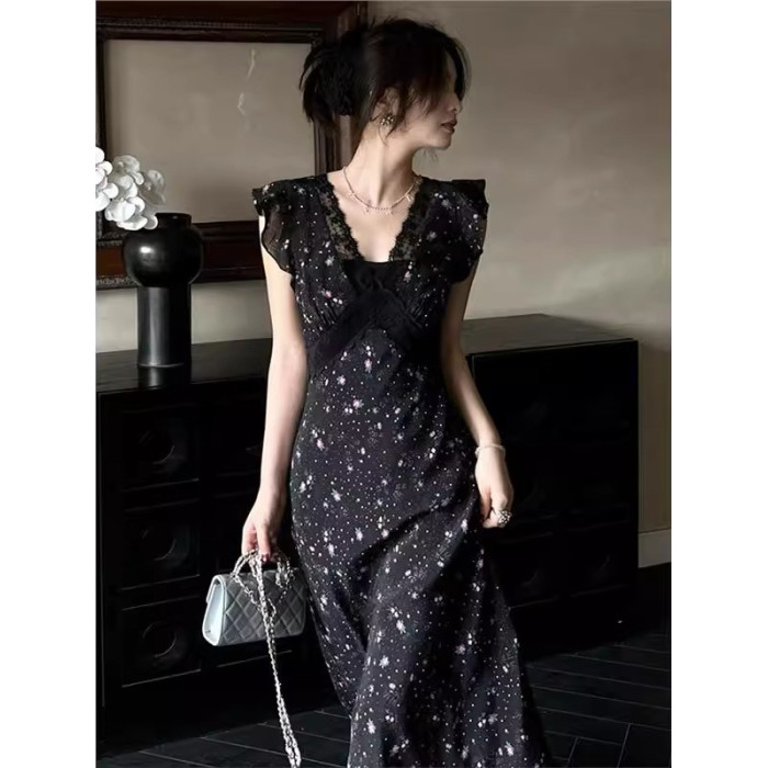 歐洲站夏季女裝2025新款法式復古黑色碎花長裙獨特漂亮掐腰連衣裙