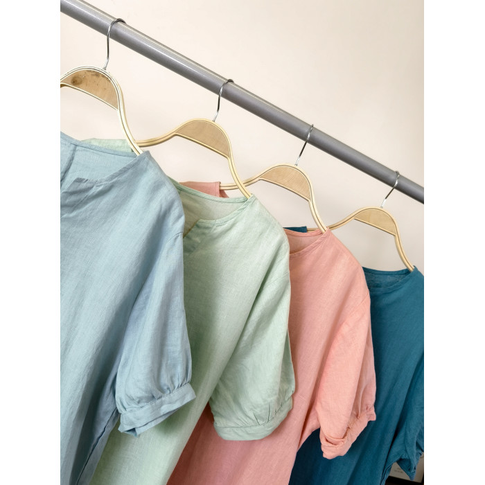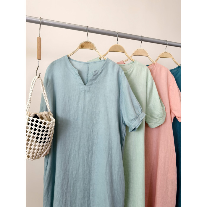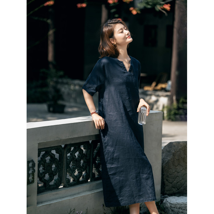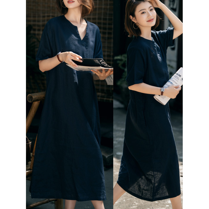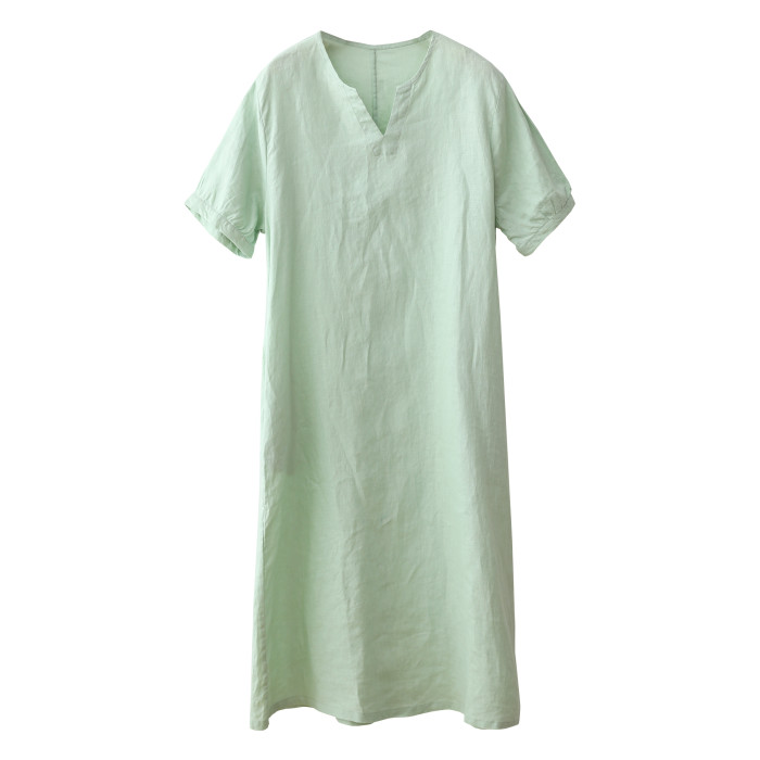 小耳出品 芨簡の神 酵洗100.%亞麻/內包縫工藝 V領短袖連衣裙女