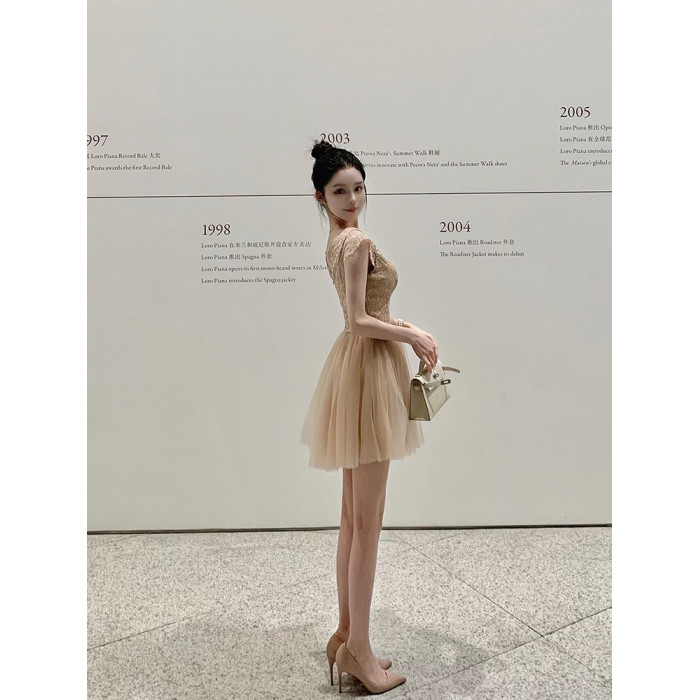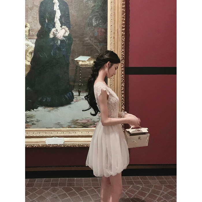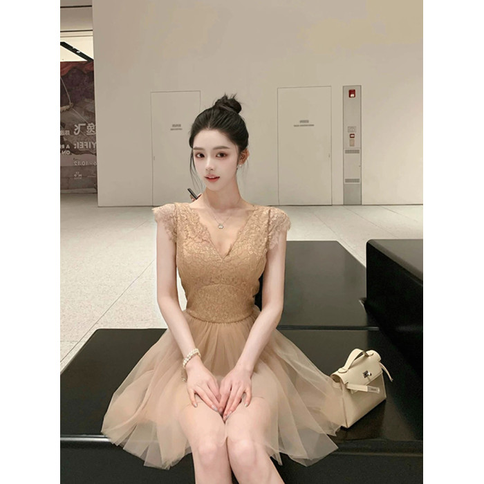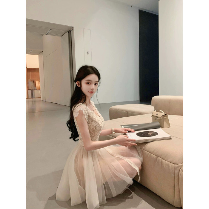 法式蕾絲拼接網紗設計連衣裙女夏季新款高級感氣質收腰顯瘦短裙子