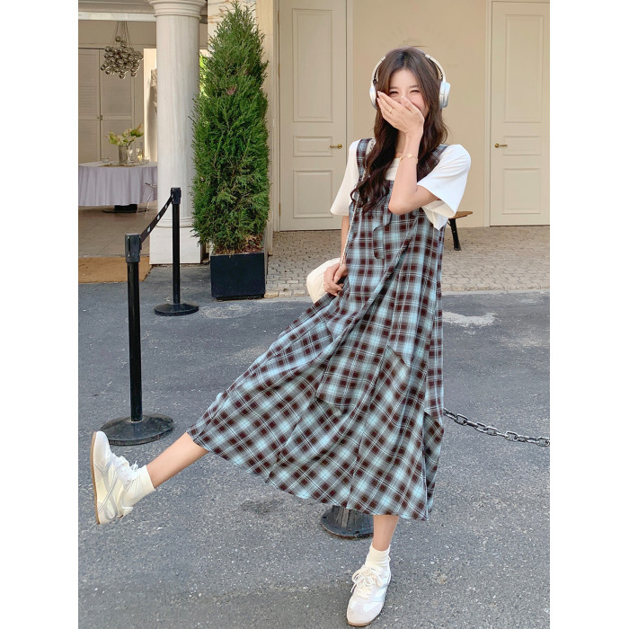 假兩件格紋拼接連衣裙女2025年夏季新款韓系流行超火小個子T恤裙