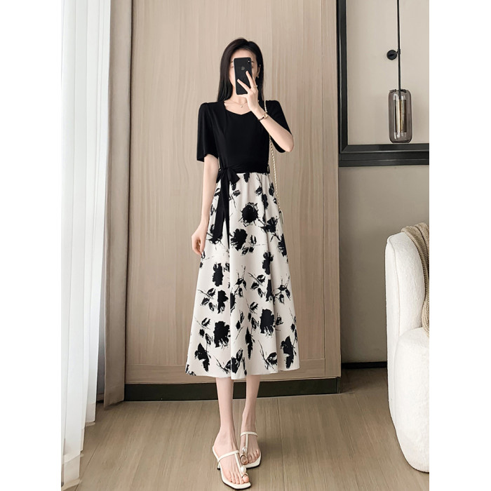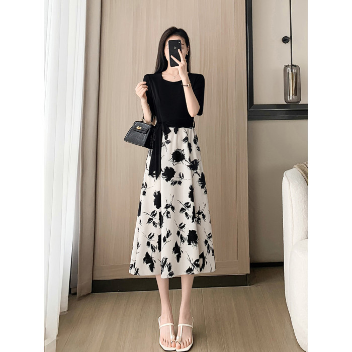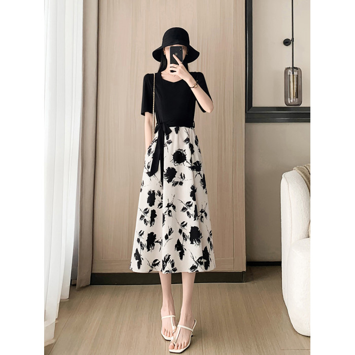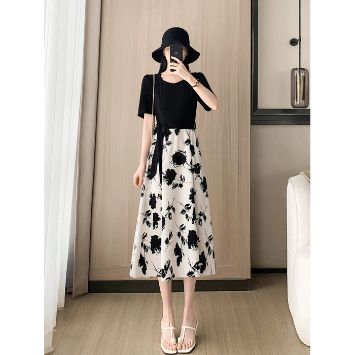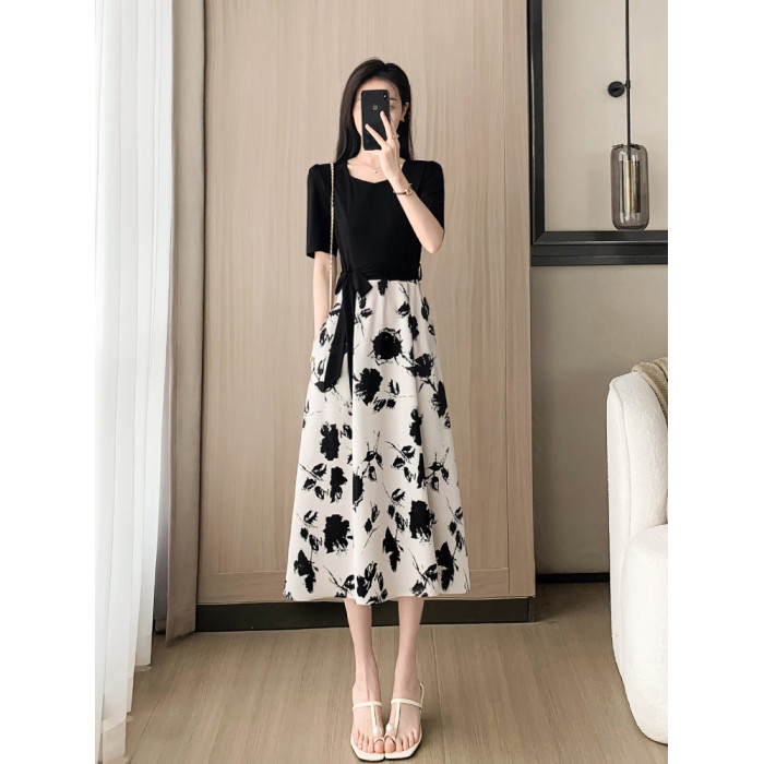 高級感赫本風黑色碎花連衣裙子夏女2025新款收腰顯瘦氣質a字裙子
