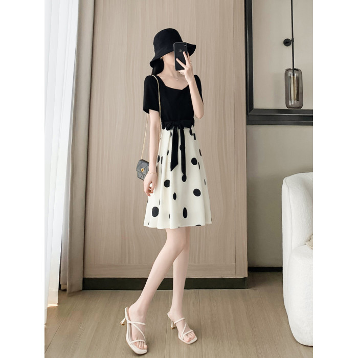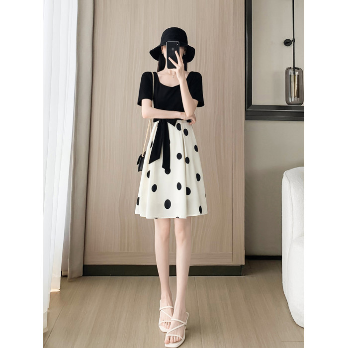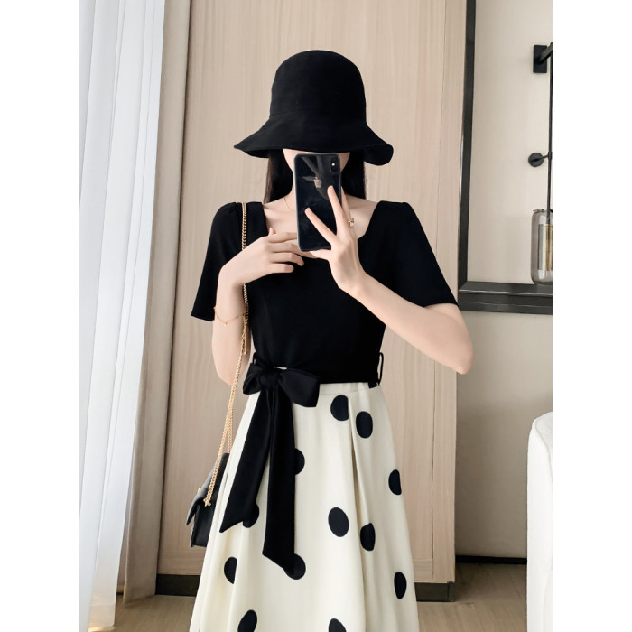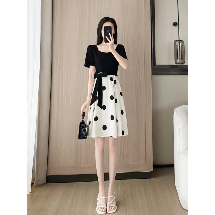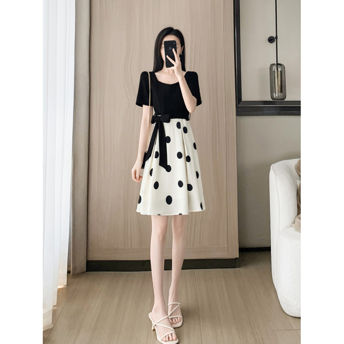 赫本風黑色連衣裙夏女2025新款收腰顯瘦氣質修身波點a字裙小個子