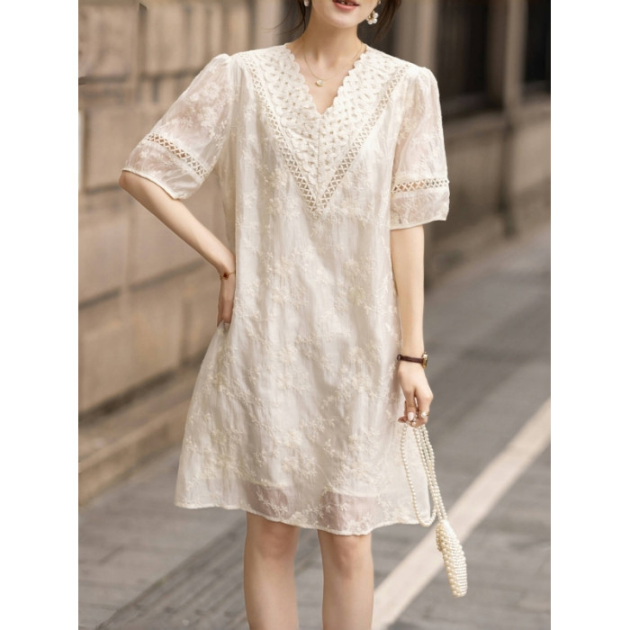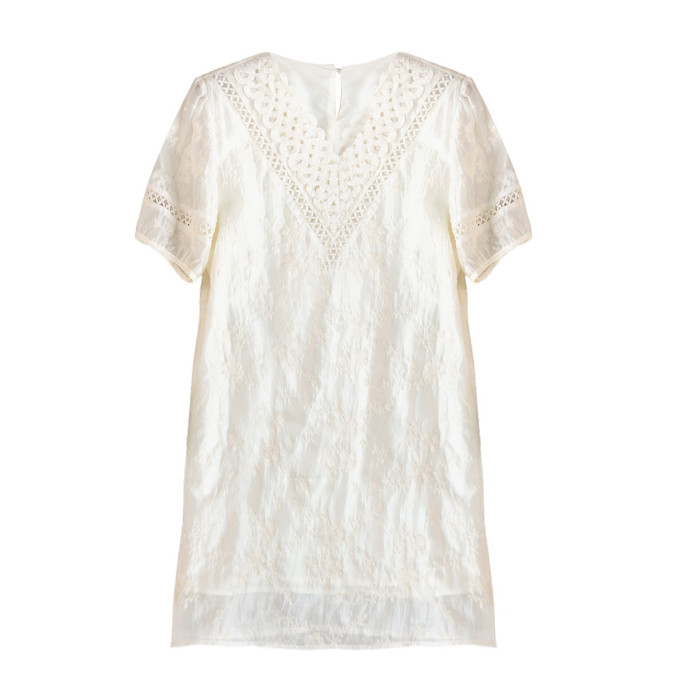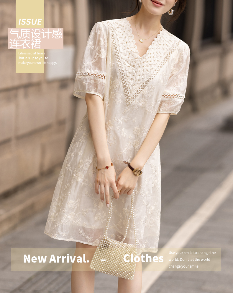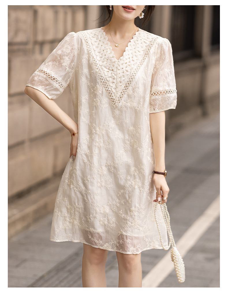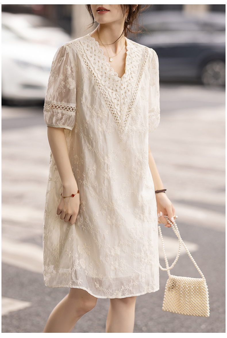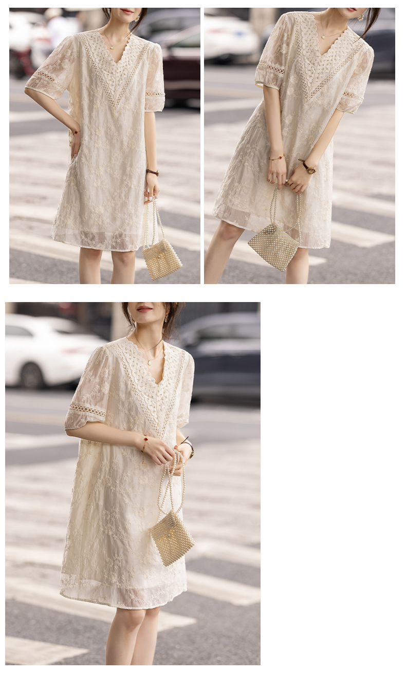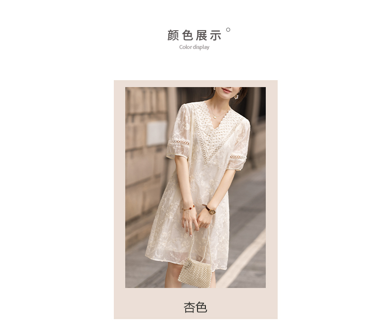 九月陌墨杏色提花刺綉v領短袖連衣裙夏新款時尚蕾絲拼接顯瘦裙子