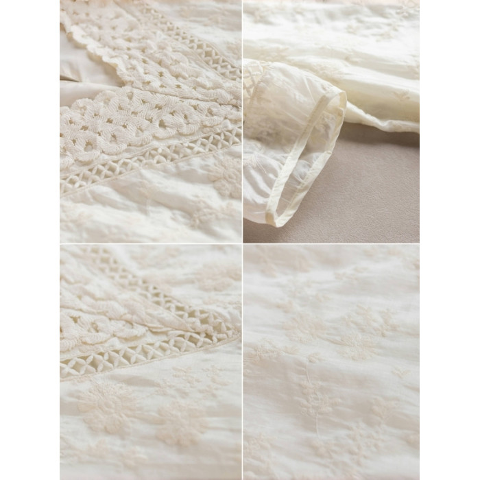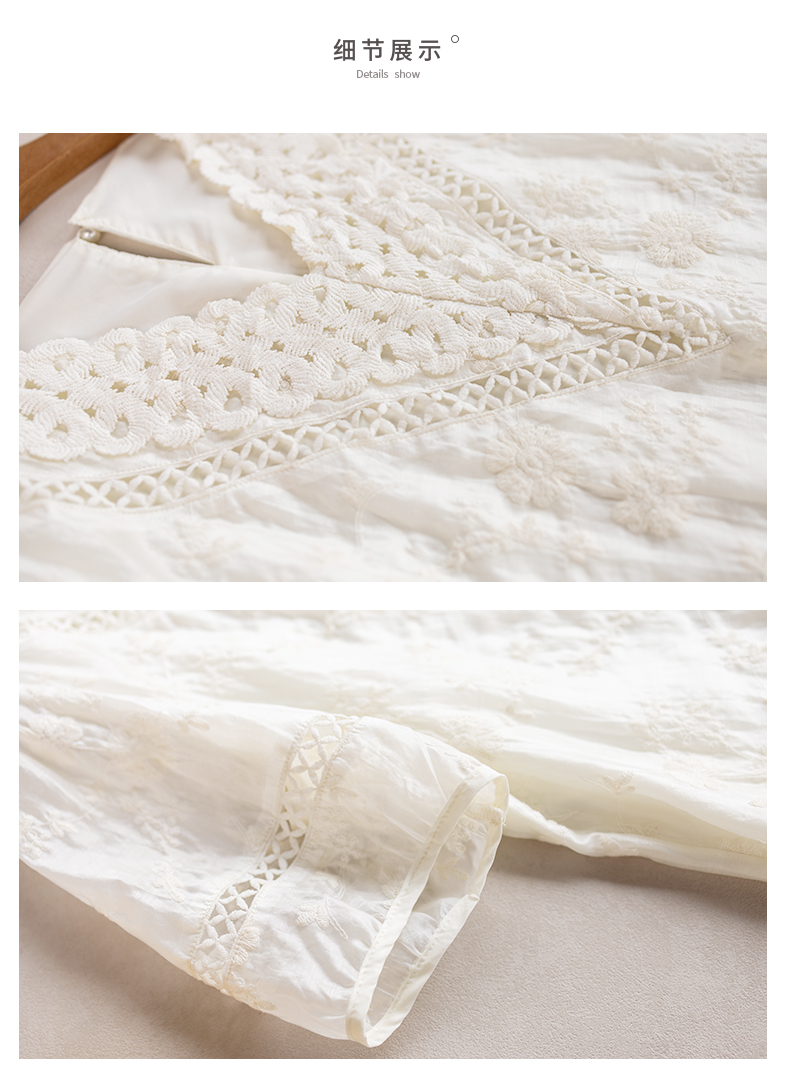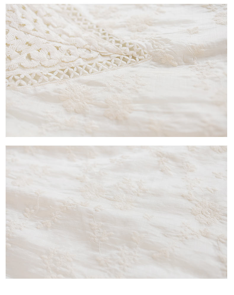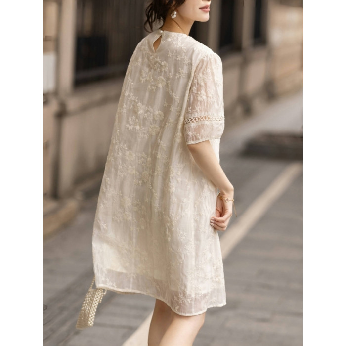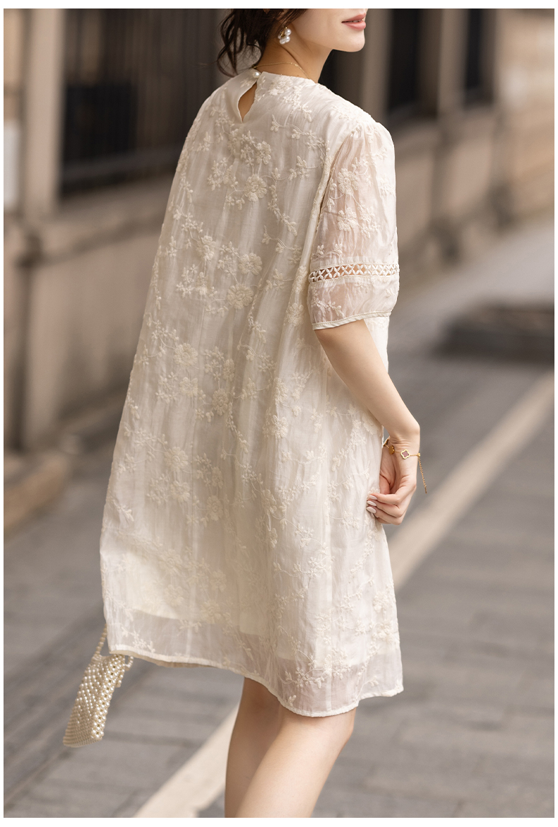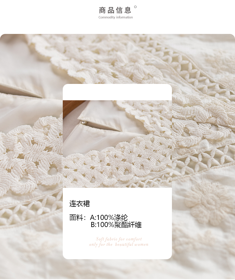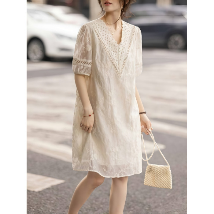 九月陌墨杏色提花刺綉v領短袖連衣裙夏新款時尚蕾絲拼接顯瘦裙子