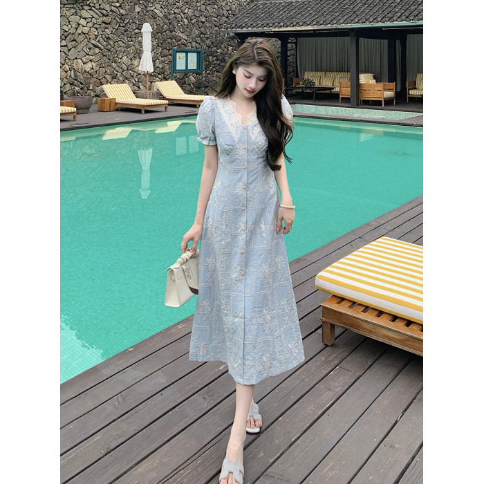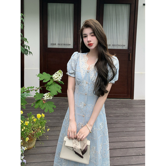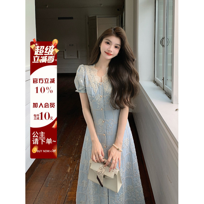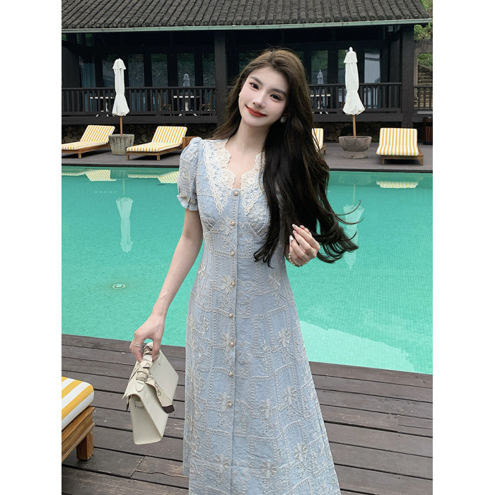 AM NANA法式氣質短袖連衣裙夏輕奢刺綉顯瘦仙女裙小個子V領長裙子