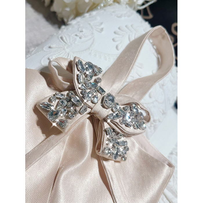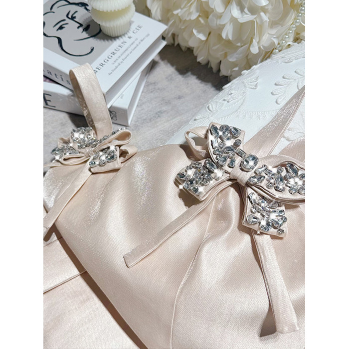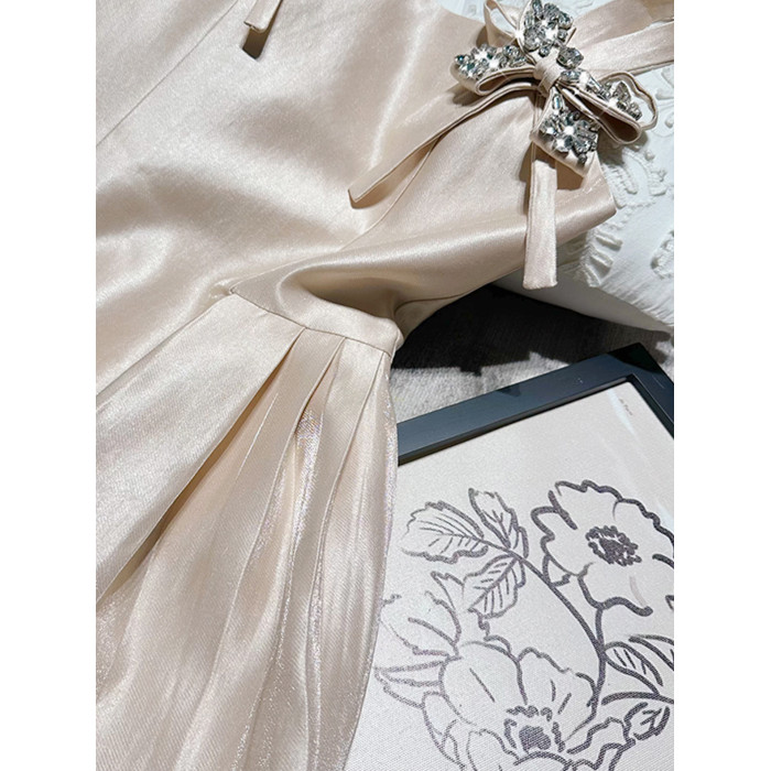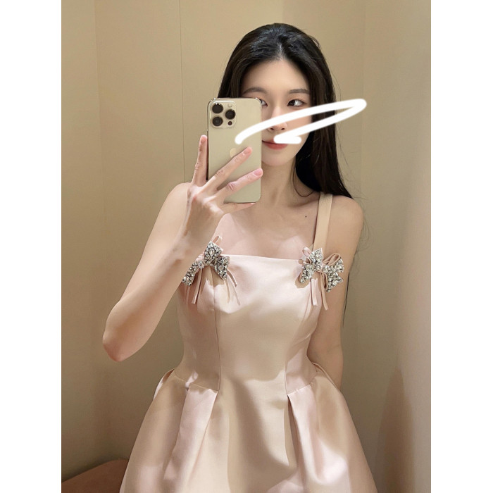 FFmiss◆小香風鑲鑽蝴蝶結緞面收腰連衣裙女夏重工釘珠吊帶蓬蓬裙