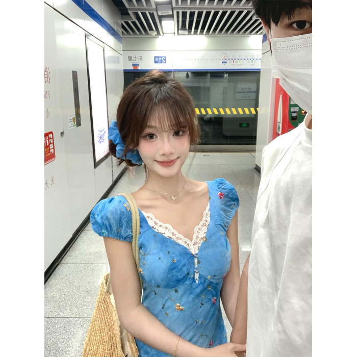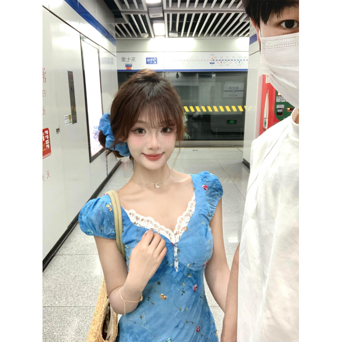 裙子女夏季新款法式多巴胺流行漂亮穿搭藍色V領泡泡袖碎花連衣裙
