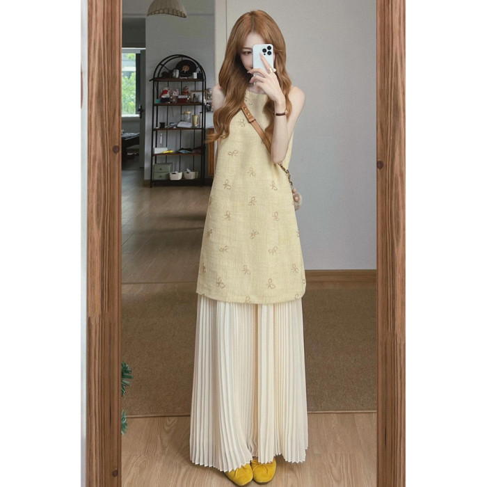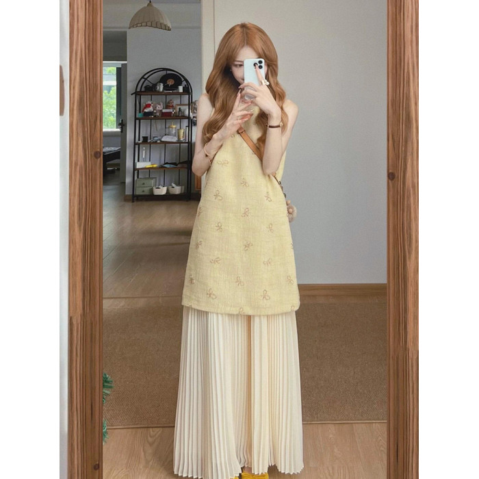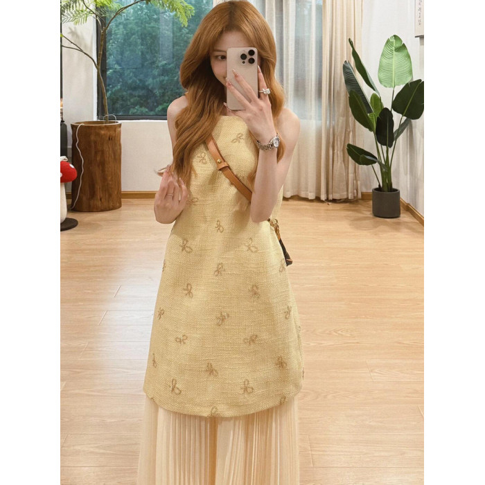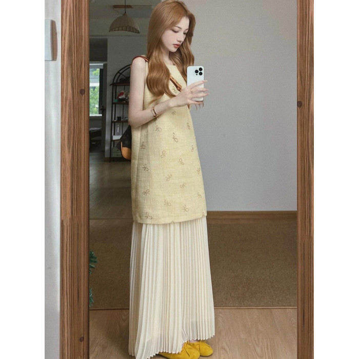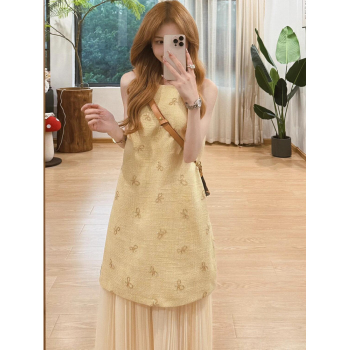 千金風重工蝴蝶結串珠假兩件連衣裙女夏miu系小香風百褶拼接長裙