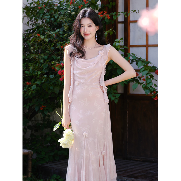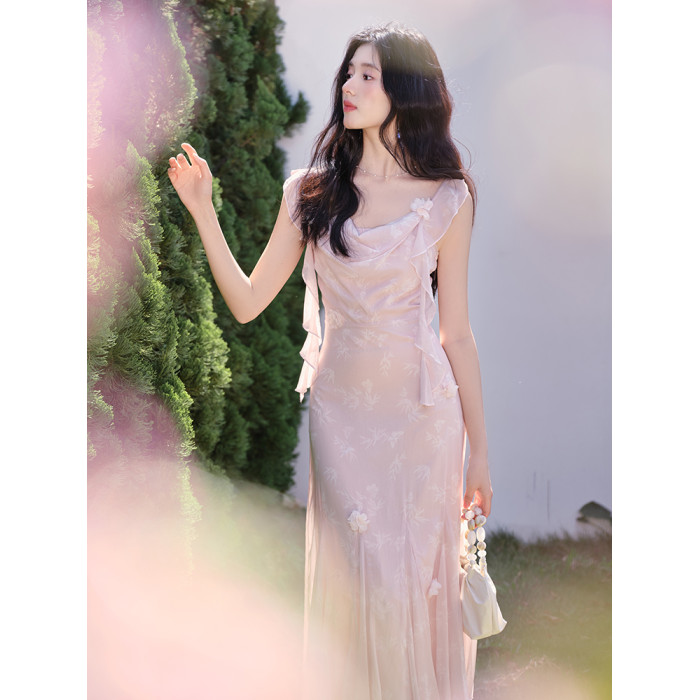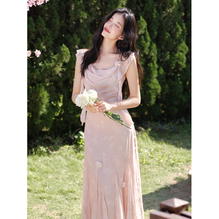 釣系穿搭法式蕩領露背魚尾吊帶度假裙溫柔風粉色竹葉印花連衣裙夏
