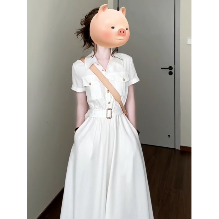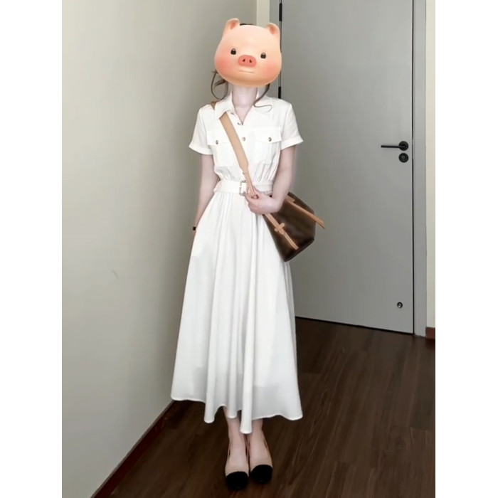 韓系polo領白色短袖襯衫連衣裙子女裝夏季2025新款小個子收腰長裙