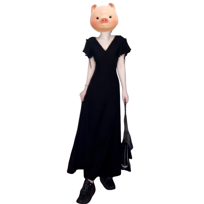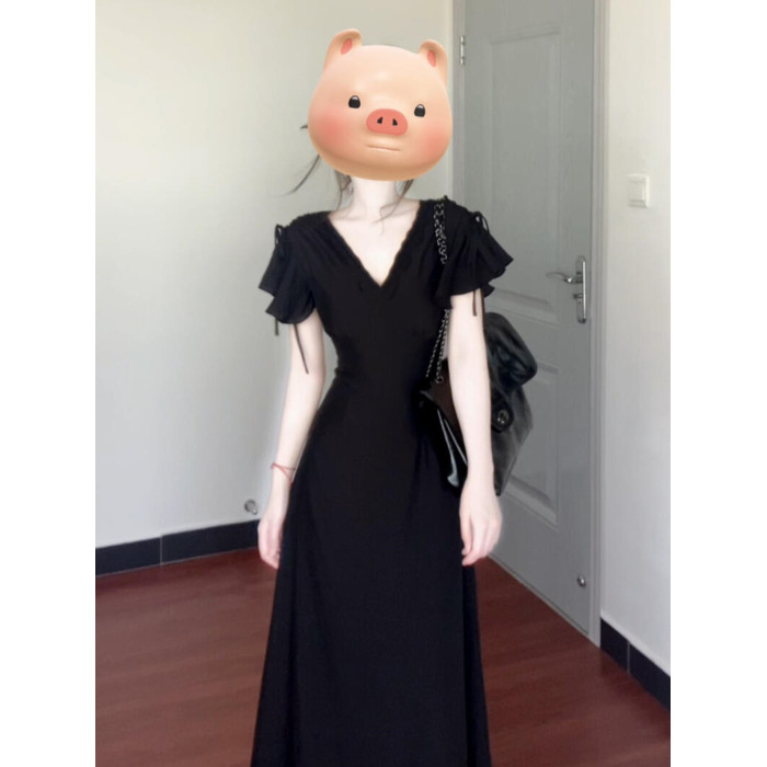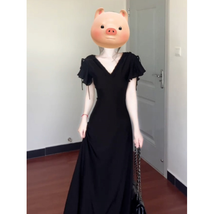 法式小飛袖黑色v領連衣裙子女夏季2025新款今年流行漂亮收腰長裙