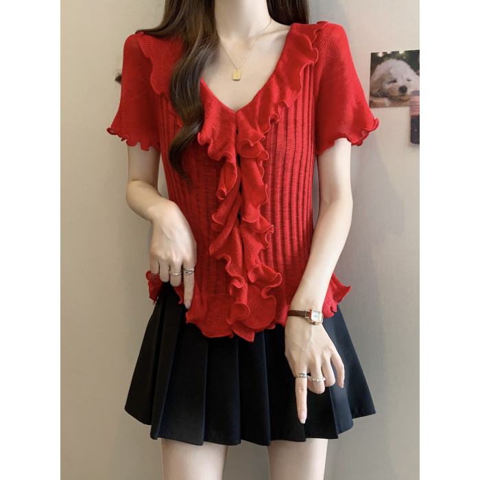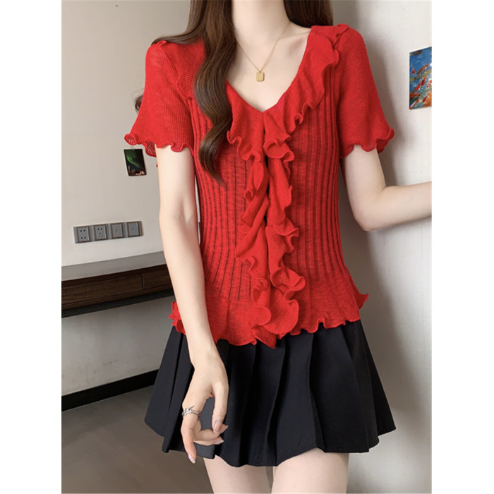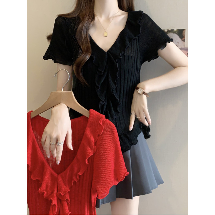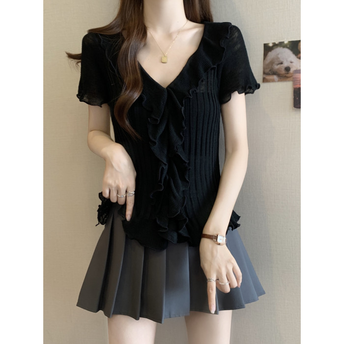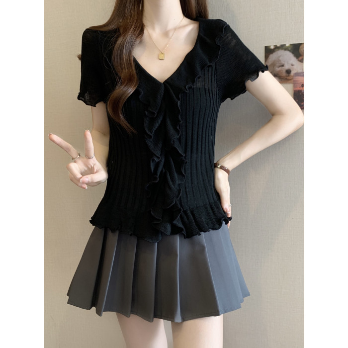 胖mm設計感顯瘦v領木耳邊短袖正肩上衣女夏季洋氣減齡百搭打底衫